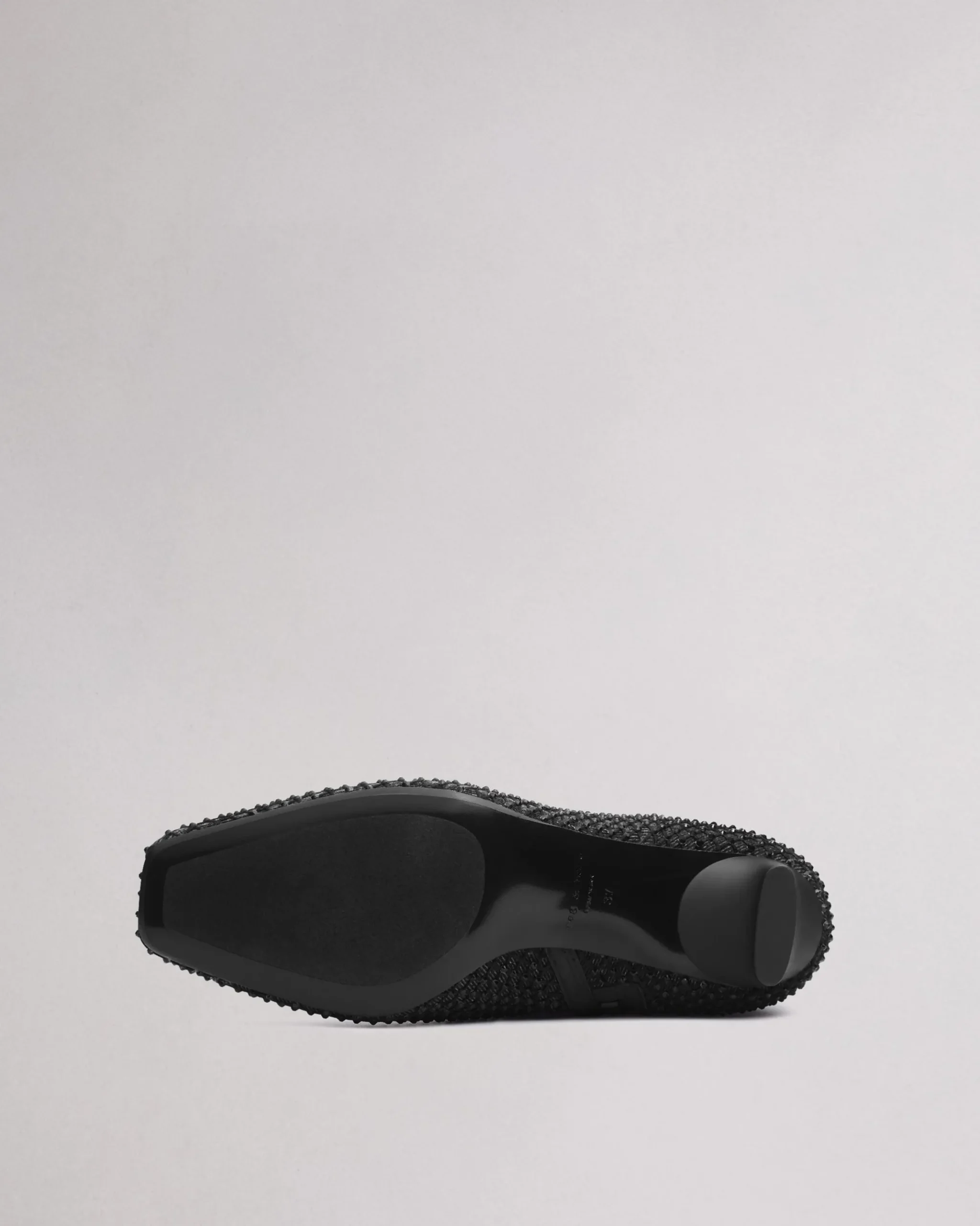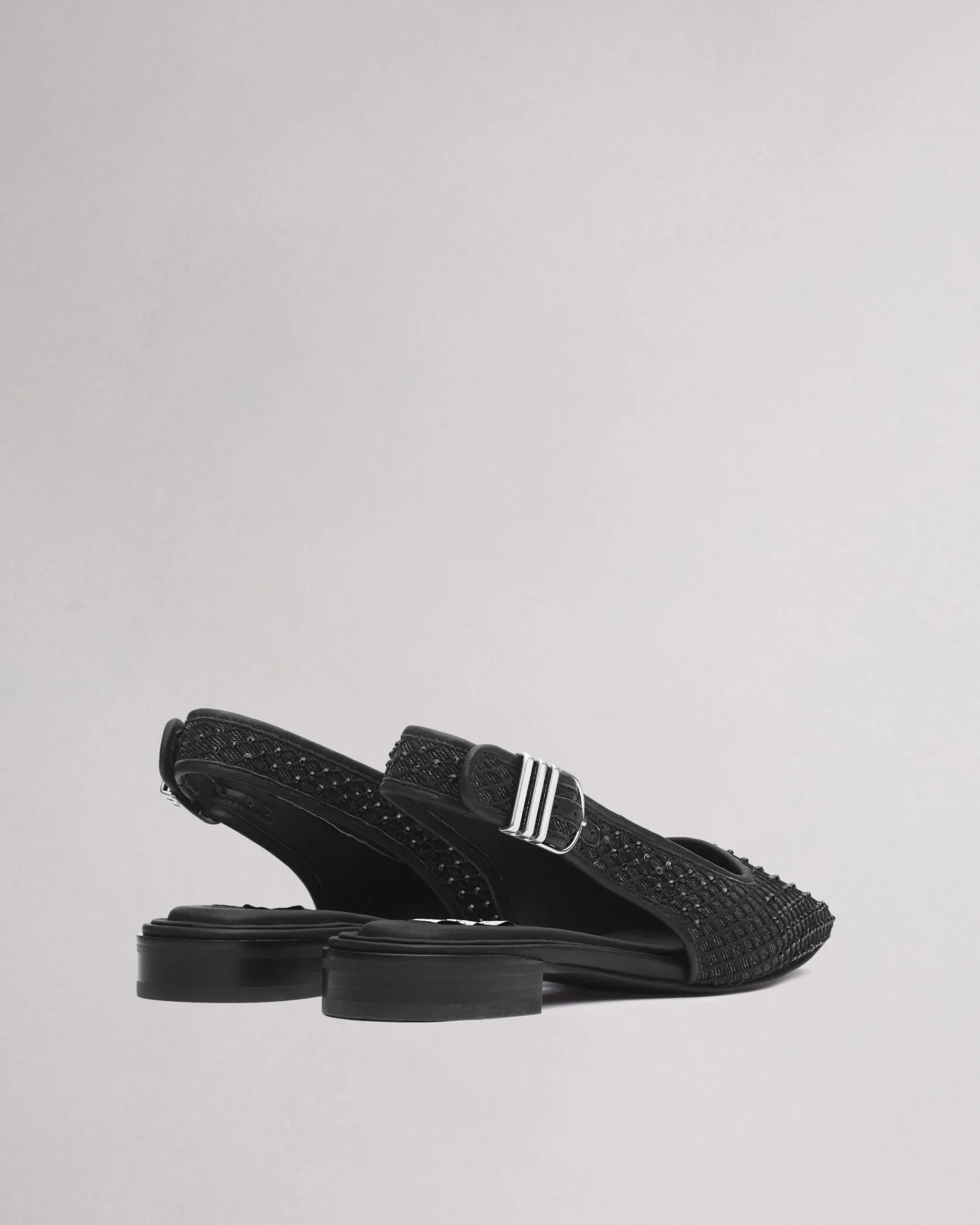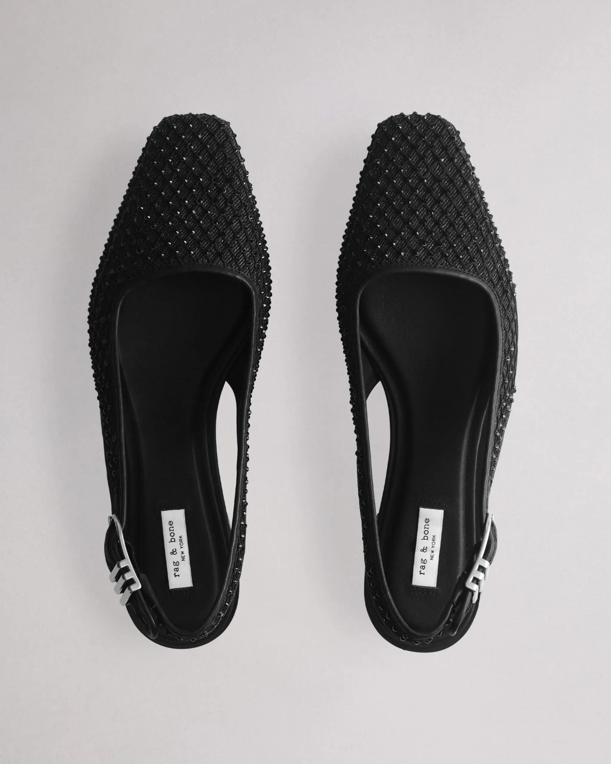 The Astra Slingback. A rag & bone favorite in a new context. This flat retains its quintessential tapered square toe, now with a slingback. In denim overlayed with diamante mesh. Crafted with dual-density antimicrobial foam insoles: OrthoLite® Lazy-Hybrid™ for custom-fit comfort, and OrthoLite® Recycled for stability and support.