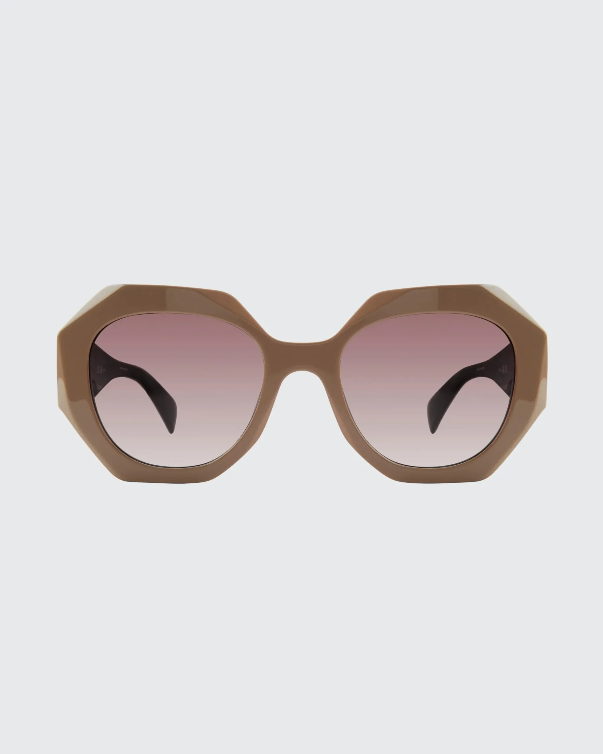 A rectangular geometrical eye silhouette with an acetate frame and 100% UV protection.