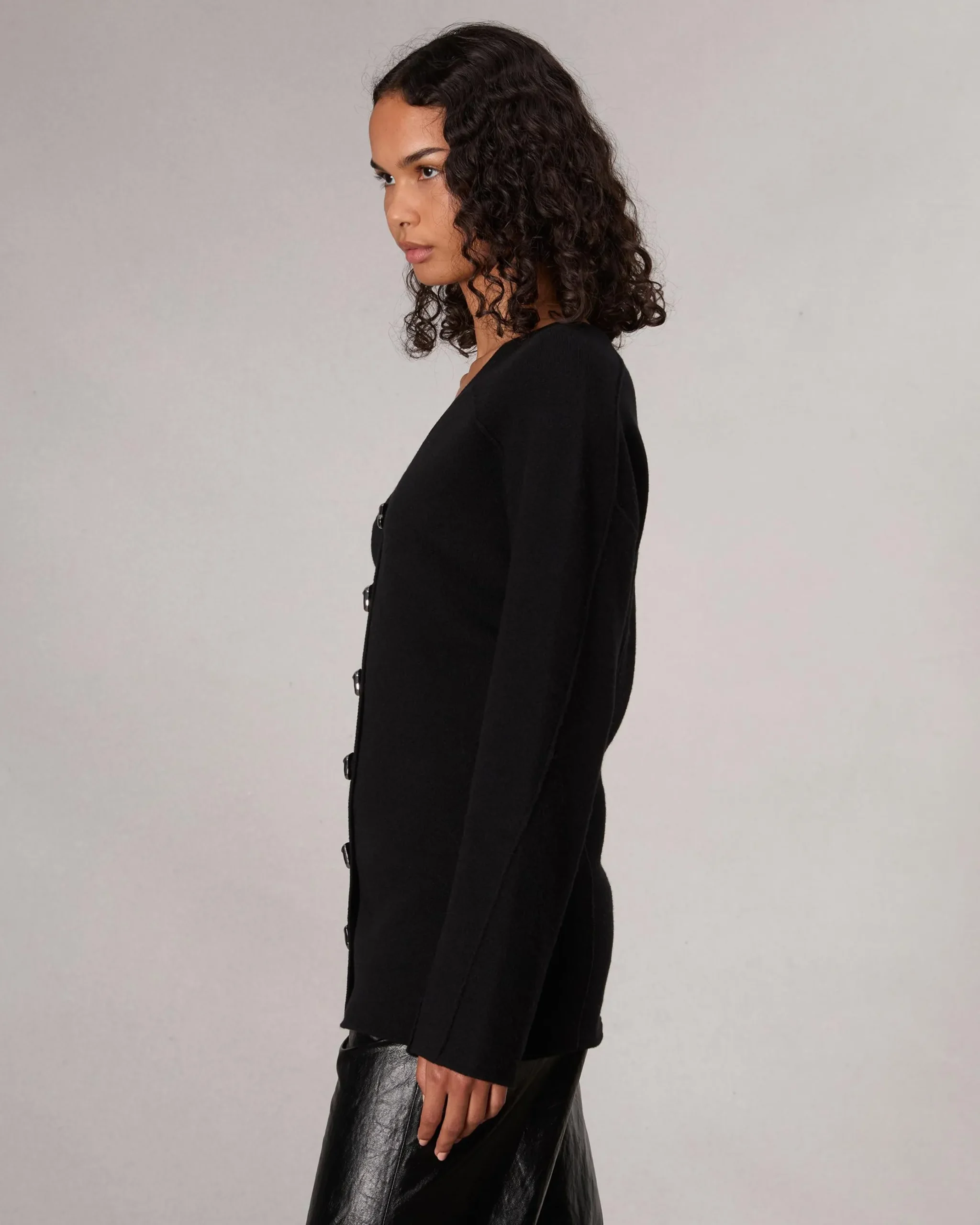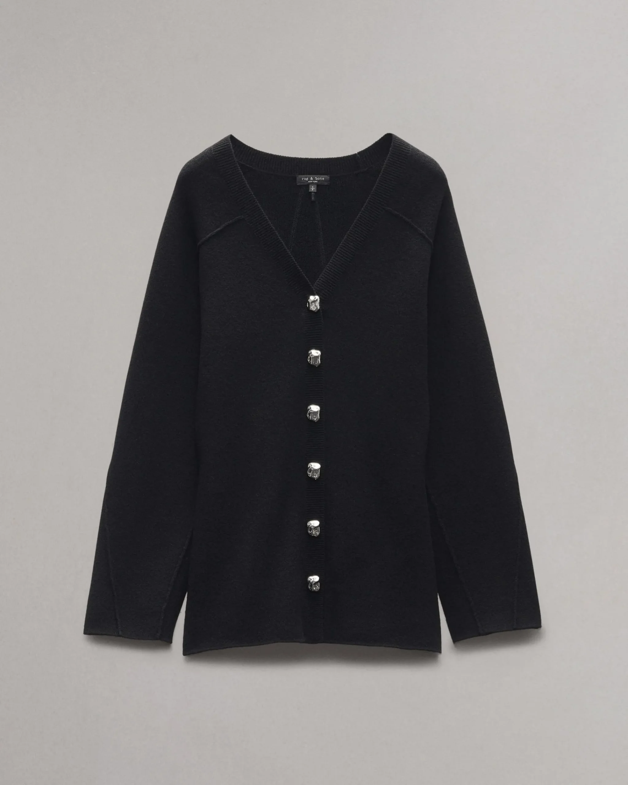 Sculptural metal buttons elevate this long V-neck cardigan, which is knit from a double-faced stretch-wool blend. Its nipped waist creates a flattering silhouette, while signature seaming details provide the perfect finishing touch.