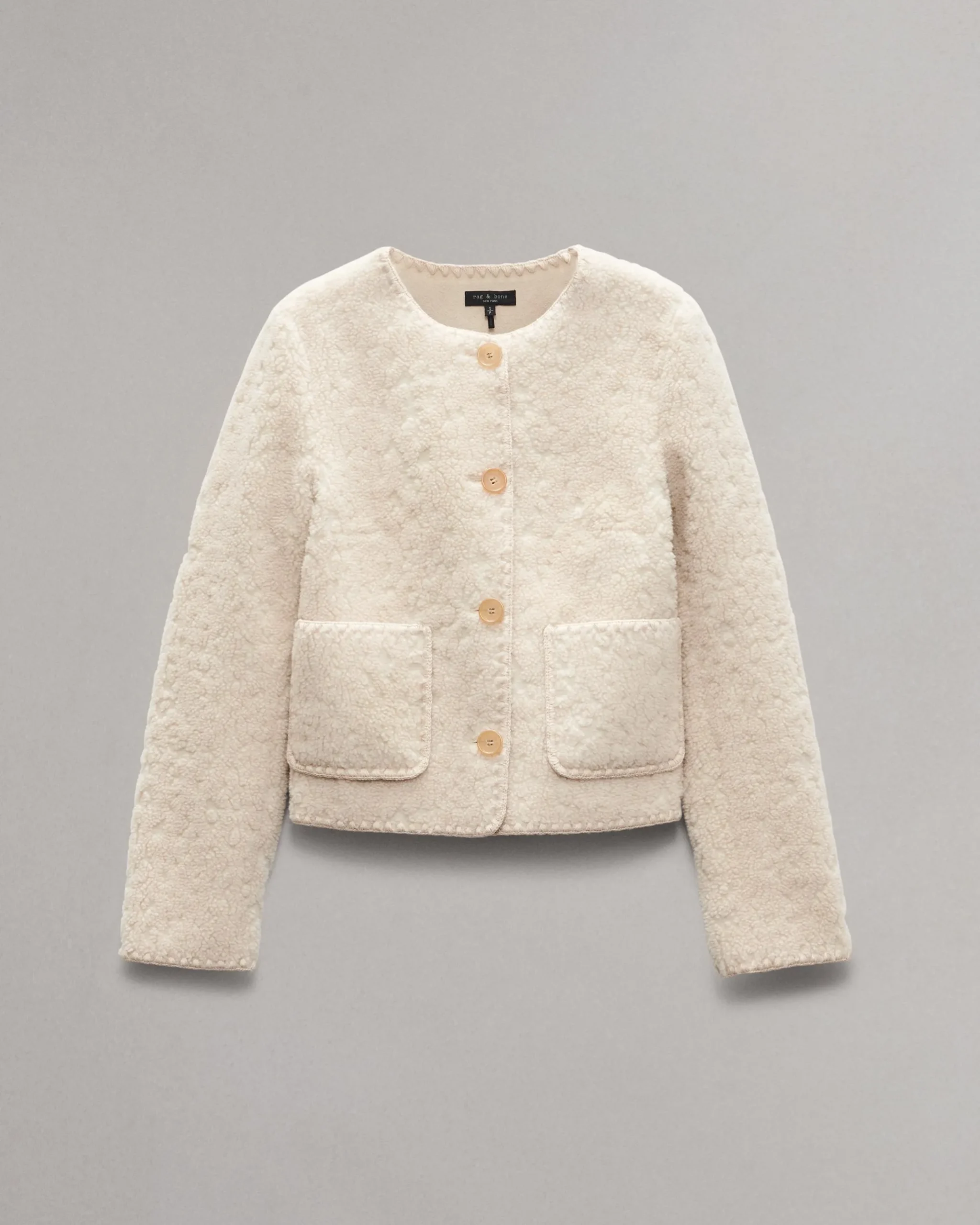 Classics. For a new era. The season’s lady jacket silhouette gets a modern update with plush faux shearling and tonal blanket stitches along the edges.