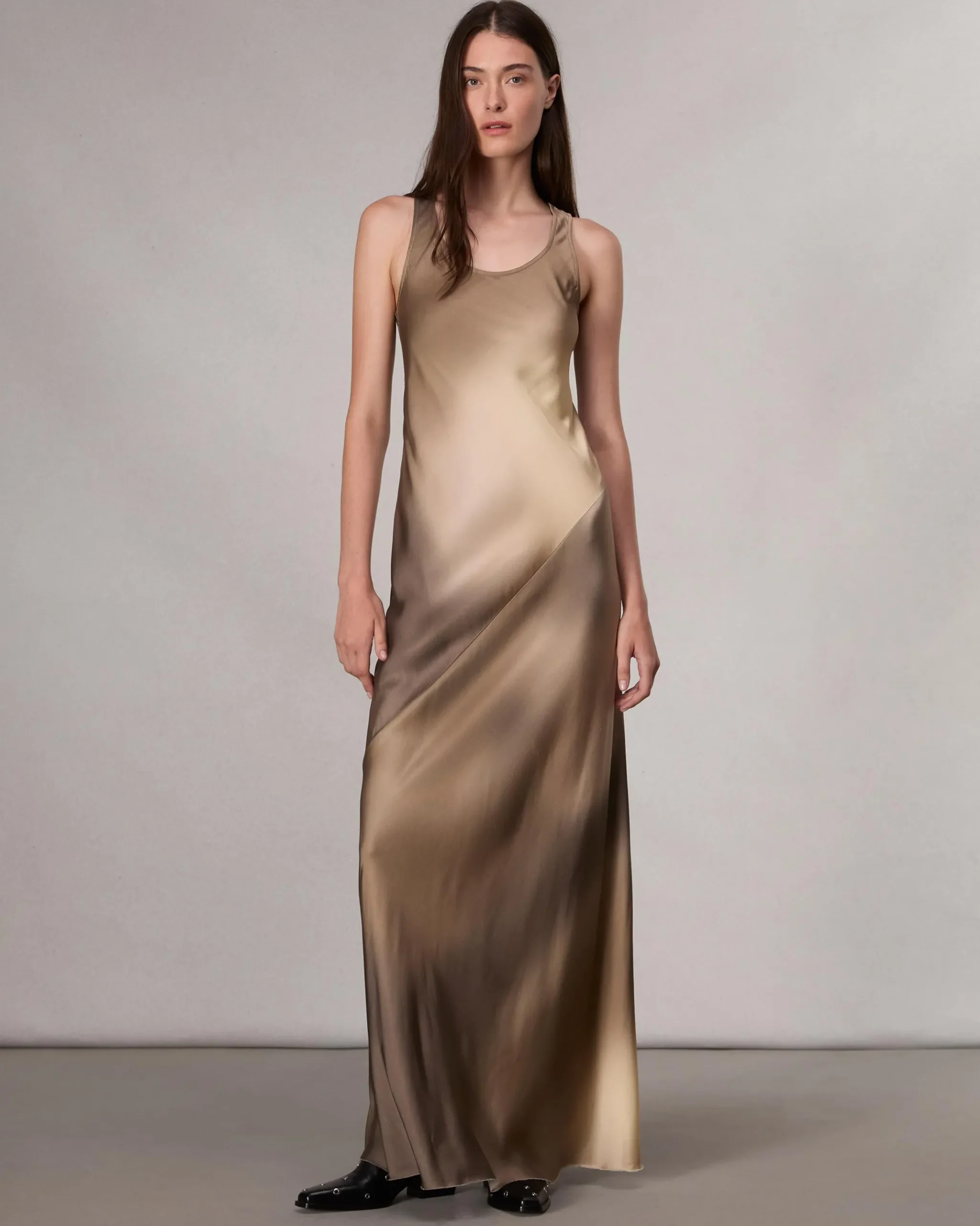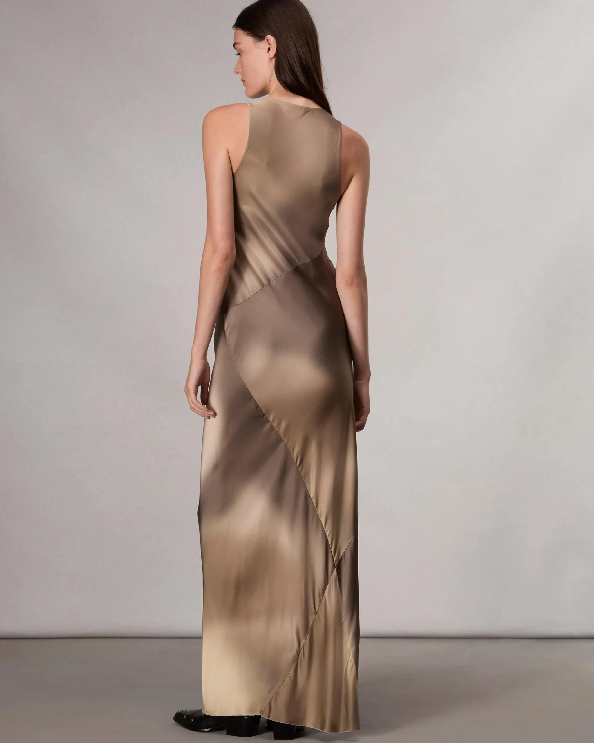 Pure poetry. With every step, liquid satin animates the watercolor-inspired print of this sleeveless dress. It’s cut along the bias to create a slim fit with a beautiful drape, and is finished with a raw hem.