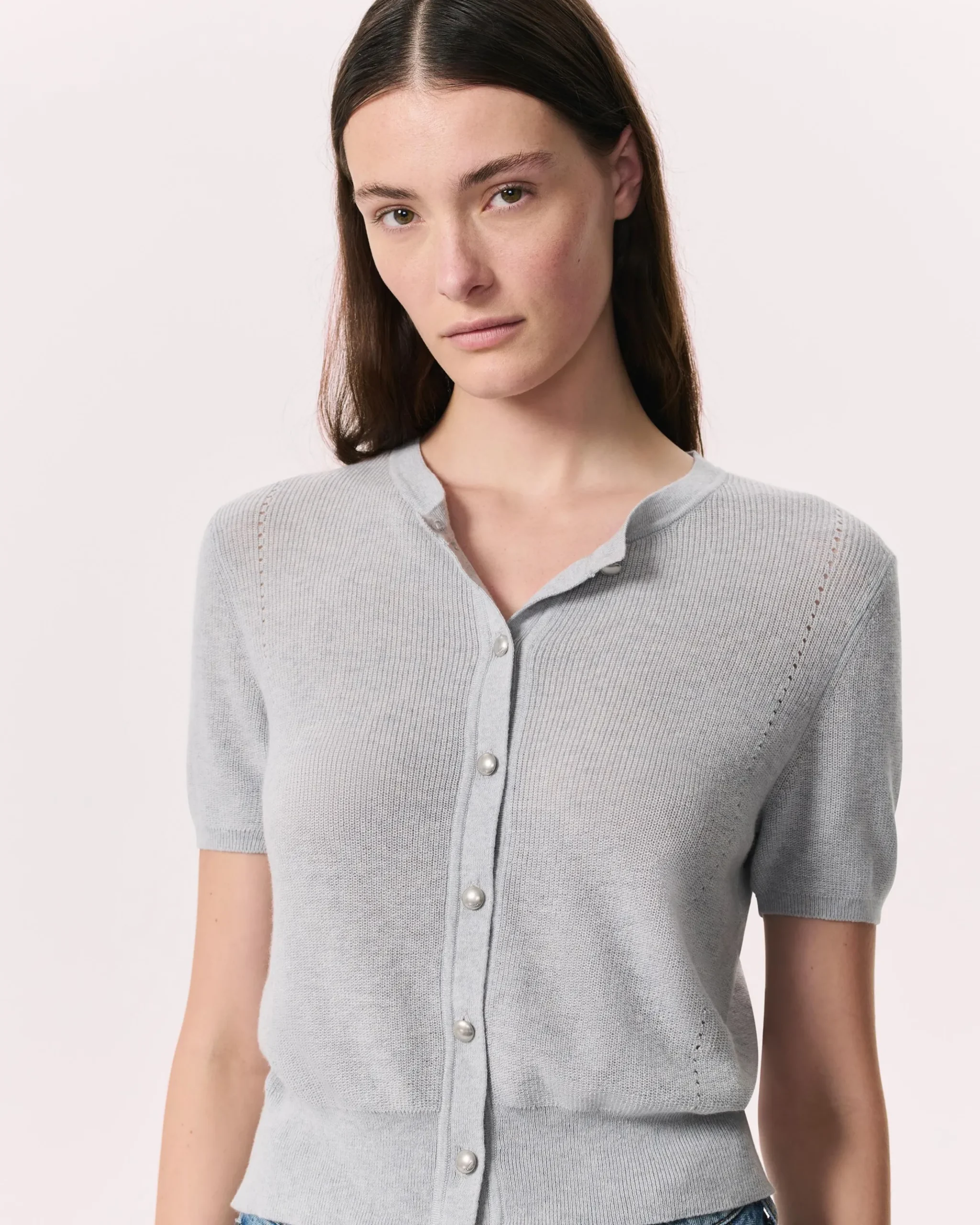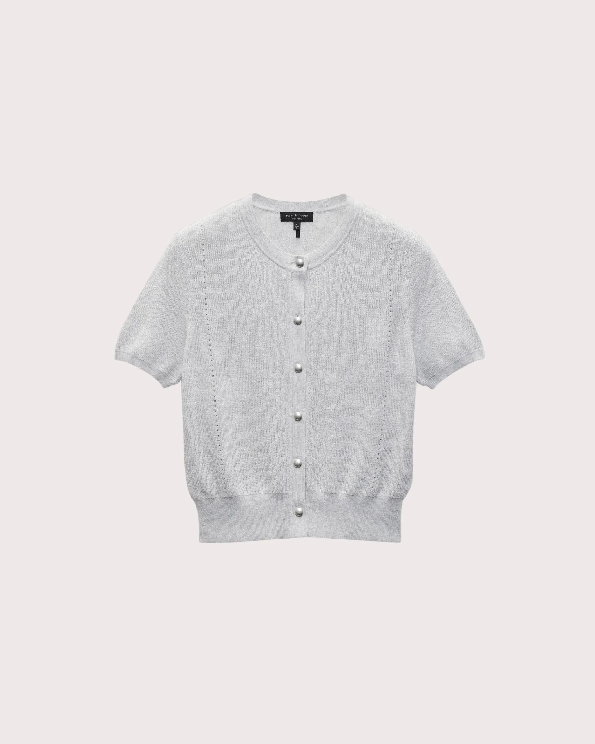 Our fitted, short-sleeve cardigan sweater, updated for the season in luxuriously soft yarn spun with cotton and cashmere. Metal buttons and our signature V-stitch seam detailing at the back complete its look.