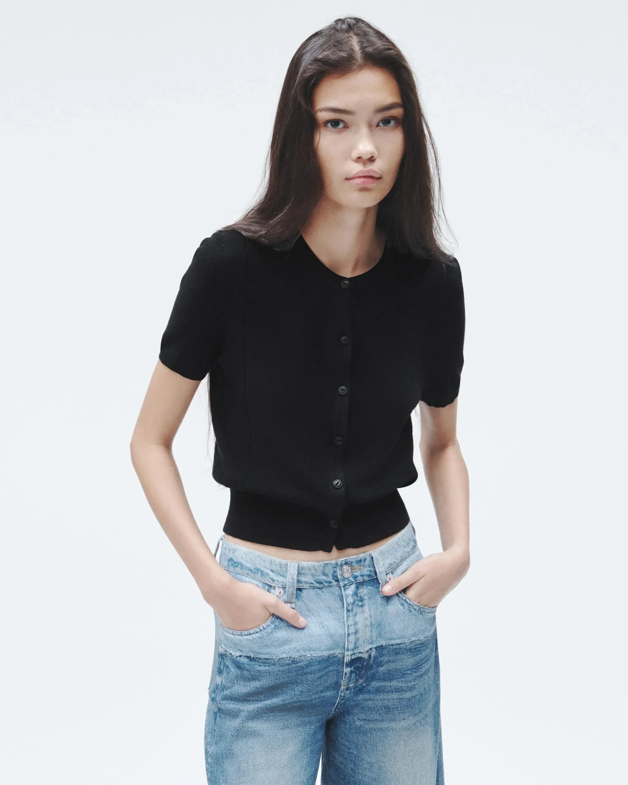 This fitted short sleeve cardigan is crafted from a stretch cotton linen blend for the perfect fit. Complete with recycled buttons down the center front.