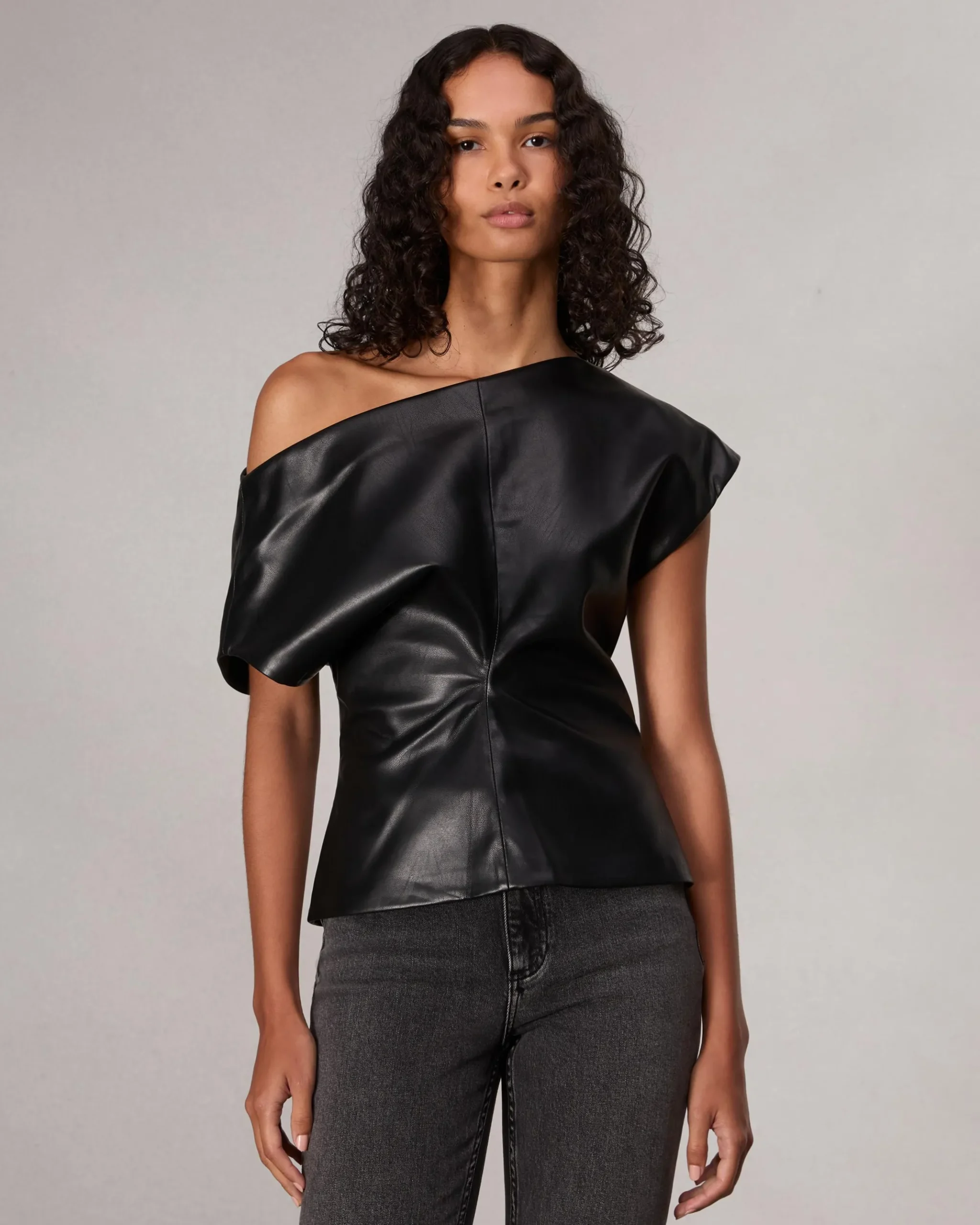 Sculpted from faux leather, this sleek one-shoulder top is gathered at the waist to achieve a slim fit. Fully lined, it zips up the back to keep the focus on the front.