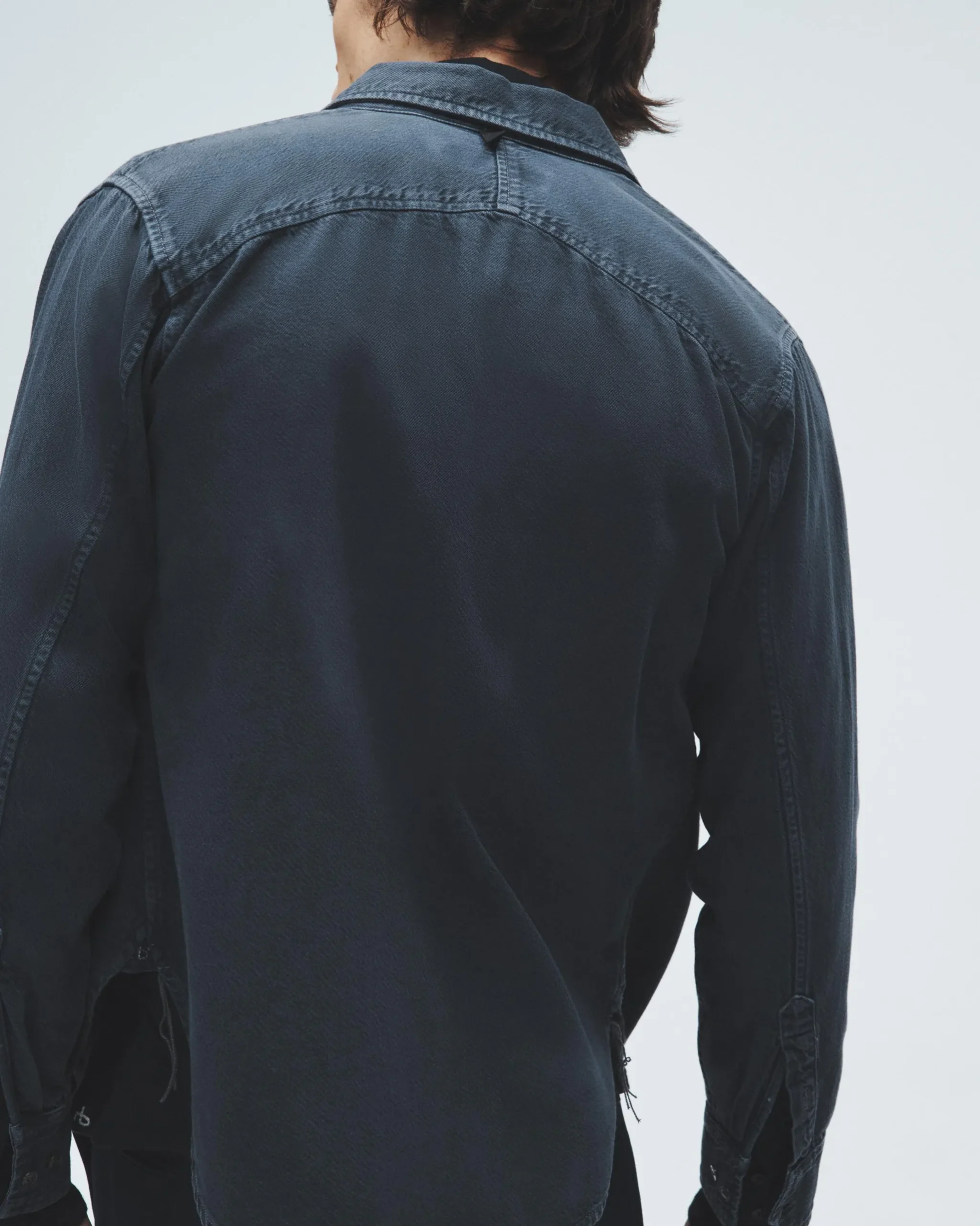 Our iconic Jack Shirt silhouette, updated with engineered sleeve construction to allow for the utmost functionality and ease. Crafted from our Featherweight denim that’s made with lyocell to make it ultra-light and supremely soft, the Jack Shirt features mudd buttons along the front and sleeve cuffs. Your go to, versatile shirt that can be worn as a base layer, or thrown over a tee for a more relaxed look. Featured in Minna, a dark indigo overdyed wash.