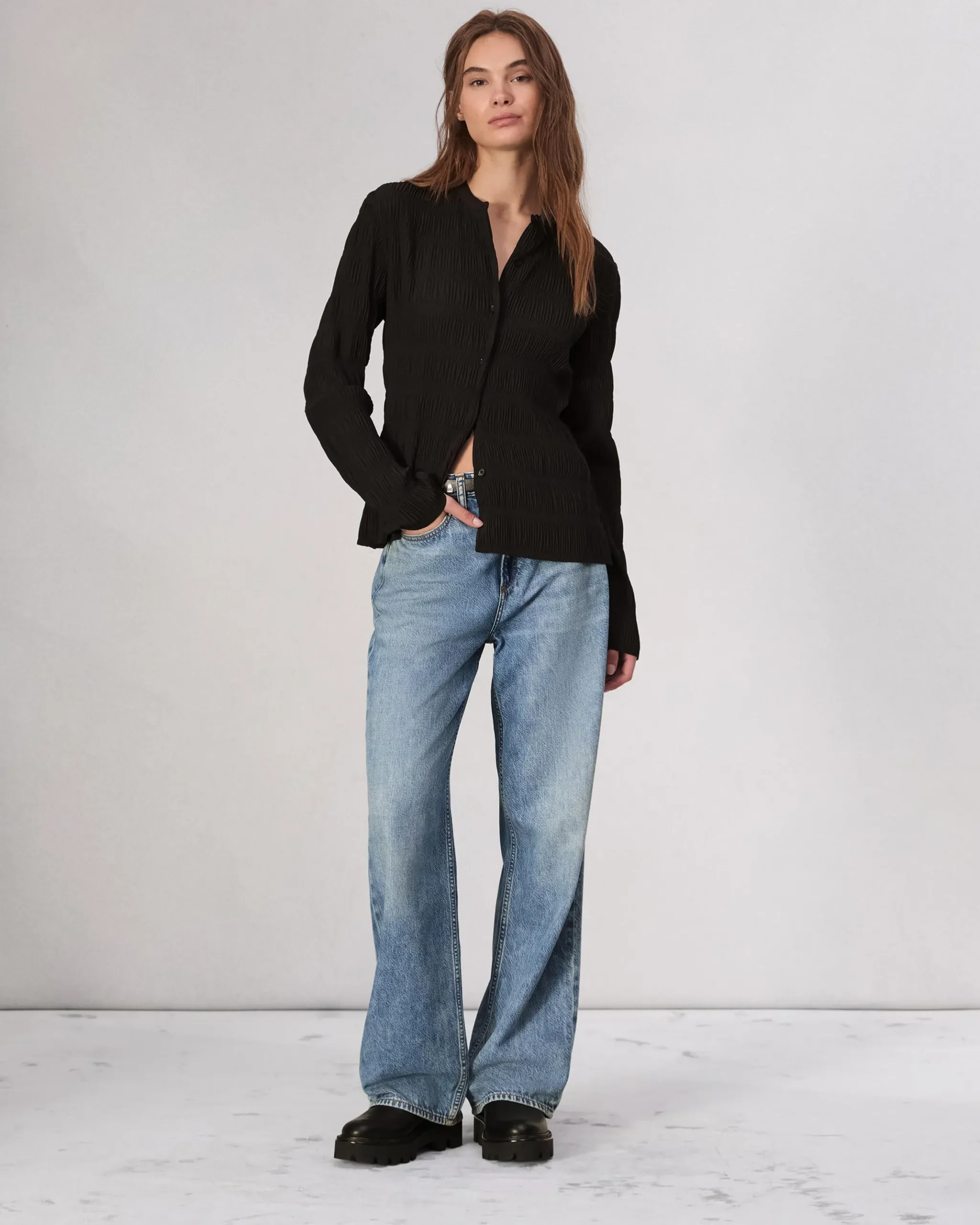 The Logan is a laid-back, wide-leg, mid-rise jean made from our ultra-light Featherweight denim. With a roomy cut through the hip and thigh, it doesn’t get more comfortable than this. Pro tip: take your natural size and wear low on your waist for a relaxed look or size down for a higher rise. Available in Audrey, a light indigo wash.