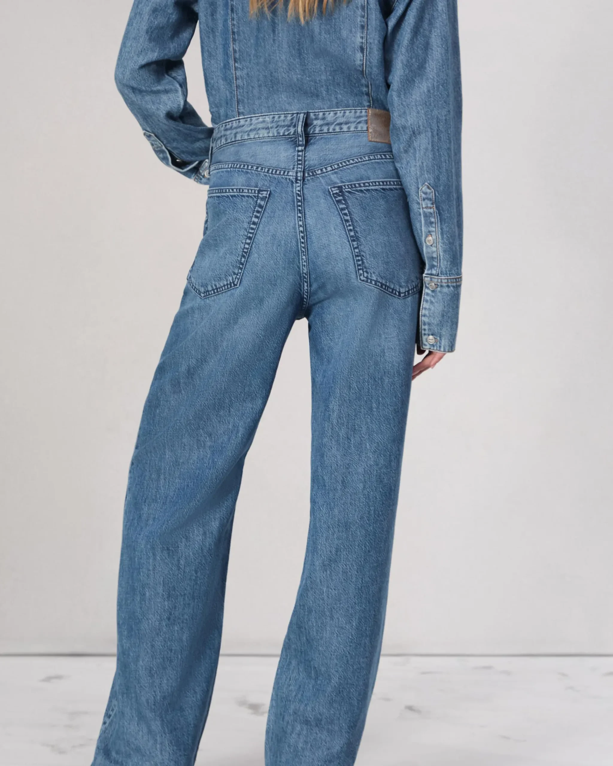 The Logan. Our laid-back, mid-rise jean with a roomy cut through the hip and thigh. Pro tip: take your natural size and wear low on your waist for a relaxed look or size down for a high-rise look. Crafted in Featherweight denim with a relaxed fit. In River, a medium indigo wash with a clean hem.