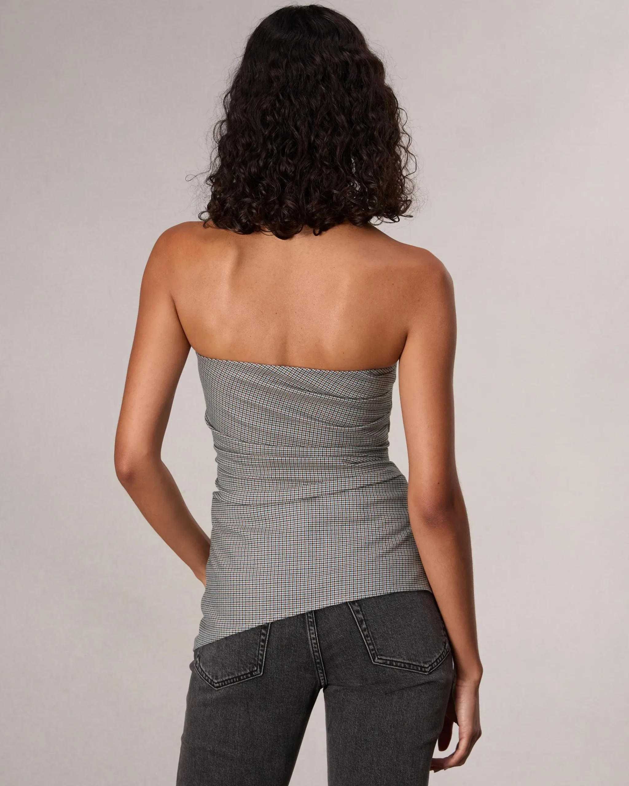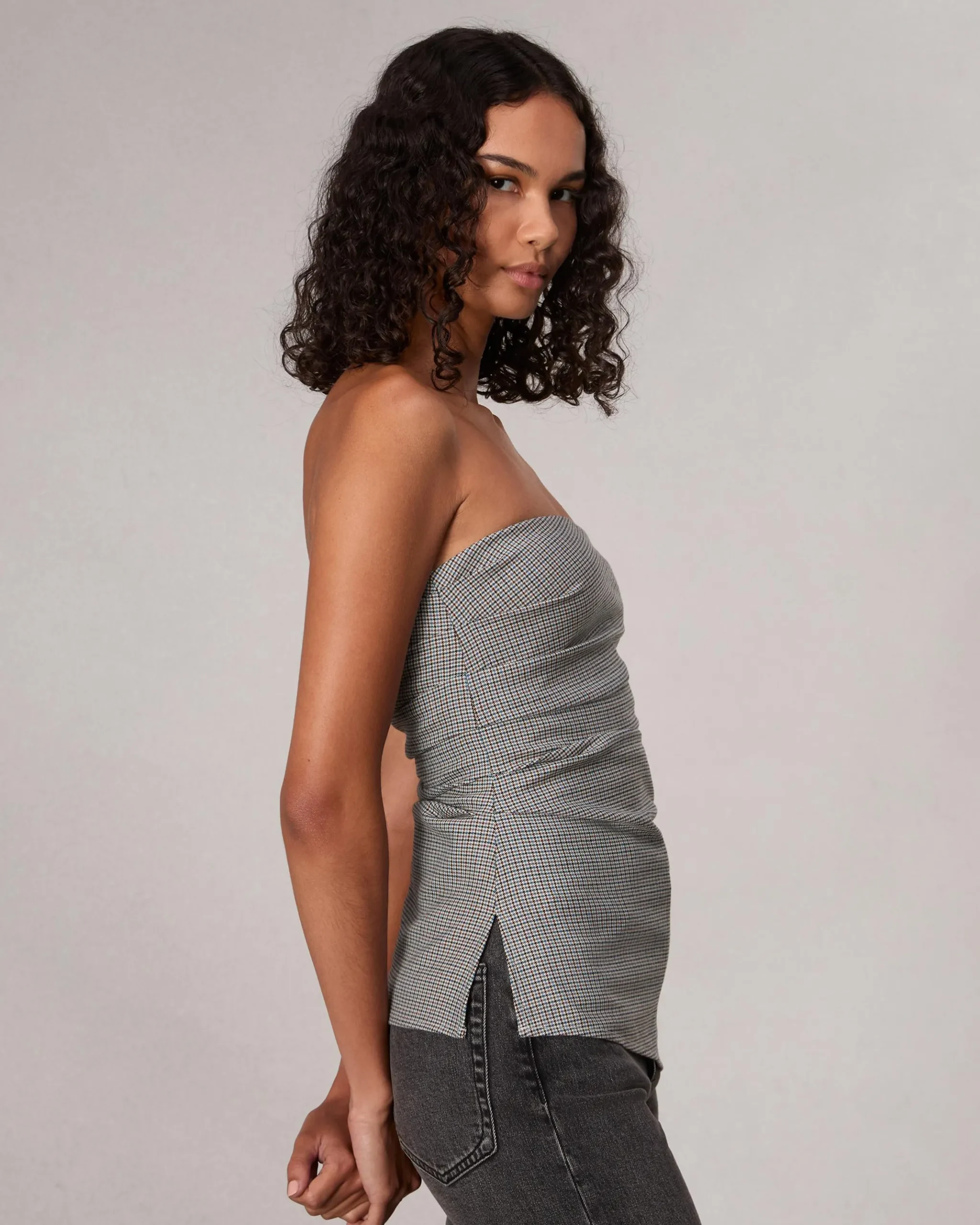 We tailored this trim strapless top from a wool-blend houndstooth plaid. A built-in shelf bra keeps things streamlined.