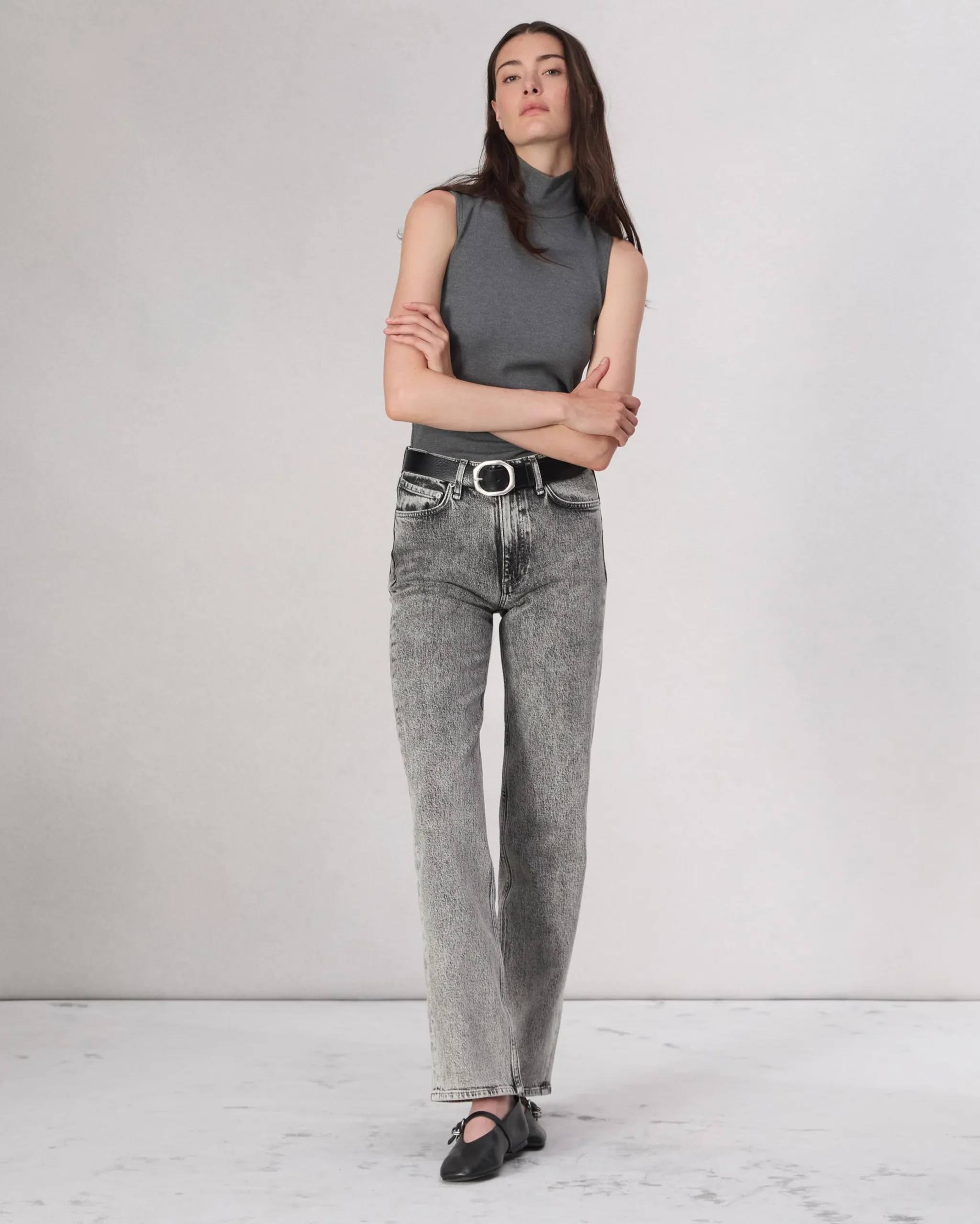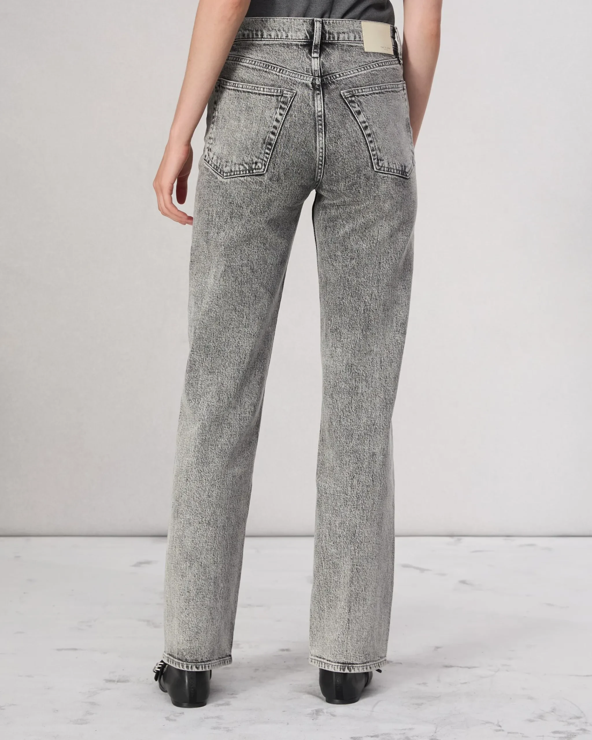 The Harlow. A clean, full length straight fit crafted in our Vintage Stretch for a structured look that’s actually soft and flexible. In Hudson, a grey acid wash with a clean hem.