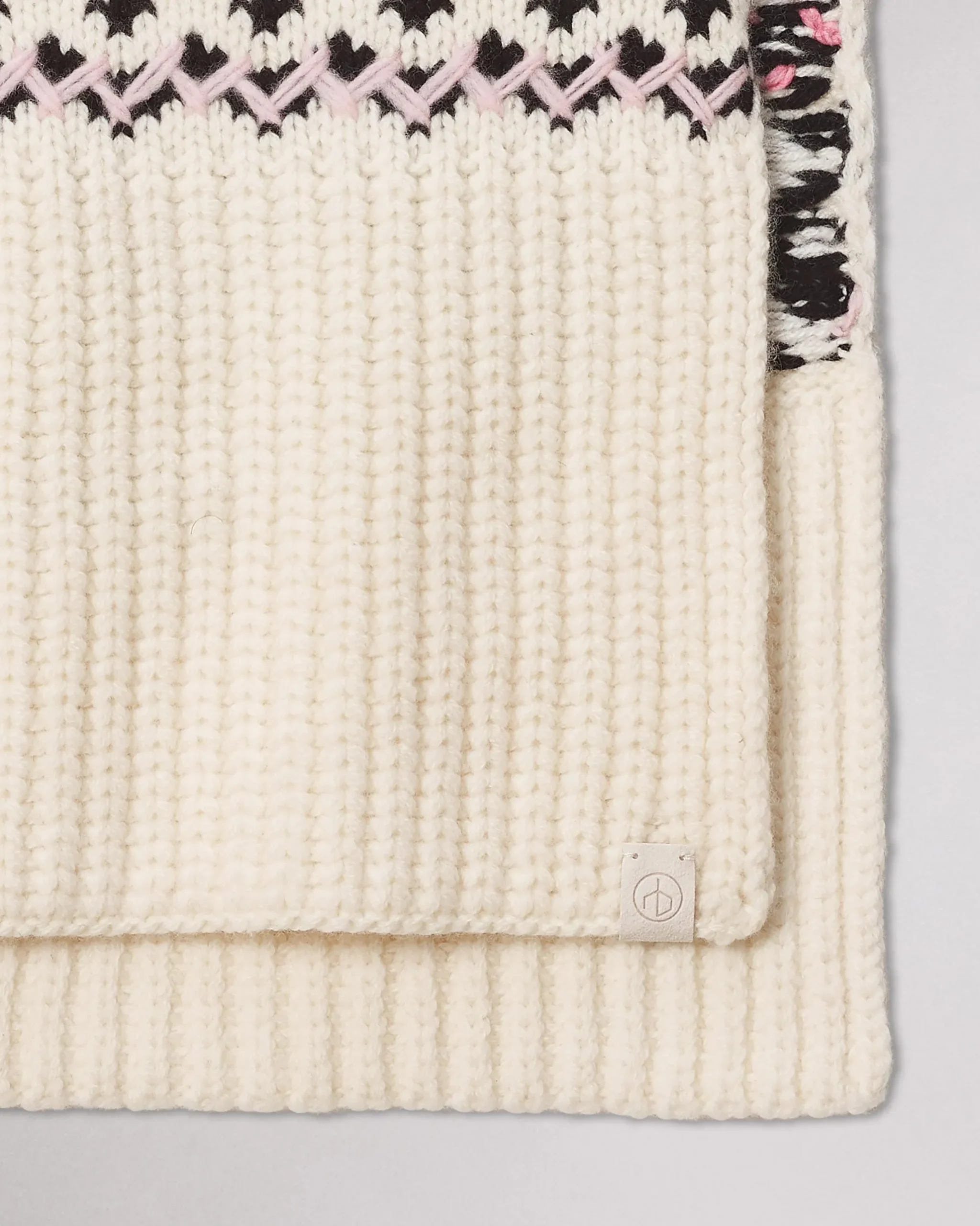 The Leigh Scarf. Knit with wool in a dynamic Fair Isle stitch, ideal for the throes of winter. The perfect combo when paired with its matching beanie or sweater.