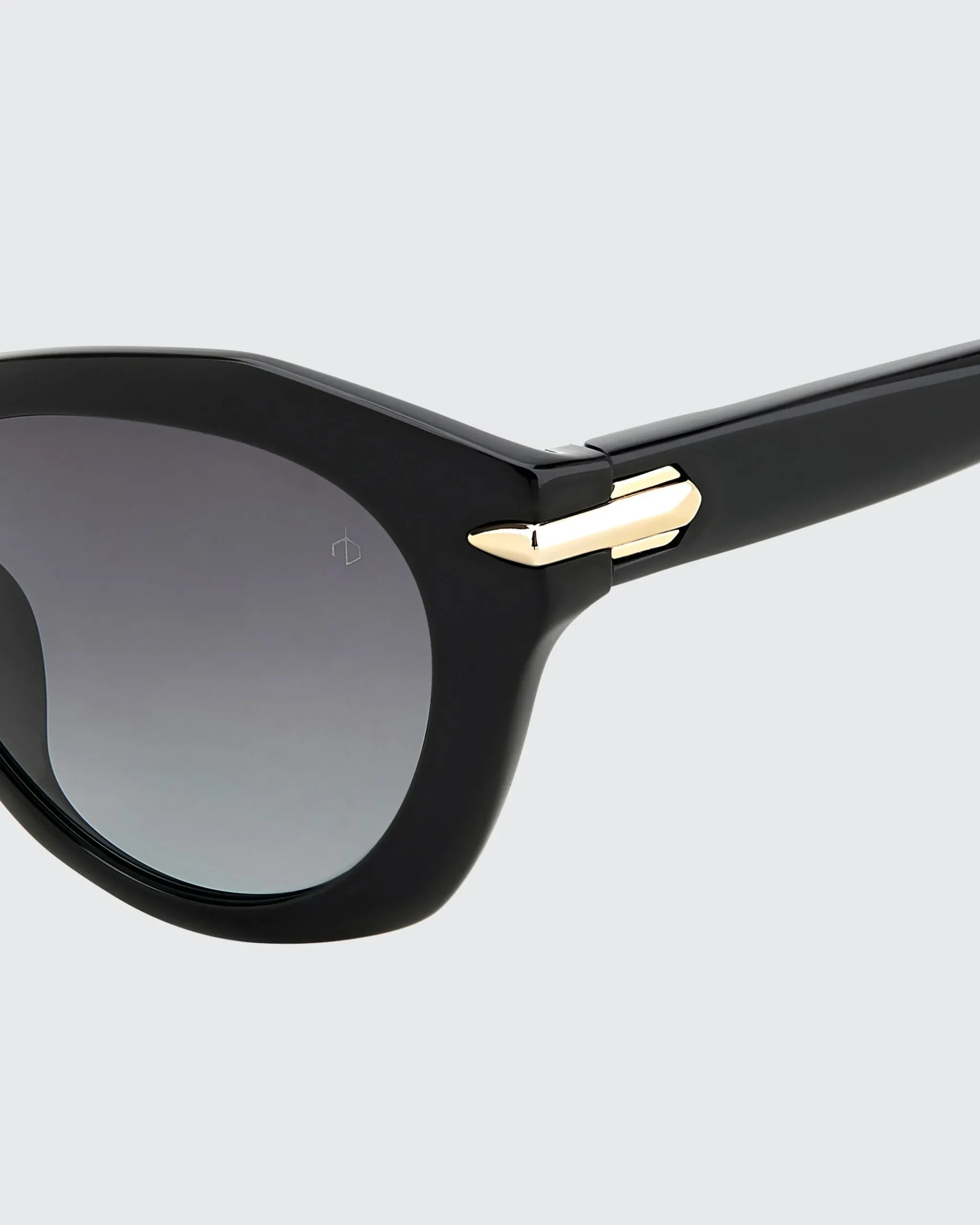 A cat eye silhouette with an acetate frame and 100% UV protection.