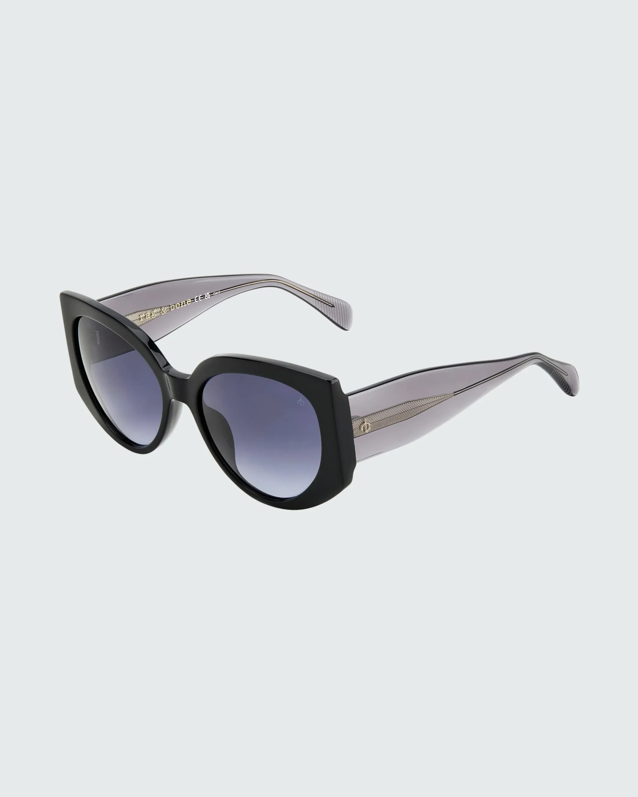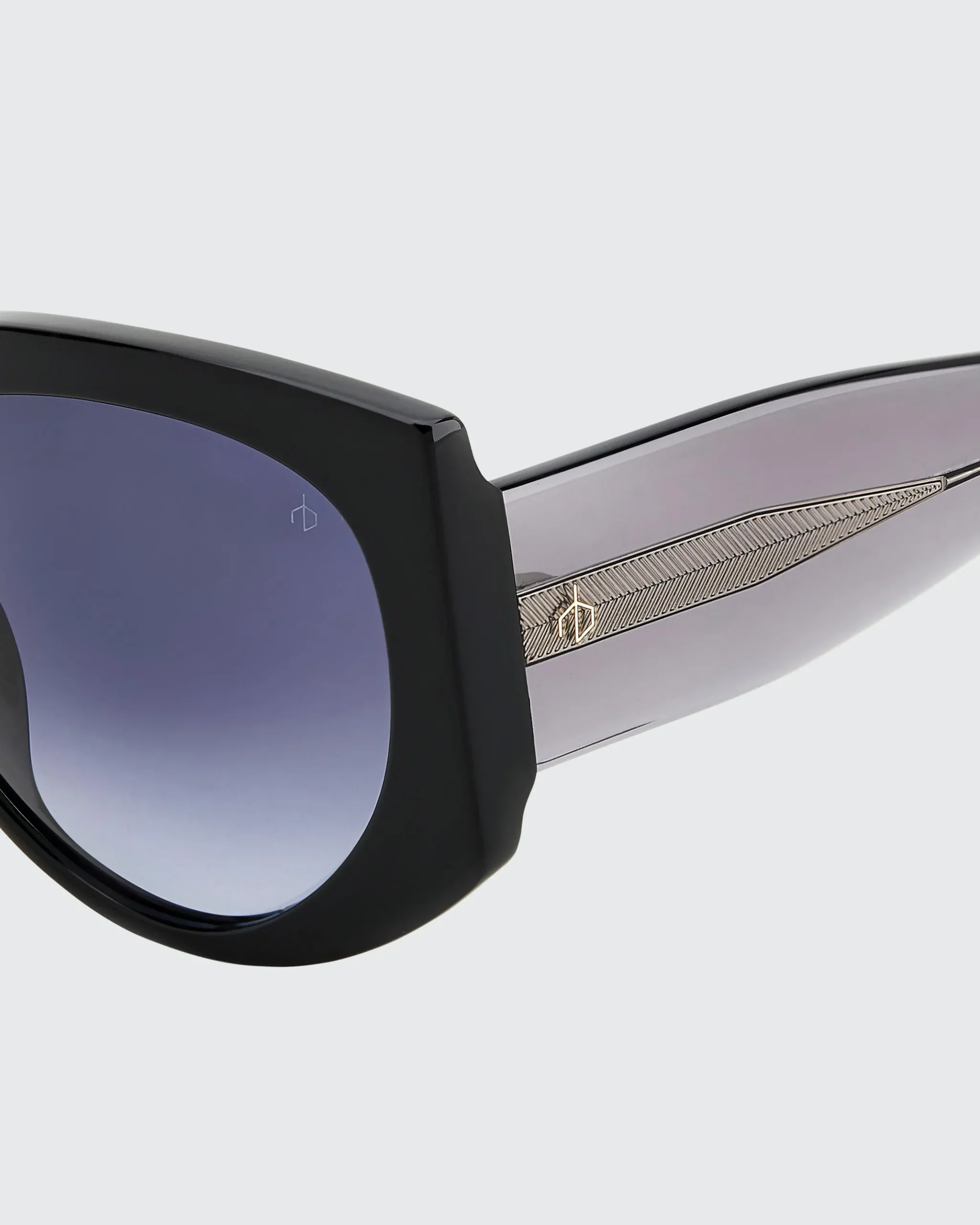 A cat eye silhouette with an eco acetate frame and 100% UV protection.
