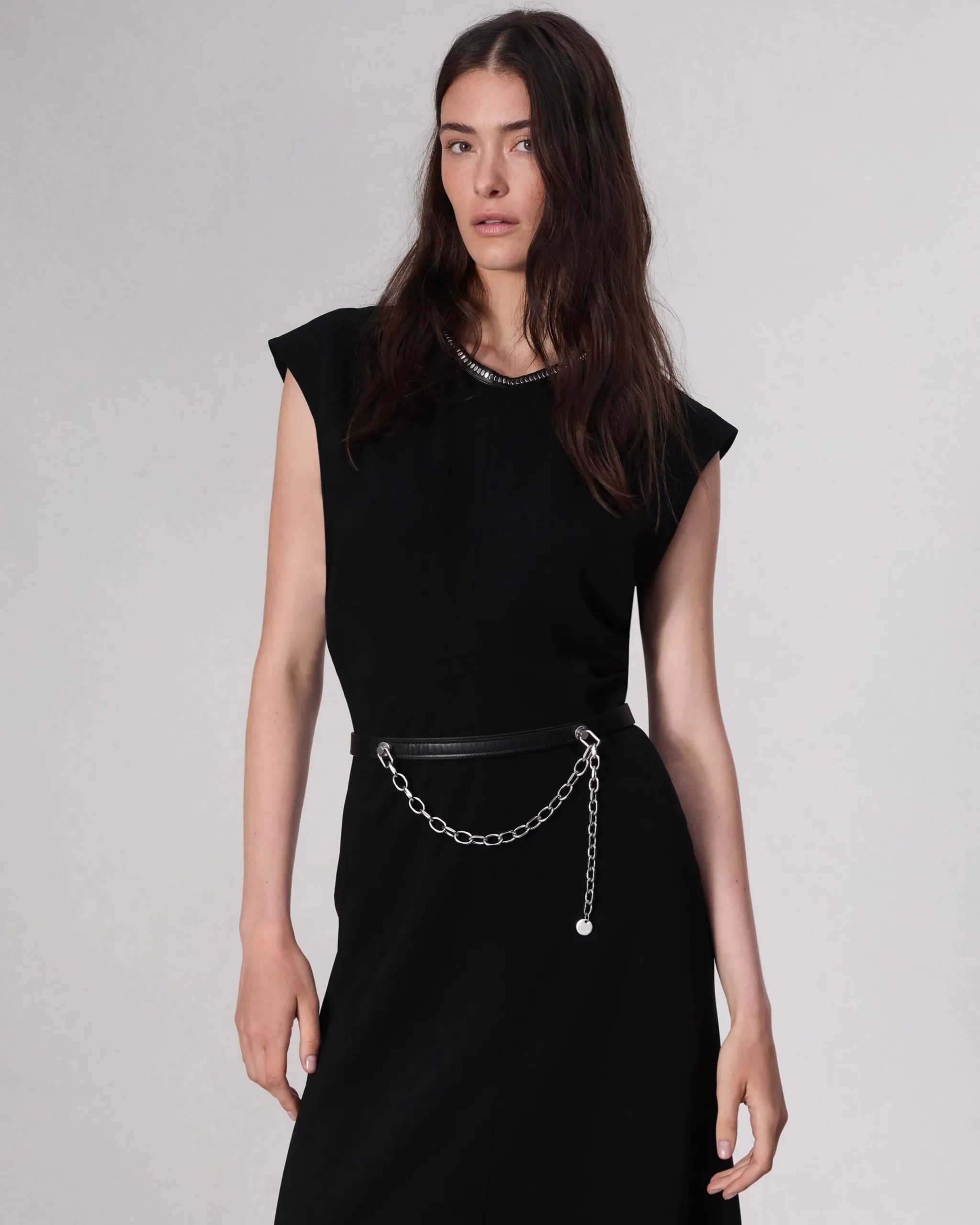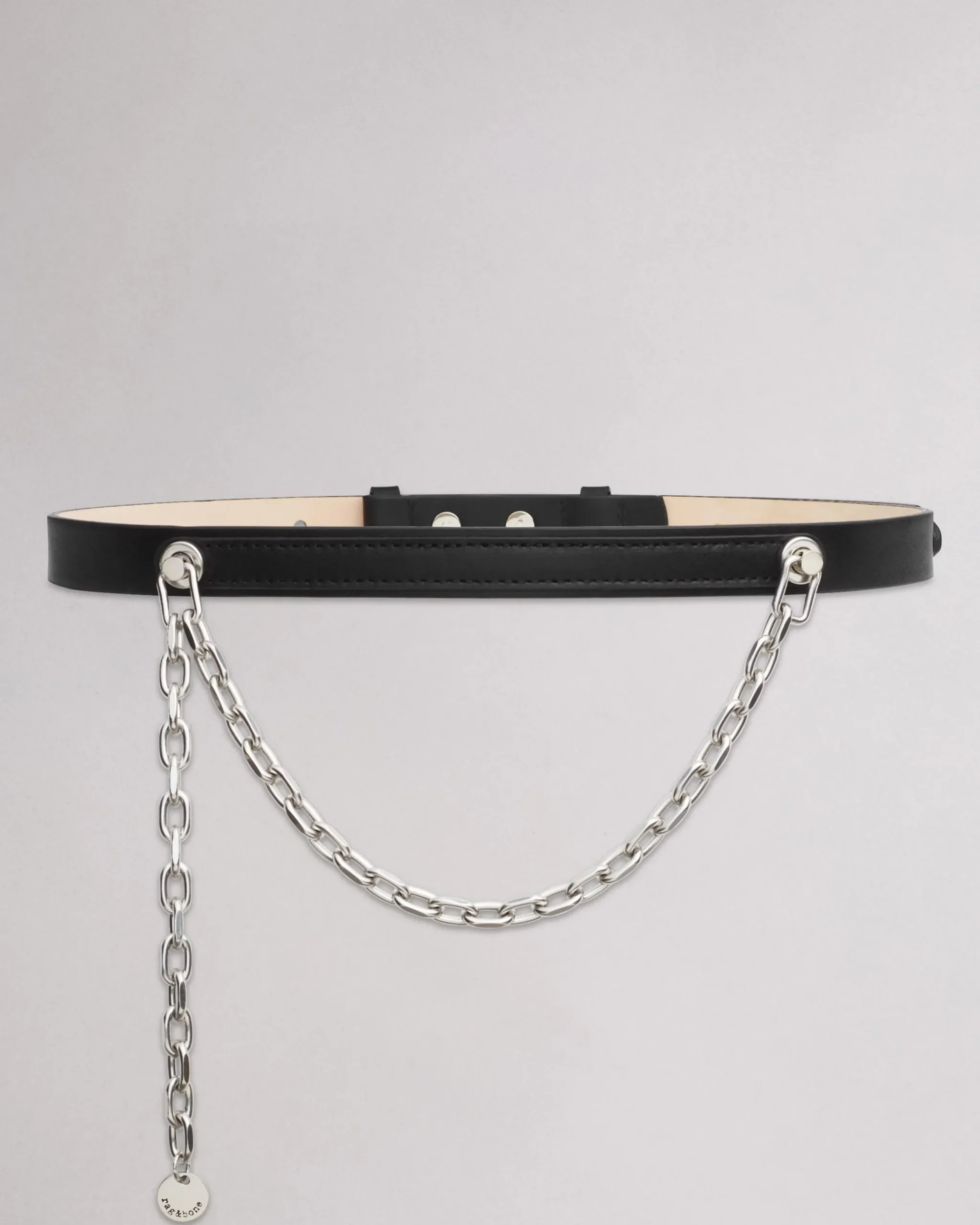 The Mari. Draped with a chain for an added edge, this thin belt is cut from smooth leather.