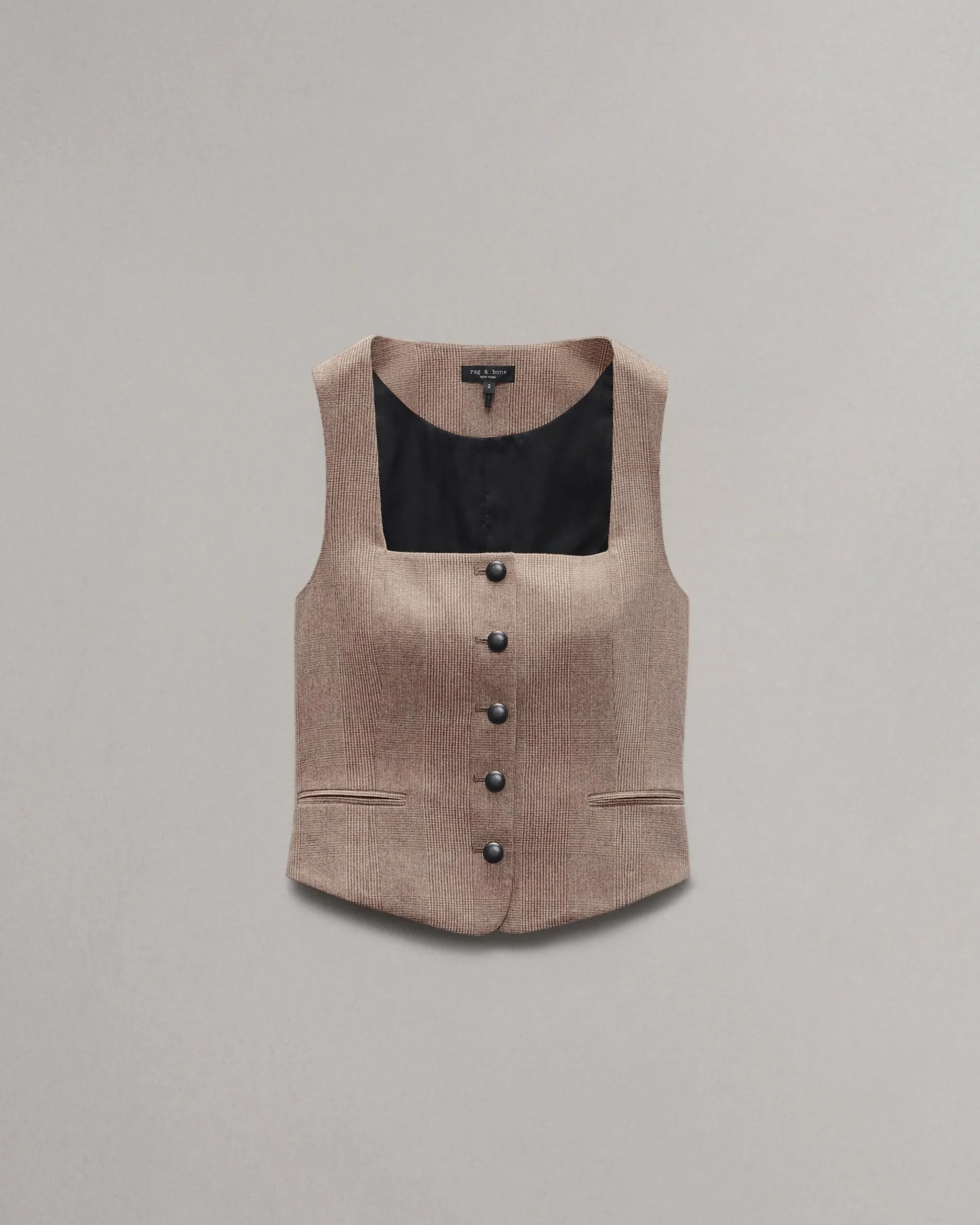 This slightly cropped square-neck vest is tailored from soft stretch wool with an understated glen plaid pattern. Its visual texture is complemented by faux leather buttons.