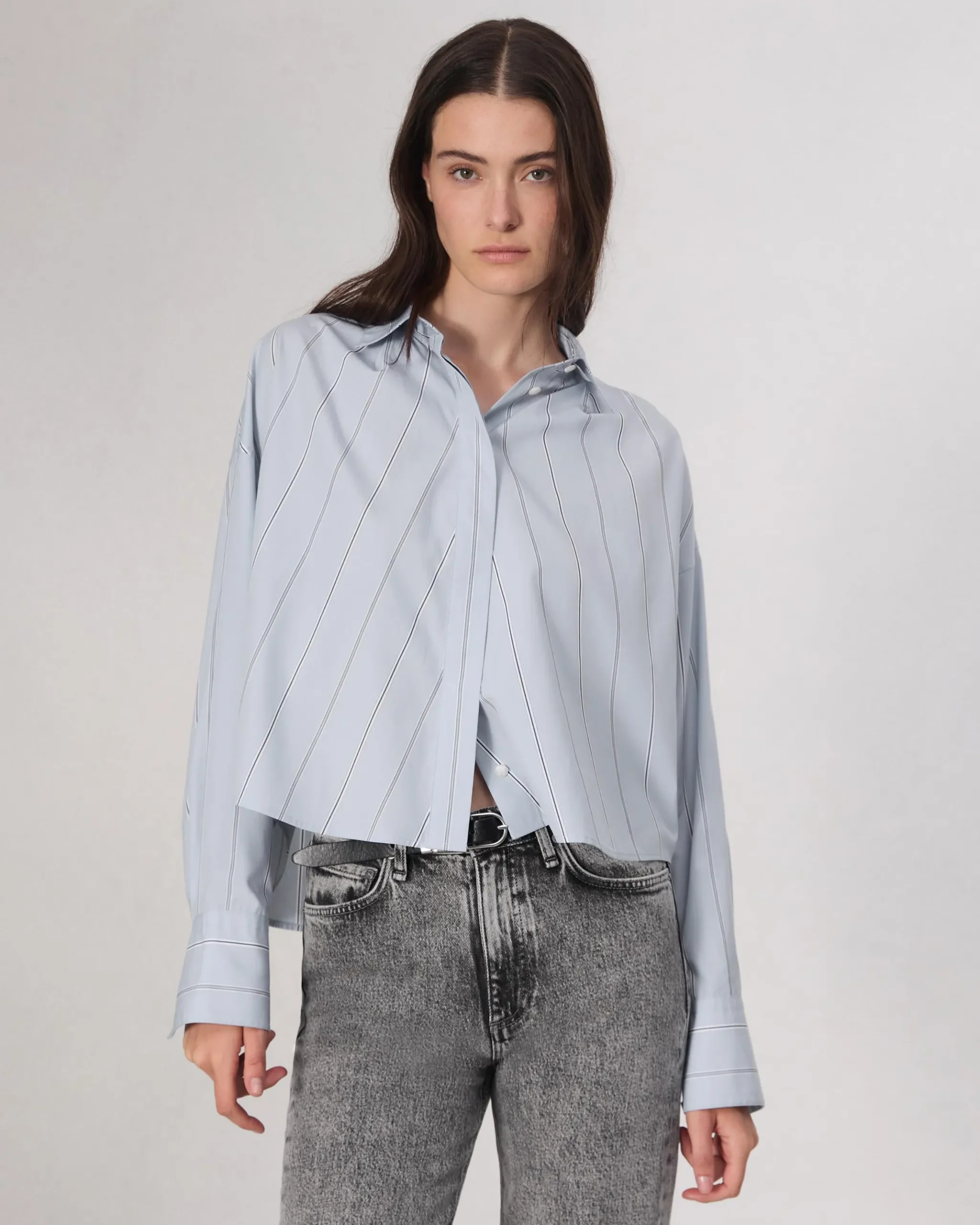 The Martha. Crafted in our signature cotton poplin for the ultimate wardrobe staple. Detailed with a back knife pleat to achieve the perfect relaxed crop fit, this long sleeve style features a hidden button placket for a clean finish.