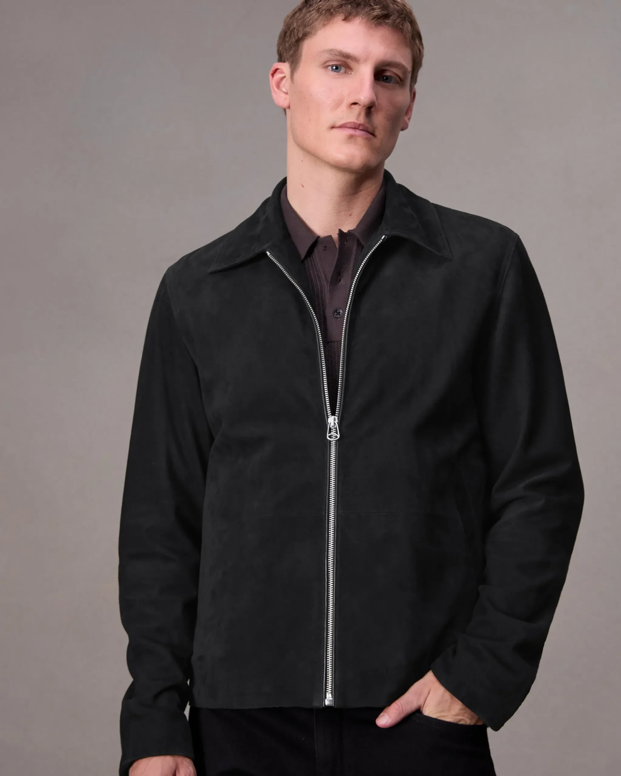 The Melrose. A pared-back classic. This straight-fitting style is detailed with a pointed collar, snap cuffs and a zip front closure, all in velvety soft suede.