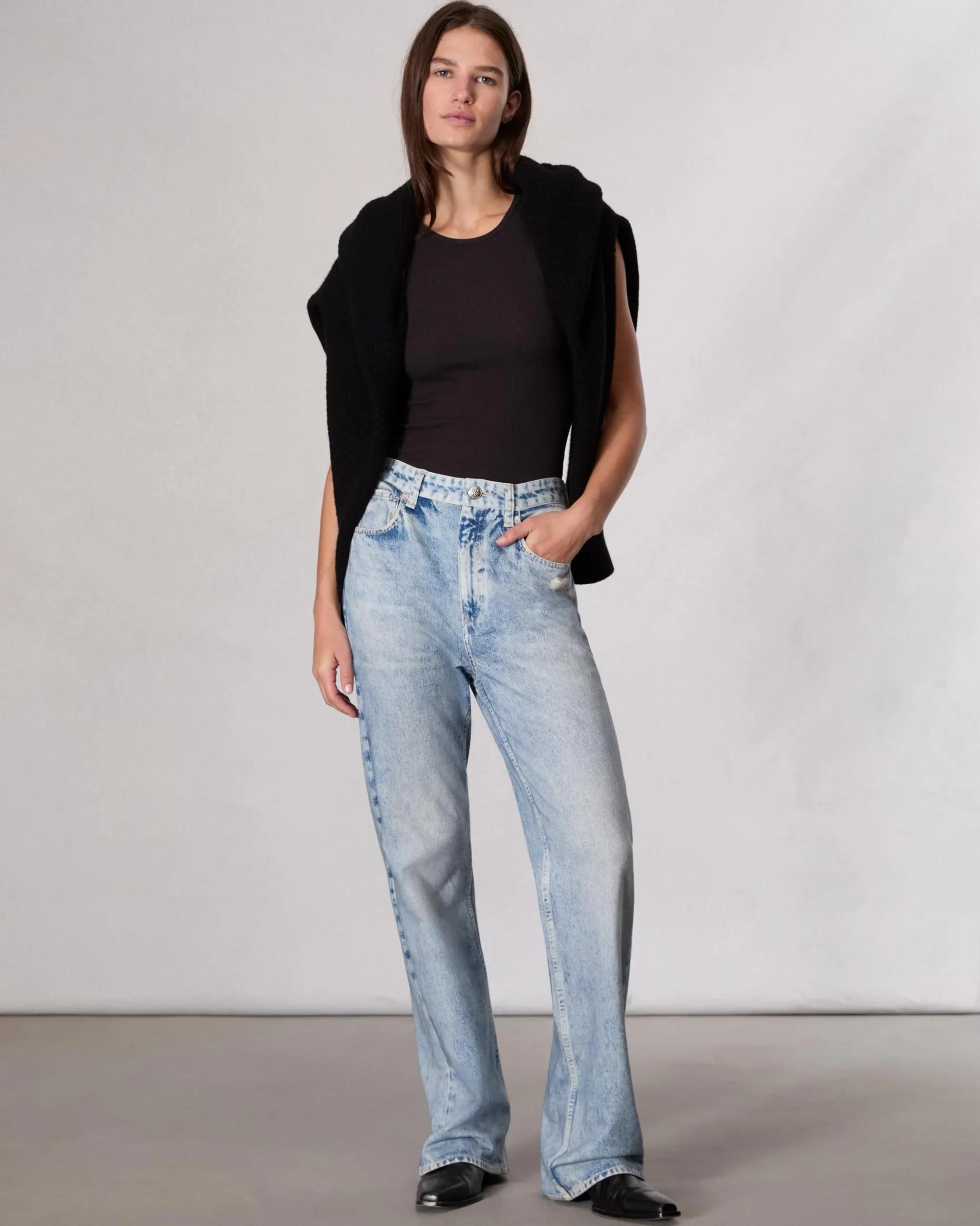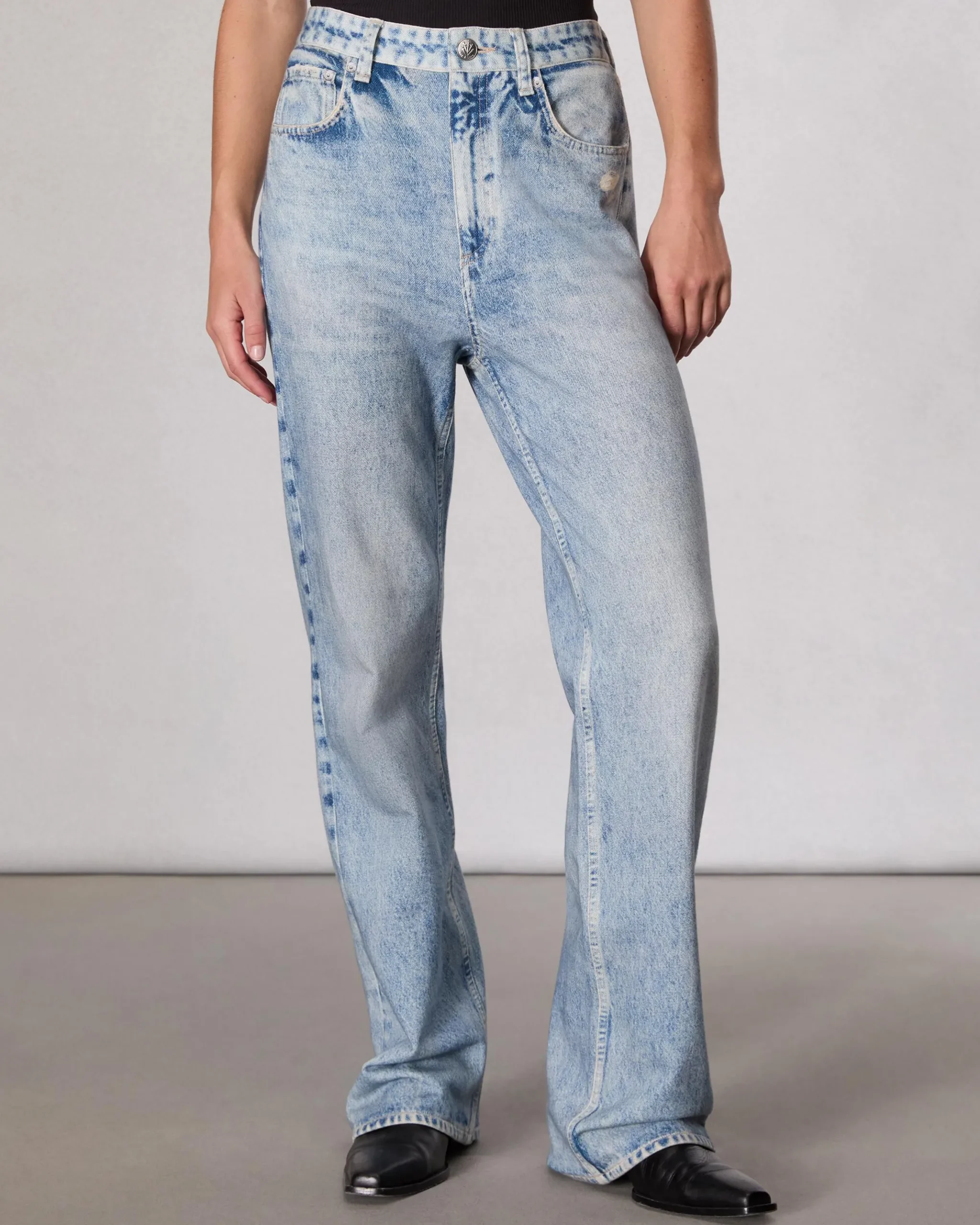 High rise, relaxed straight legSize 26: 12″ front rise, 30″ inseam, 19″ leg opening