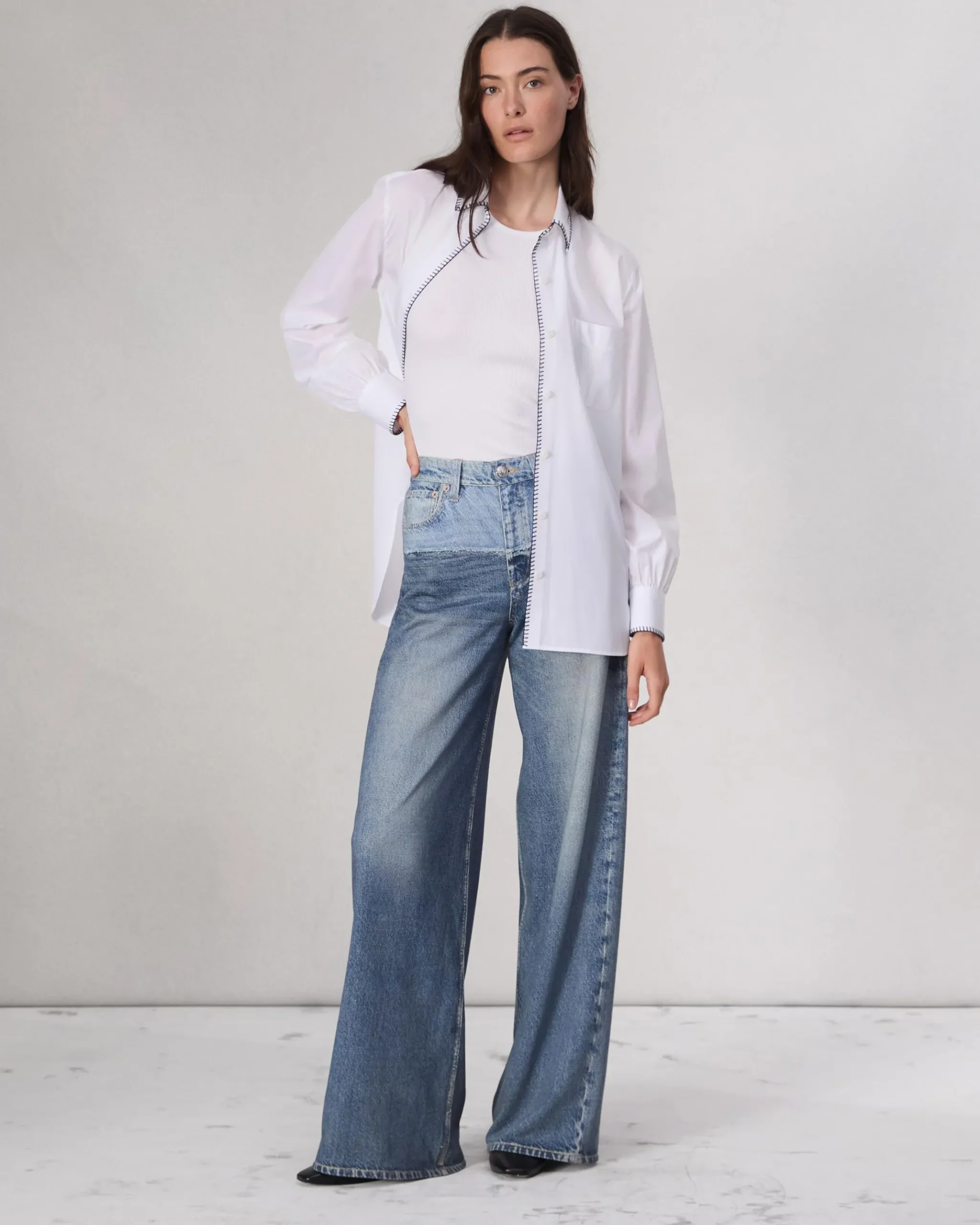 High-rise, wide leg, full lengthSize 26: 12 3/8″ rise, 34″ inseam, 25 1/2″ leg openingModel is 5’10.5″ wearing a size 25