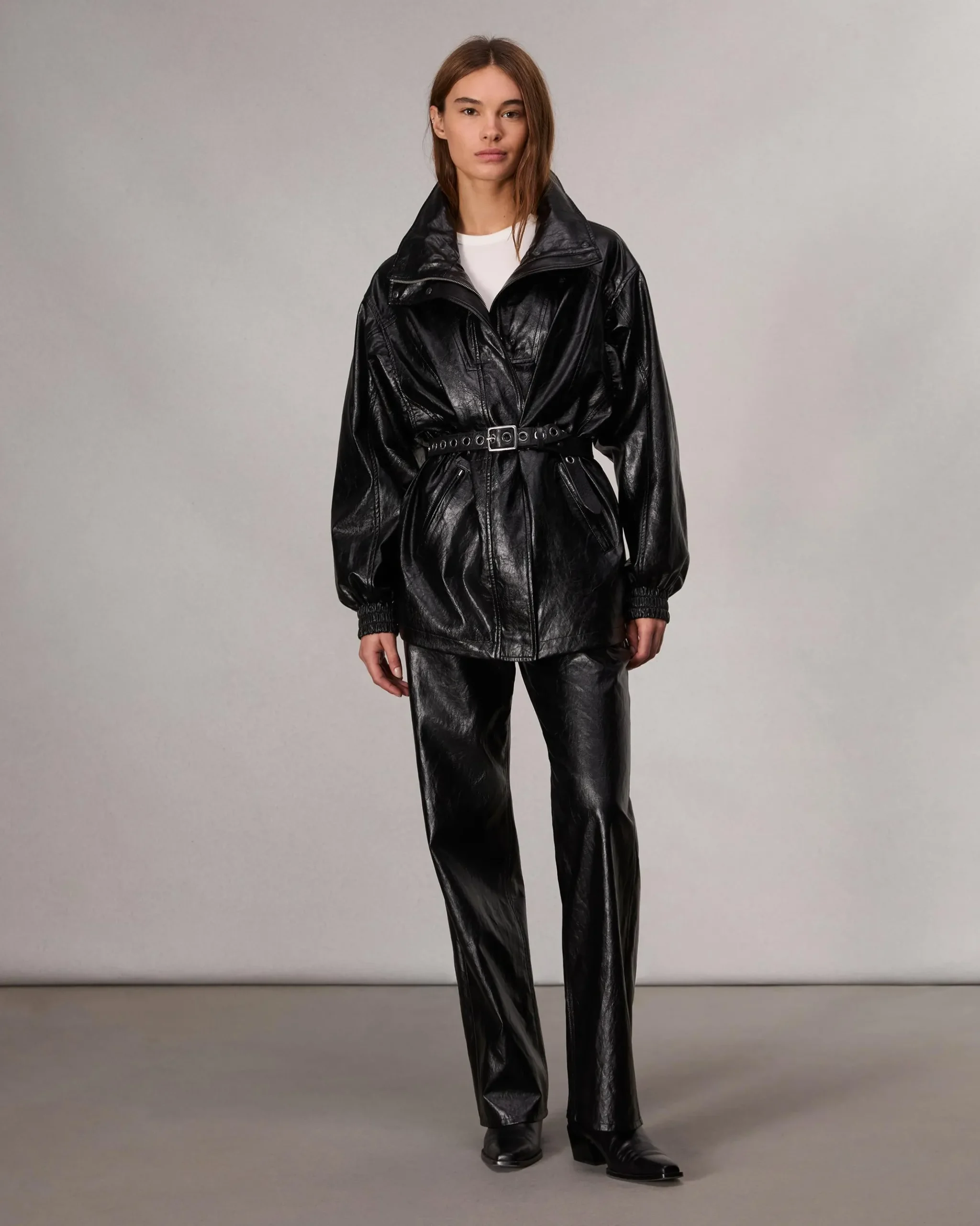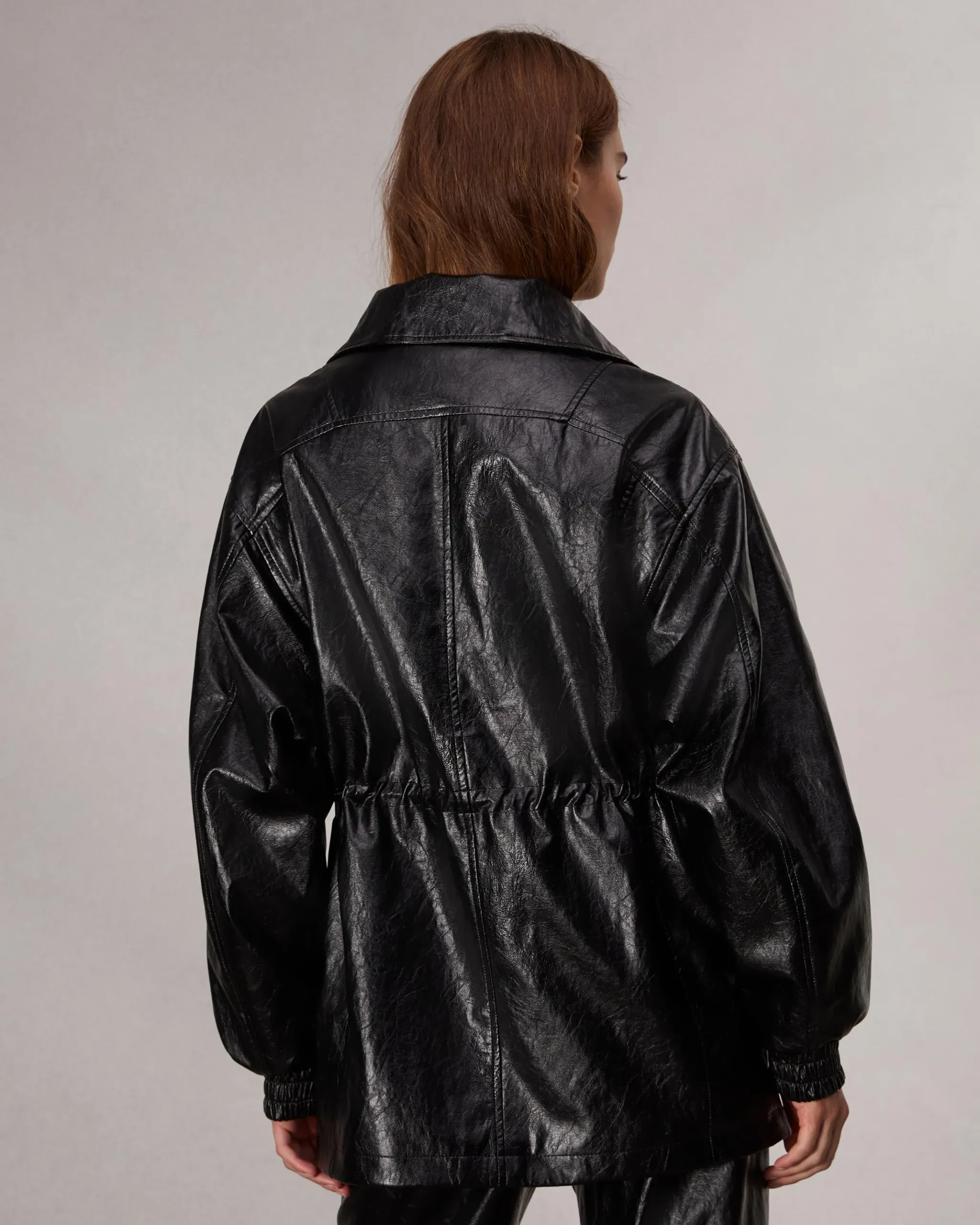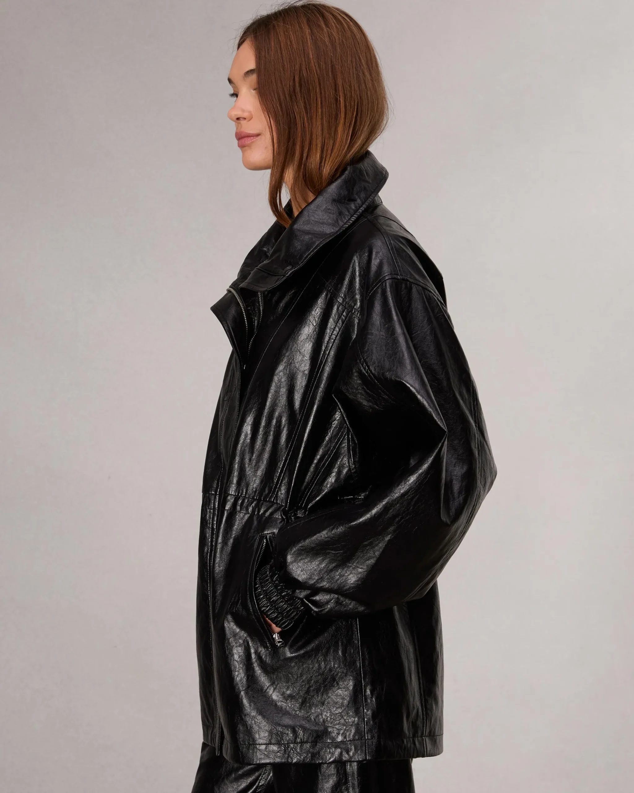 Inspired by vintage sportswear, this oversized jacket is fashioned from faux leather with a subtle sheen and a crinkled, lived-in look. Details like the hidden zip- and snap-up front and neck, elastic cuffs, and adjustable drawstring waist give you endless ways to wear it.