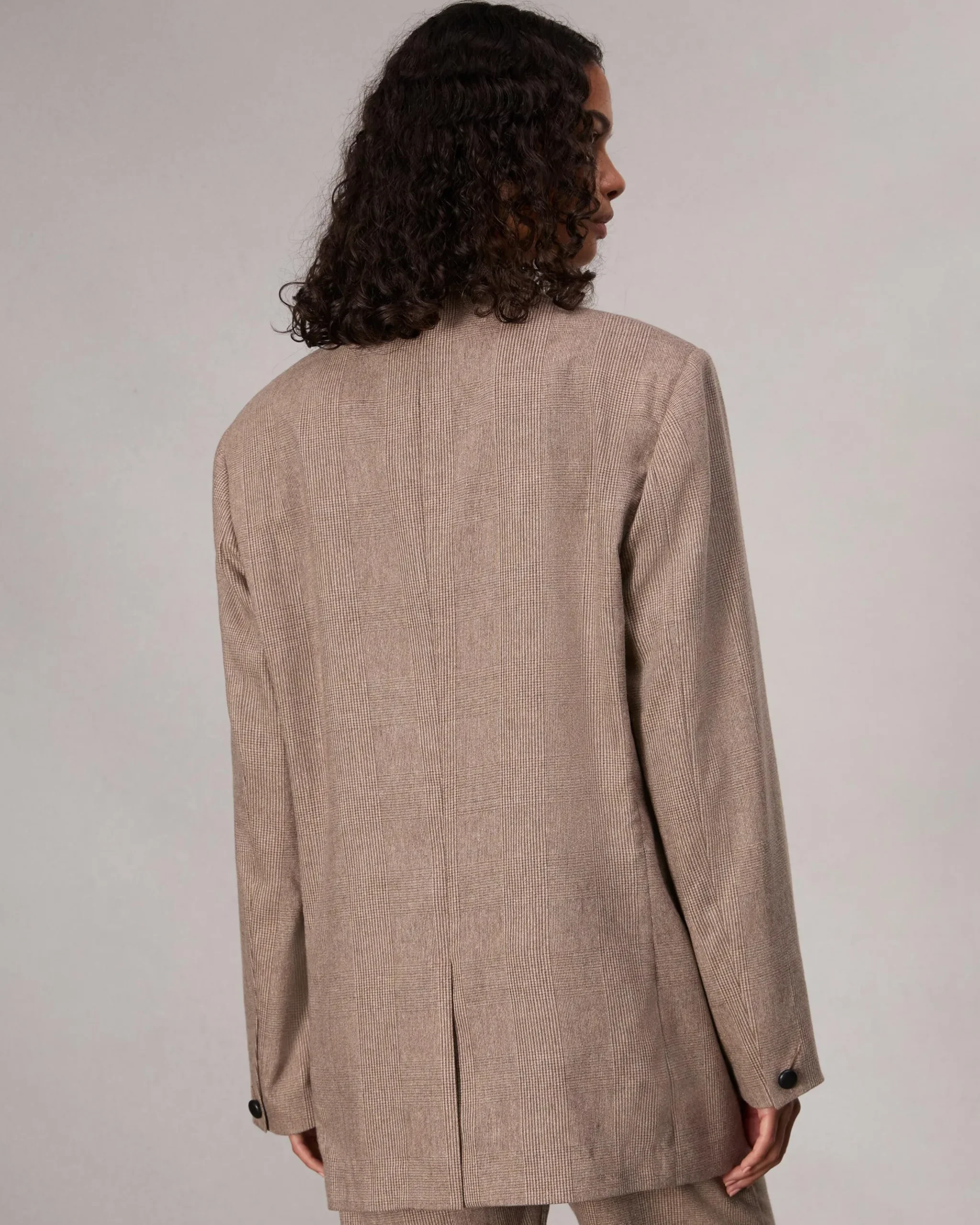 The new wardrobe essential. This take on the season’s oversized blazer is tailored from soft stretch wool with an understated glen plaid pattern. Its visual texture is complemented by faux leather buttons.