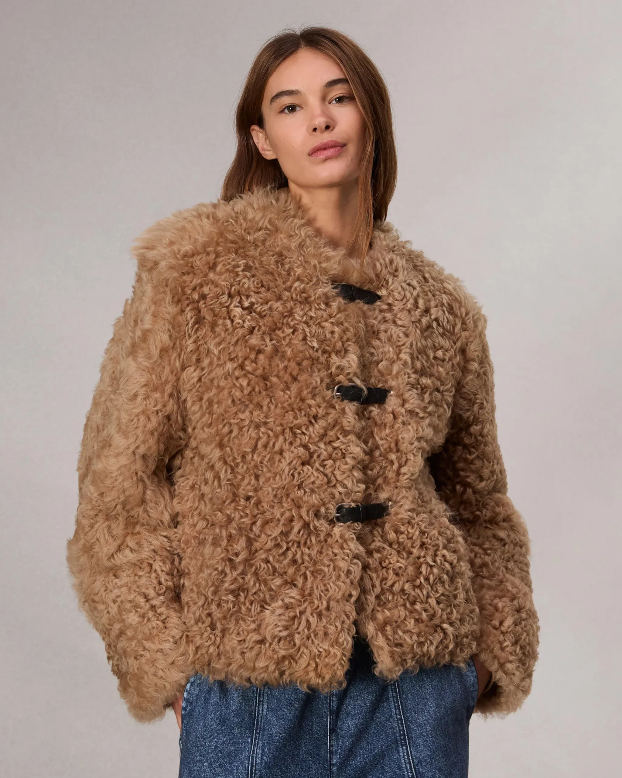 Curly, ultra-soft lamb shearling defines this standout collarless jacket, which is tailored for a slightly boxy silhouette that hits just below the waist. Leather buckles at the front create an intriguing contrast, whether worn open or closed.