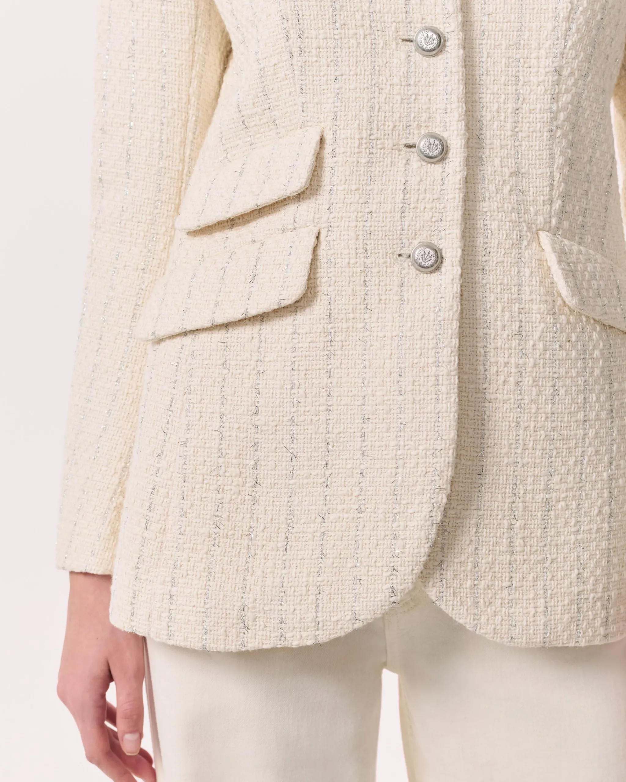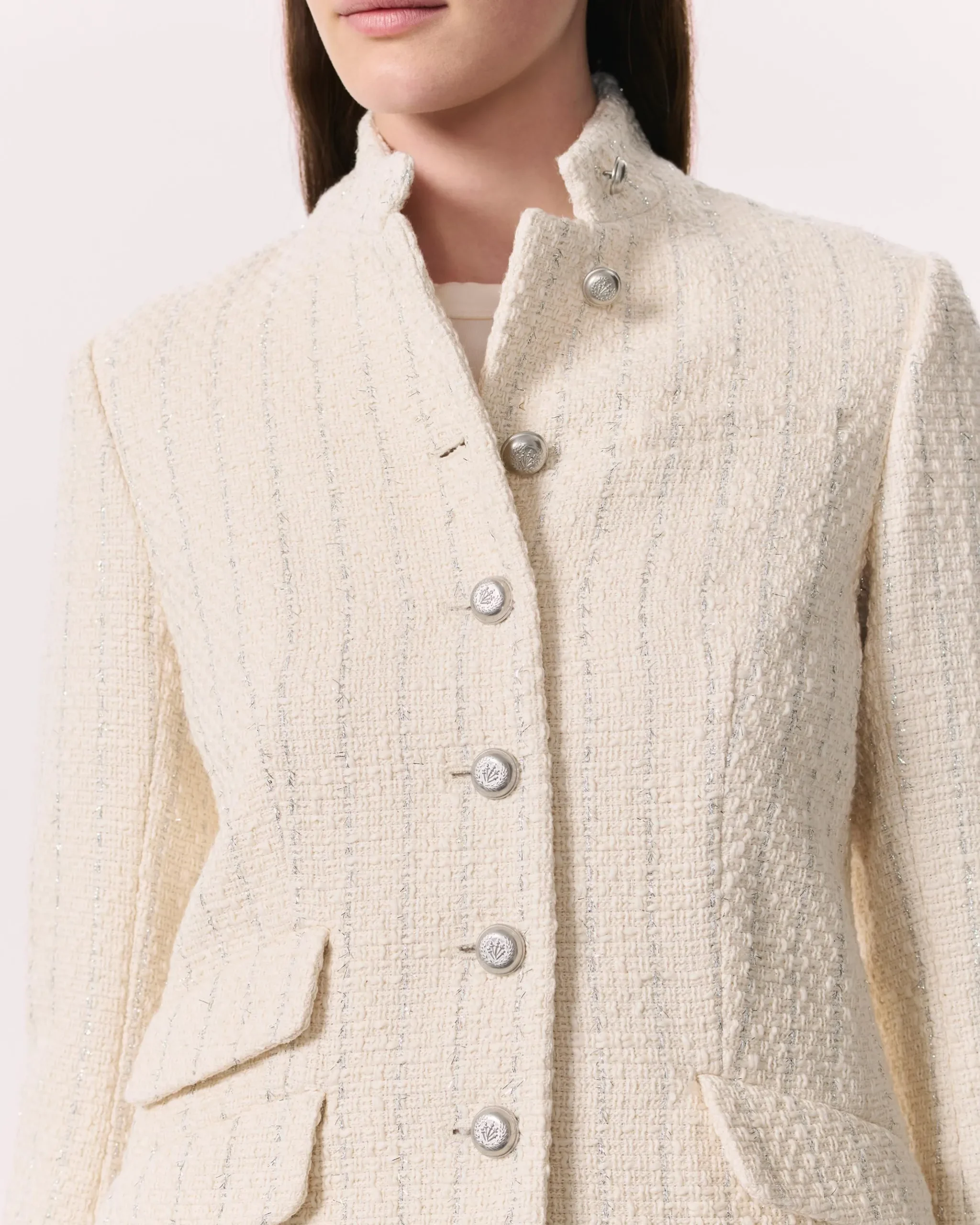 A rag & bone favorite. Crafted from a cotton-blend tweed with metallic silver stripes. Featuring a stand collar, this longer, slim-fit style perfectly blends the refinement of a blazer with the utility of a military jacket. Complete with braid-embossed metal buttons down the front.