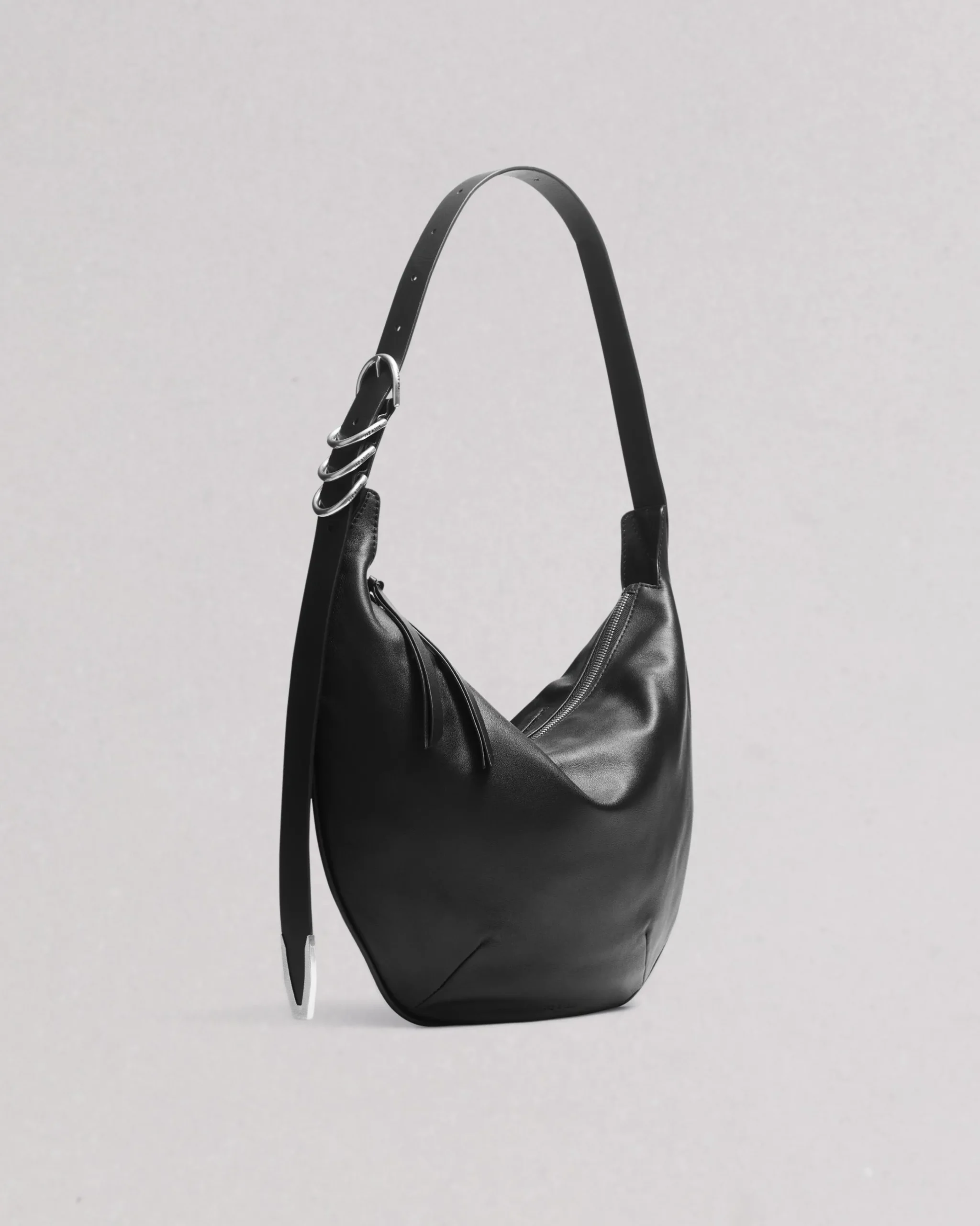 The Spire. Curved along a soft silhouette in soft responsibly-sourced leather, our signature crossbody features an adjustable strap secured with a trio of branded buckles. Detailed with slip pockets for easy access.