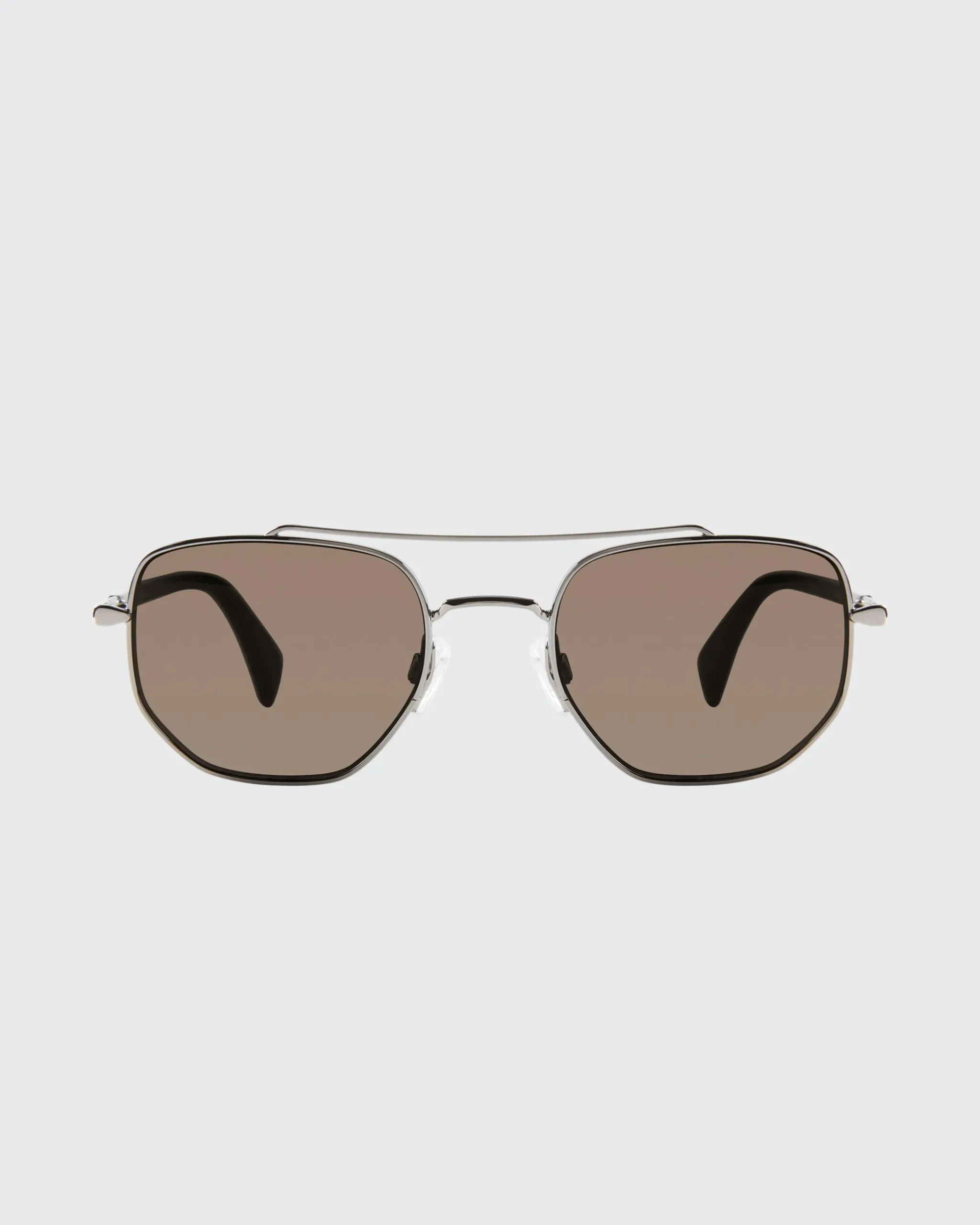 A rectangular geometrical eye silhouette with an stainless steel frame and 100% UV protection.