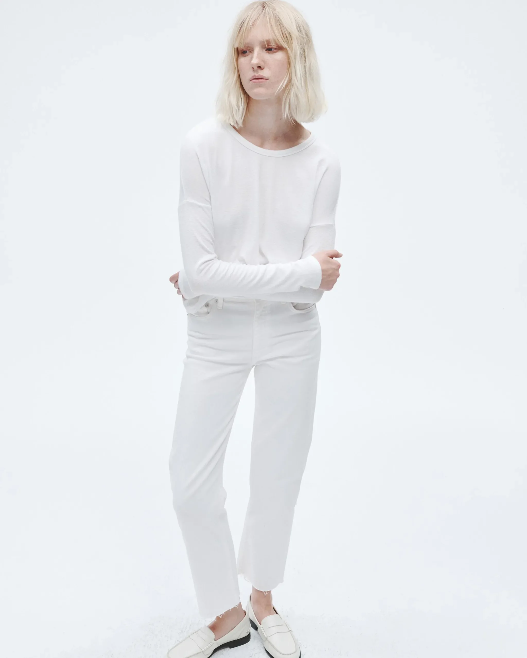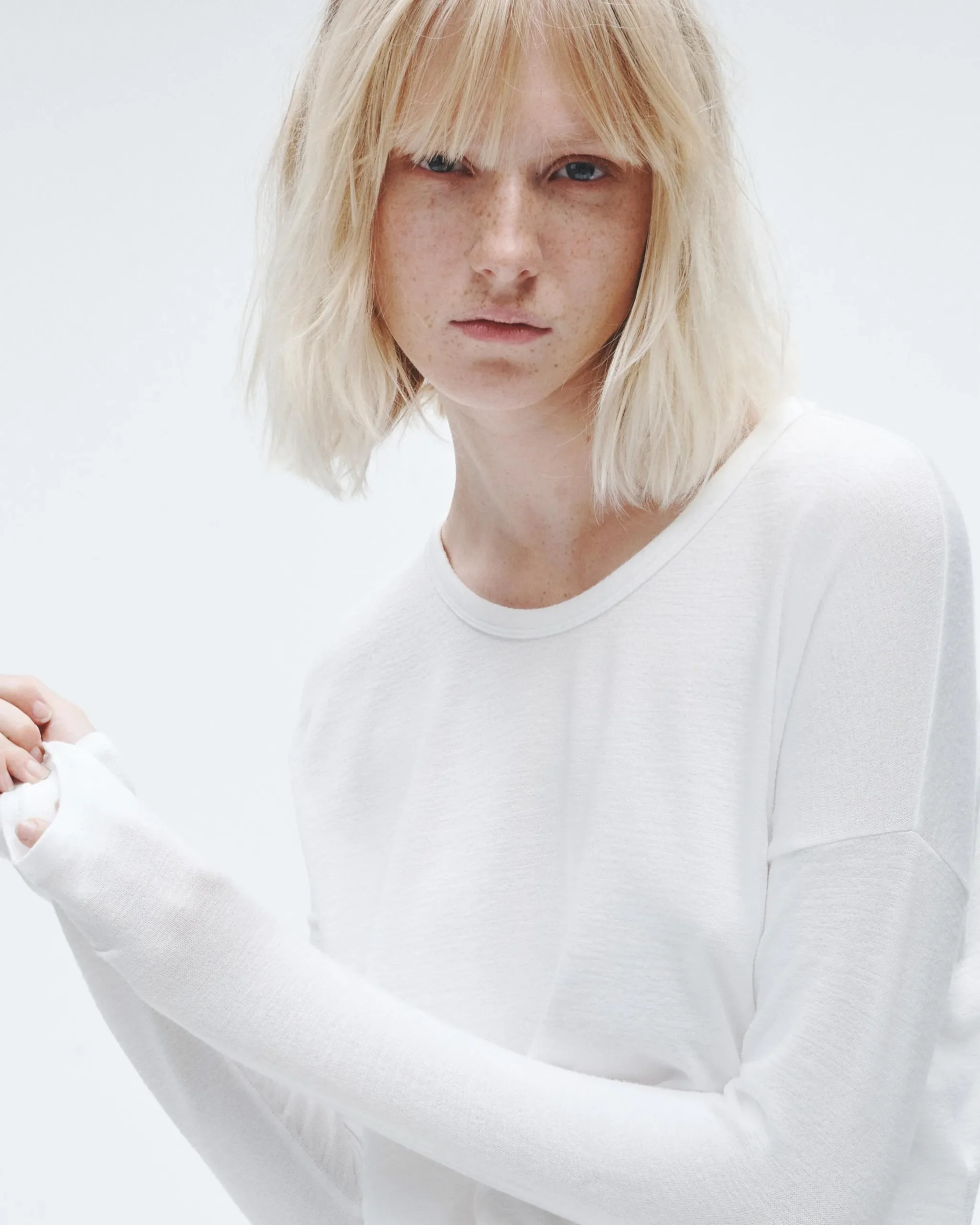 We took our classic Knit Long Sleeve Tee and updated it with a straight hem for a modern, relaxed fit. Woven in a rayon blend for a distinctly soft feel that makes this the perfect layering piece. Style with virtually anything in your closet.