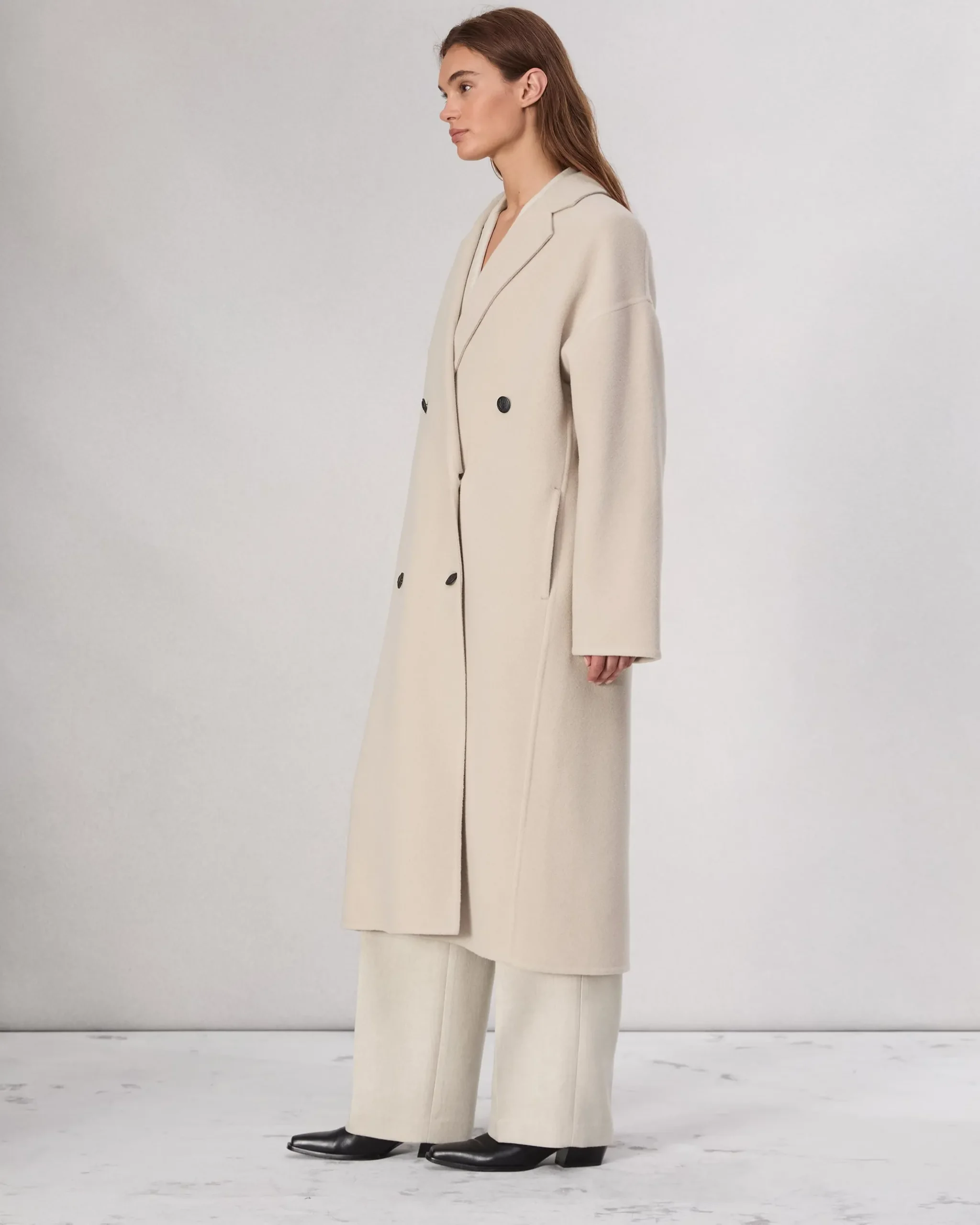 The Thea. Our longline coat is cut with a relaxed silhouette with substantial notched lapels in an Italian double-faced wool-blend.