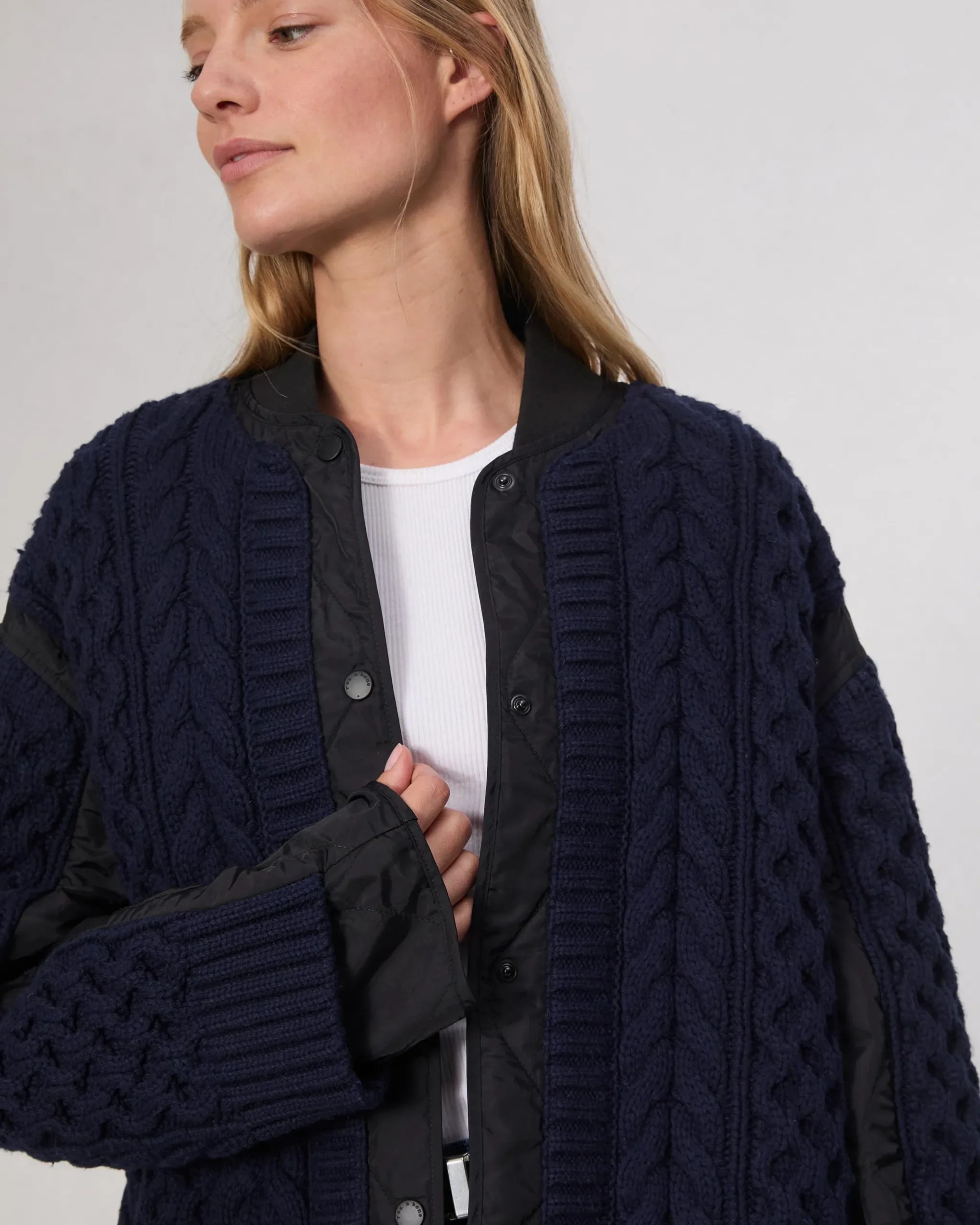 The Winnie. The coziness of a sweater meets the function of a liner. Snapped up the front to meet a bomber collar, our relaxed jacket is overlayed in a cable knit and lined with quilted nylon for a modern juxtaposition.