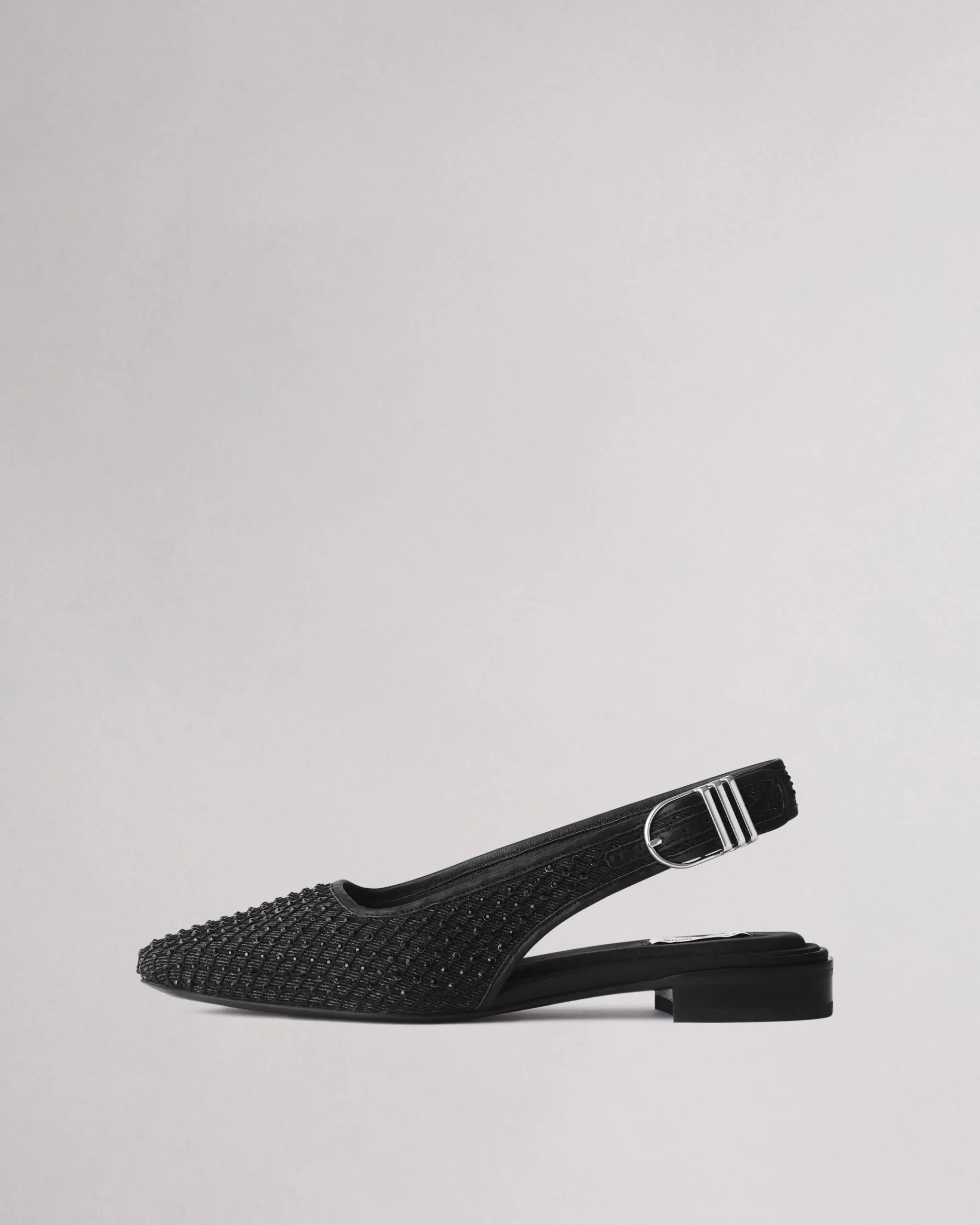 The Astra Slingback. A rag & bone favorite in a new context. This flat retains its quintessential tapered square toe, now with a slingback. In denim overlayed with diamante mesh. Crafted with dual-density antimicrobial foam insoles: OrthoLite® Lazy-Hybrid™ for custom-fit comfort, and OrthoLite® Recycled for stability and support.