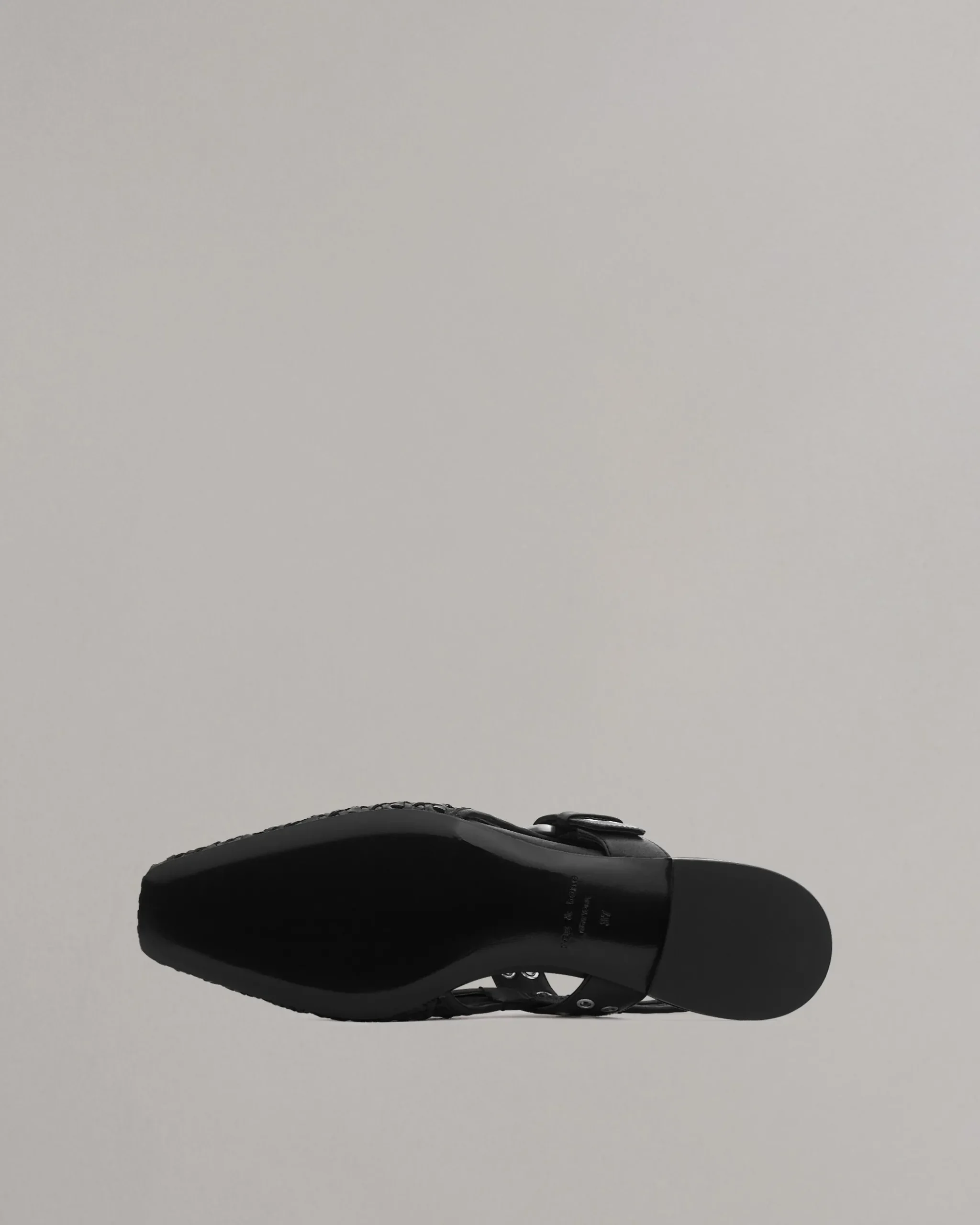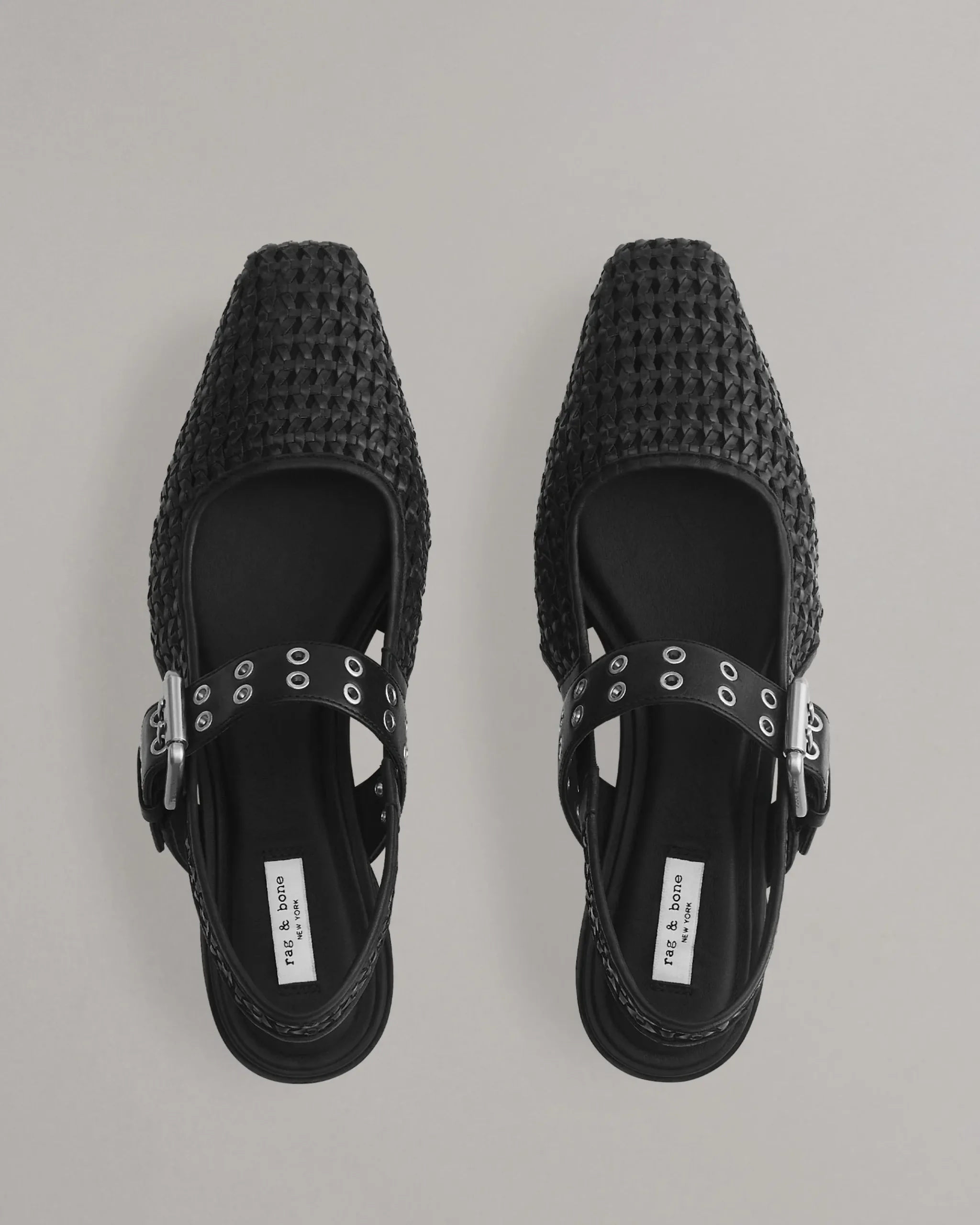 A rag & bone favorite in a new context. This flat style retains its quintessential tapered square toe, but is secured with a slingback and a Mary Jane strap, all in woven faux leather. Inside, you’ll find dual-density antimicrobial foam insoles: OrthoLite® Lazy-Hybrid™ for custom-fit comfort, and OrthoLite® Recycled for stability and support.