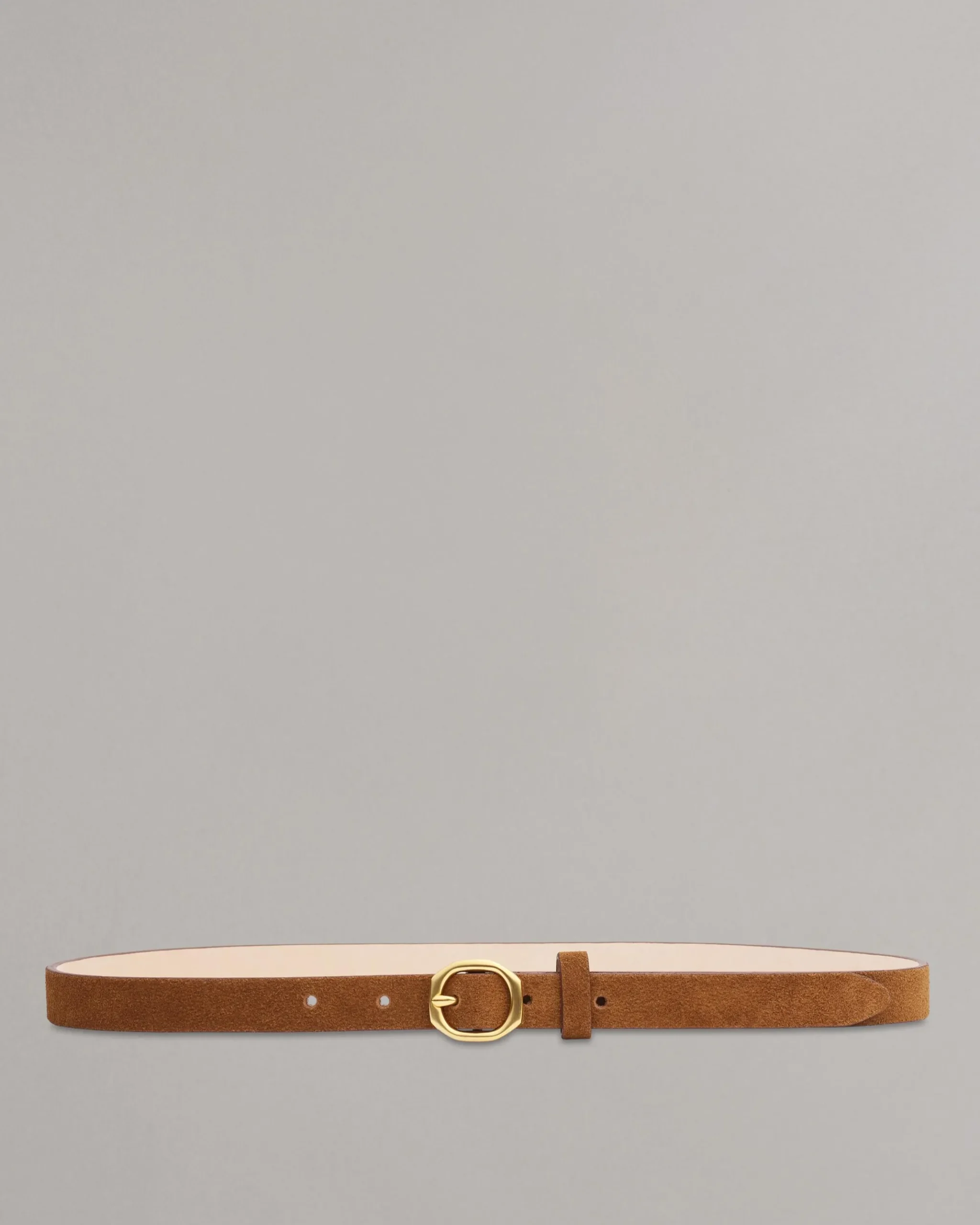 Made from soft suede, this slimmer, wear-with-anything belt is secured with a rounded geometric buckle.