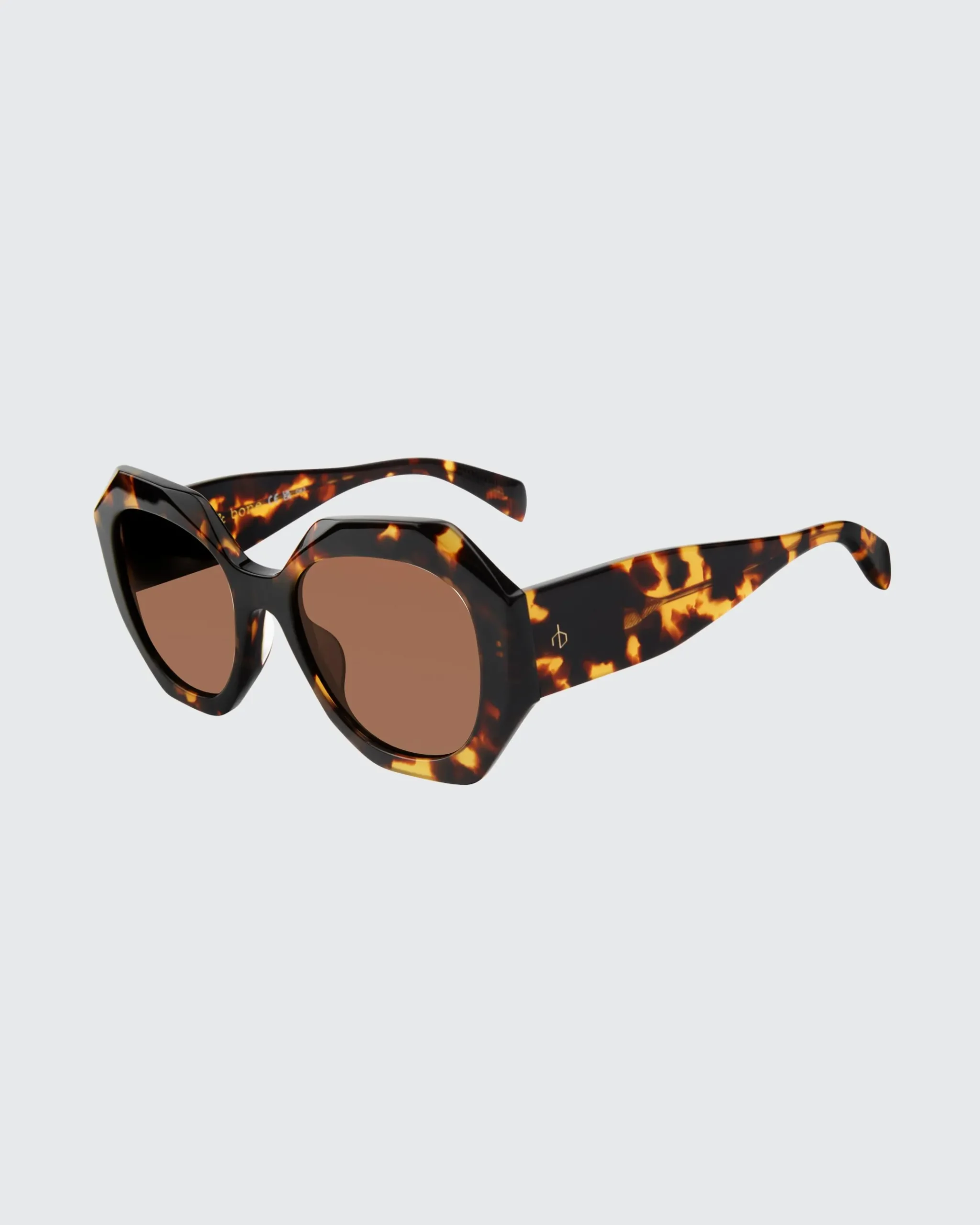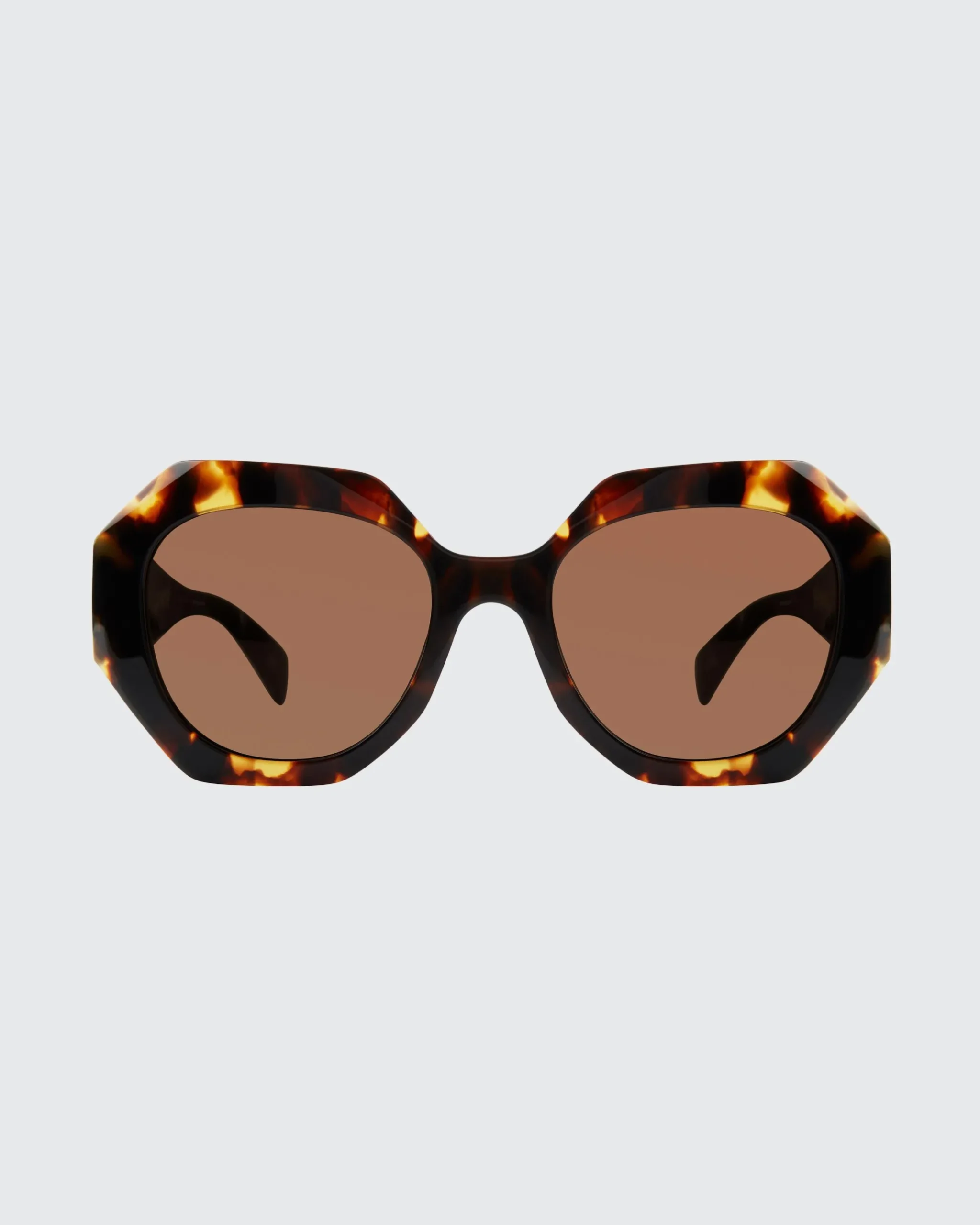 A rectangular geometrical eye silhouette with an acetate frame and 100% UV protection.