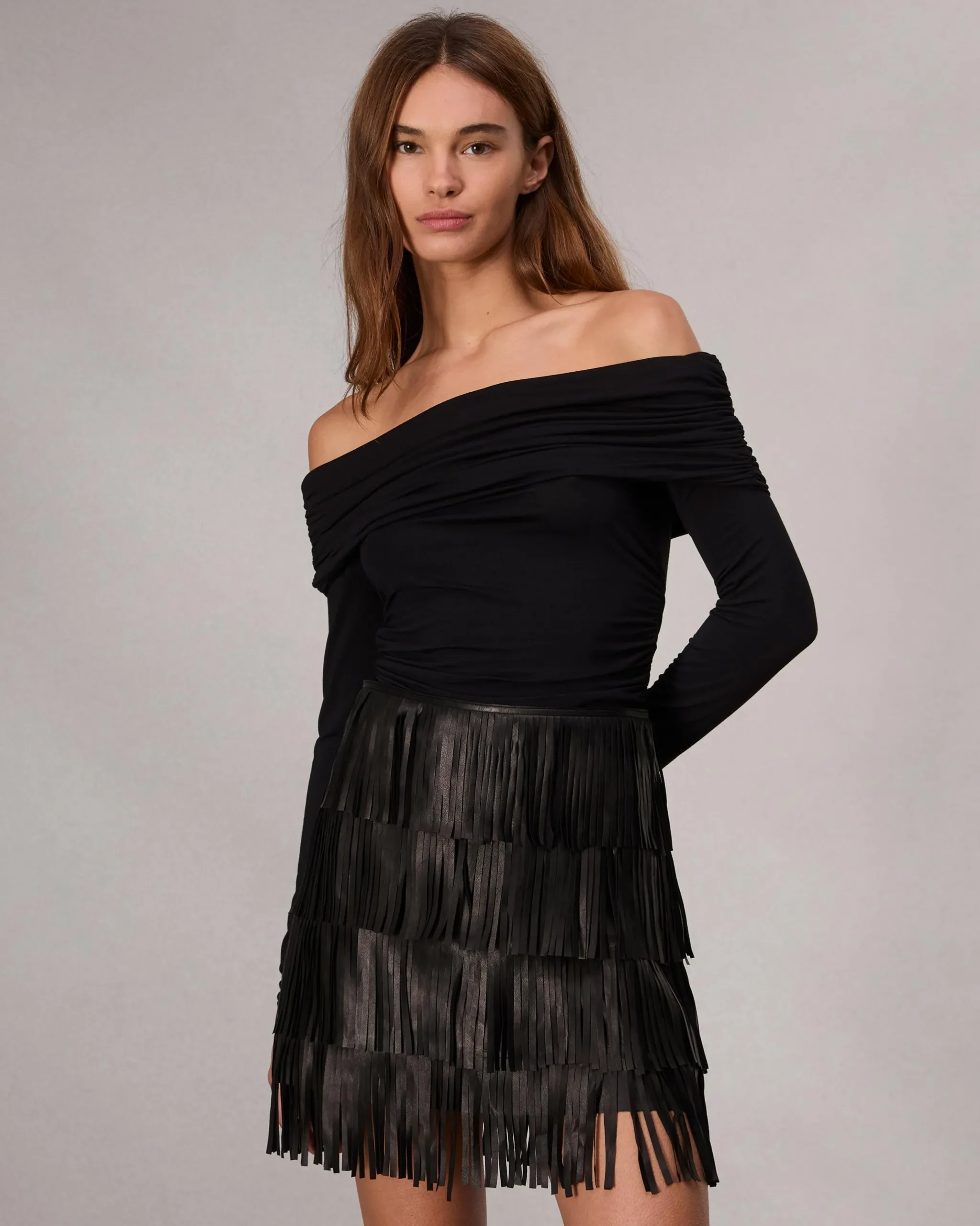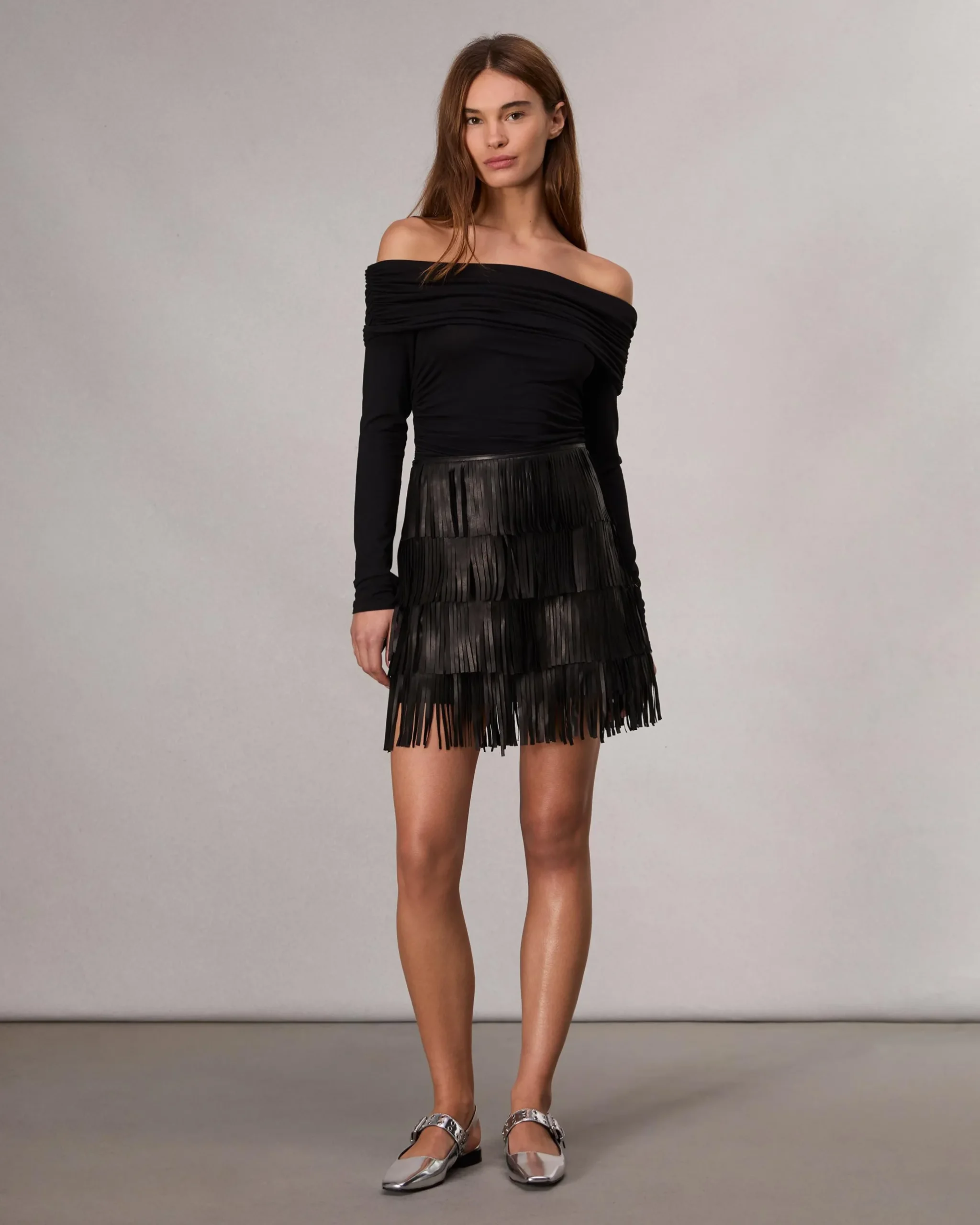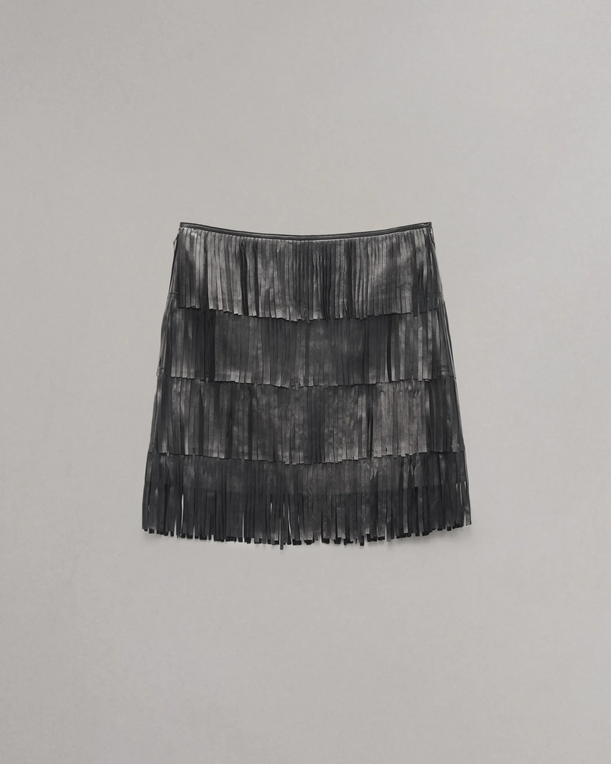 Super-soft lamb leather is cut by hand to form the fringed tiers of this high-rise mini skirt, giving it dynamic texture and dimension with every move.