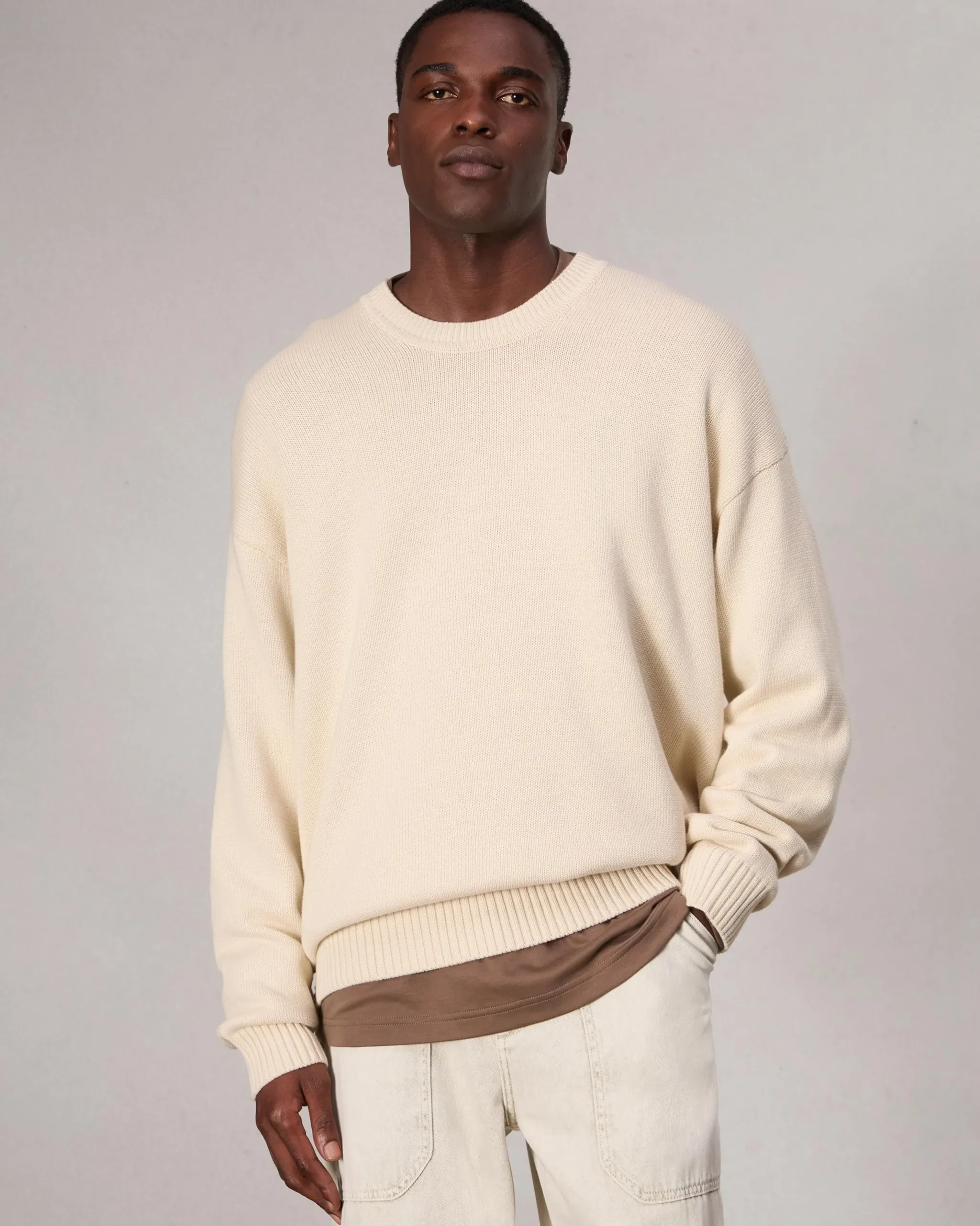 Your classic crewneck sweater, with a subtle twist: contrast whipstitching up the side and sleeve seams. Take your typical size for a looser look, or size down for a closer fit.
