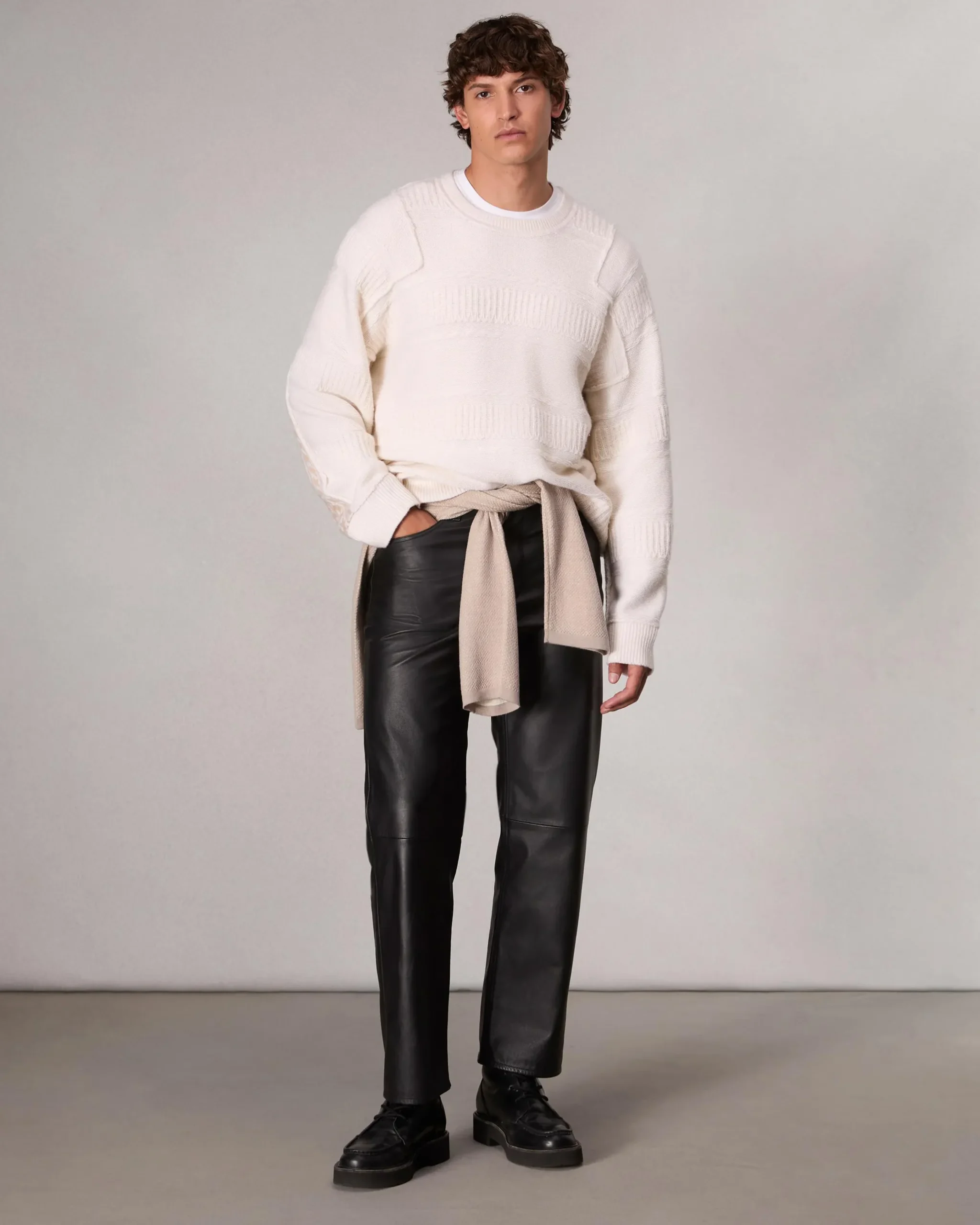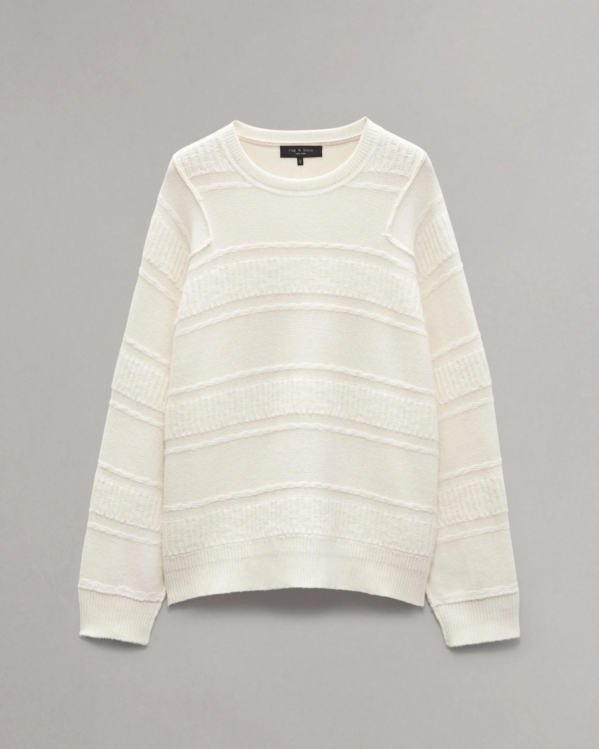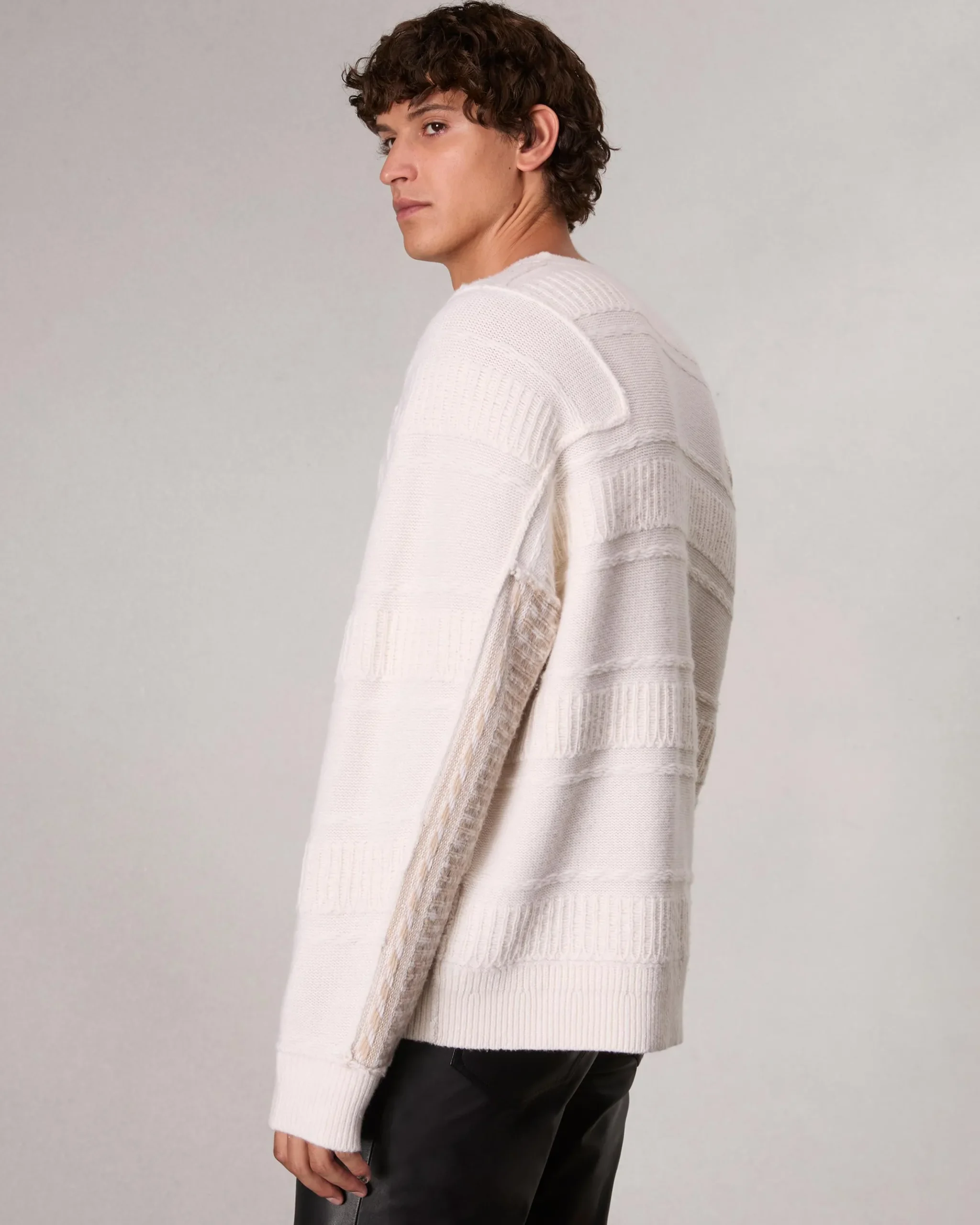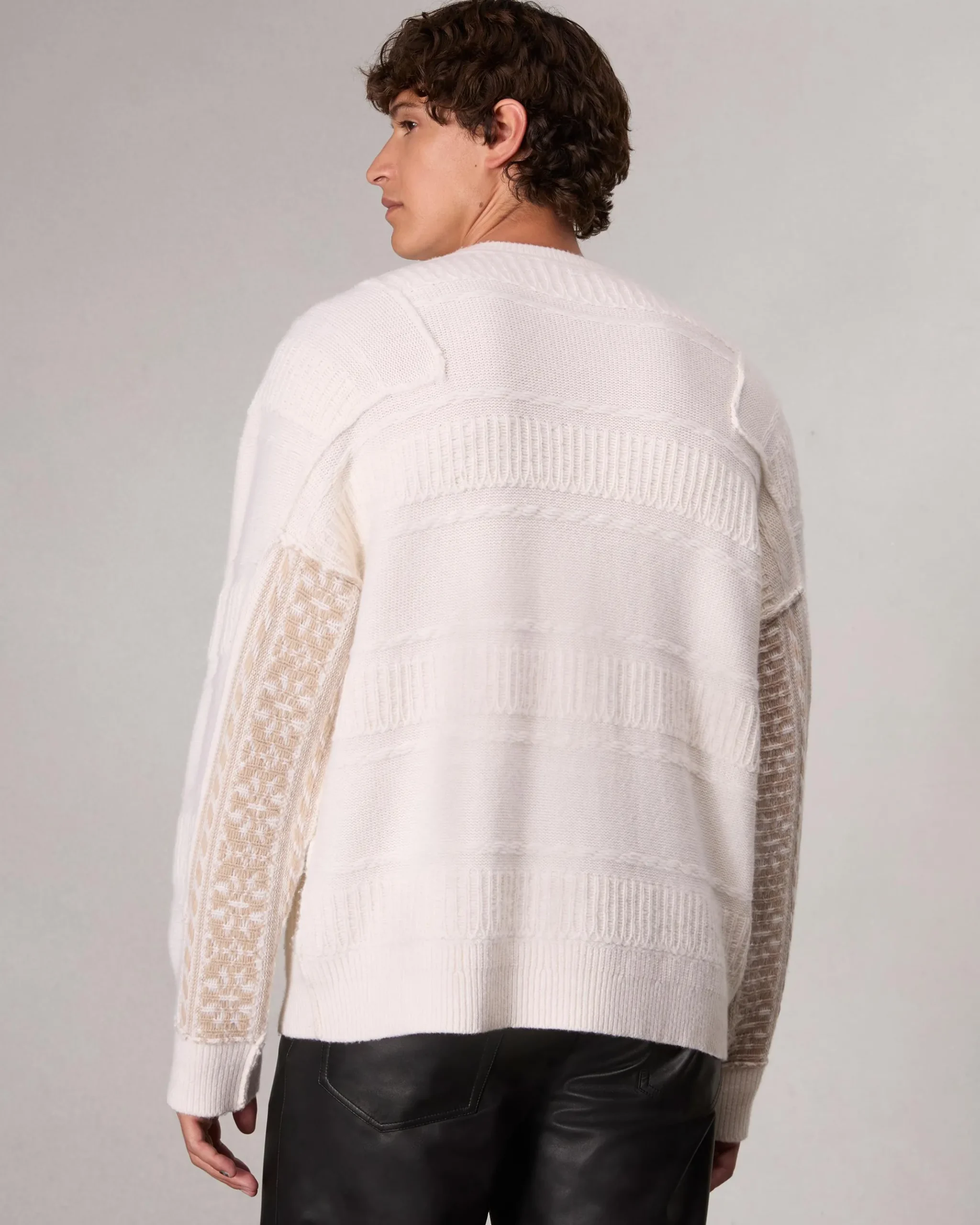This slightly oversized sweater is knit from a soft merino wool blend with a variety of textured stitches. Under the sleeves, a modern take on Fair Isle patterns adds a distinctive contrast. Take your typical size for a looser look, or size down for a closer fit.