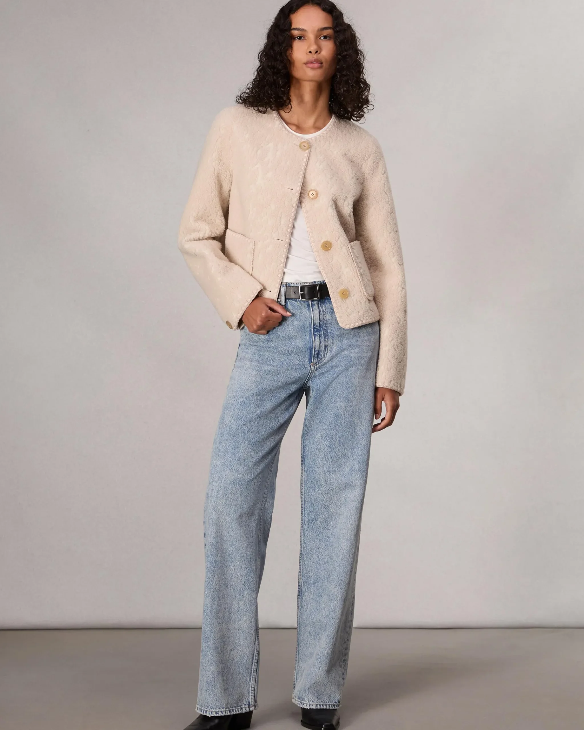 Classics. For a new era. The season’s lady jacket silhouette gets a modern update with plush faux shearling and tonal blanket stitches along the edges.
