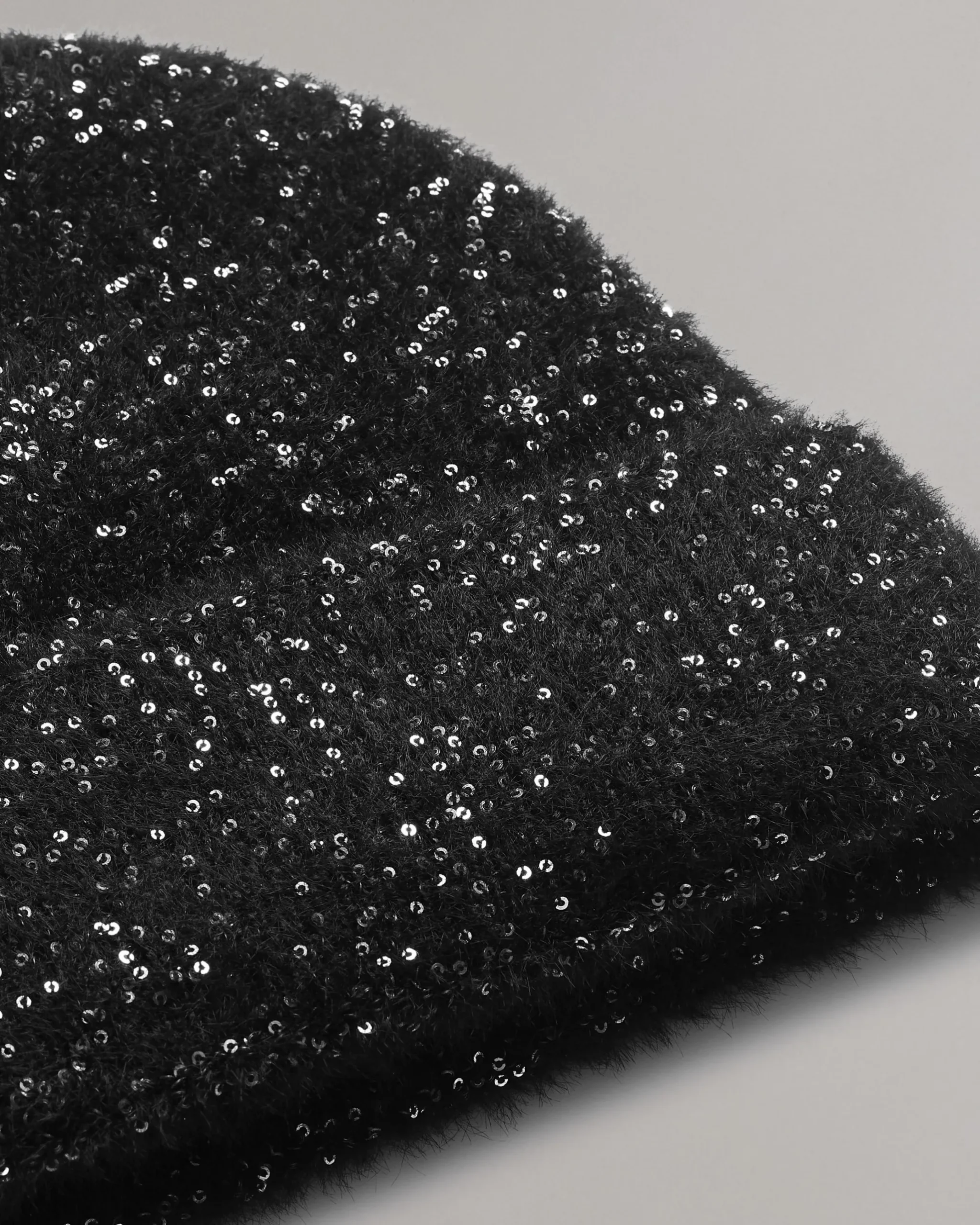 Shine bright. This cozy beanie hat is rib-knit from fuzzy sequin yarn and finished with a fold-over brim.