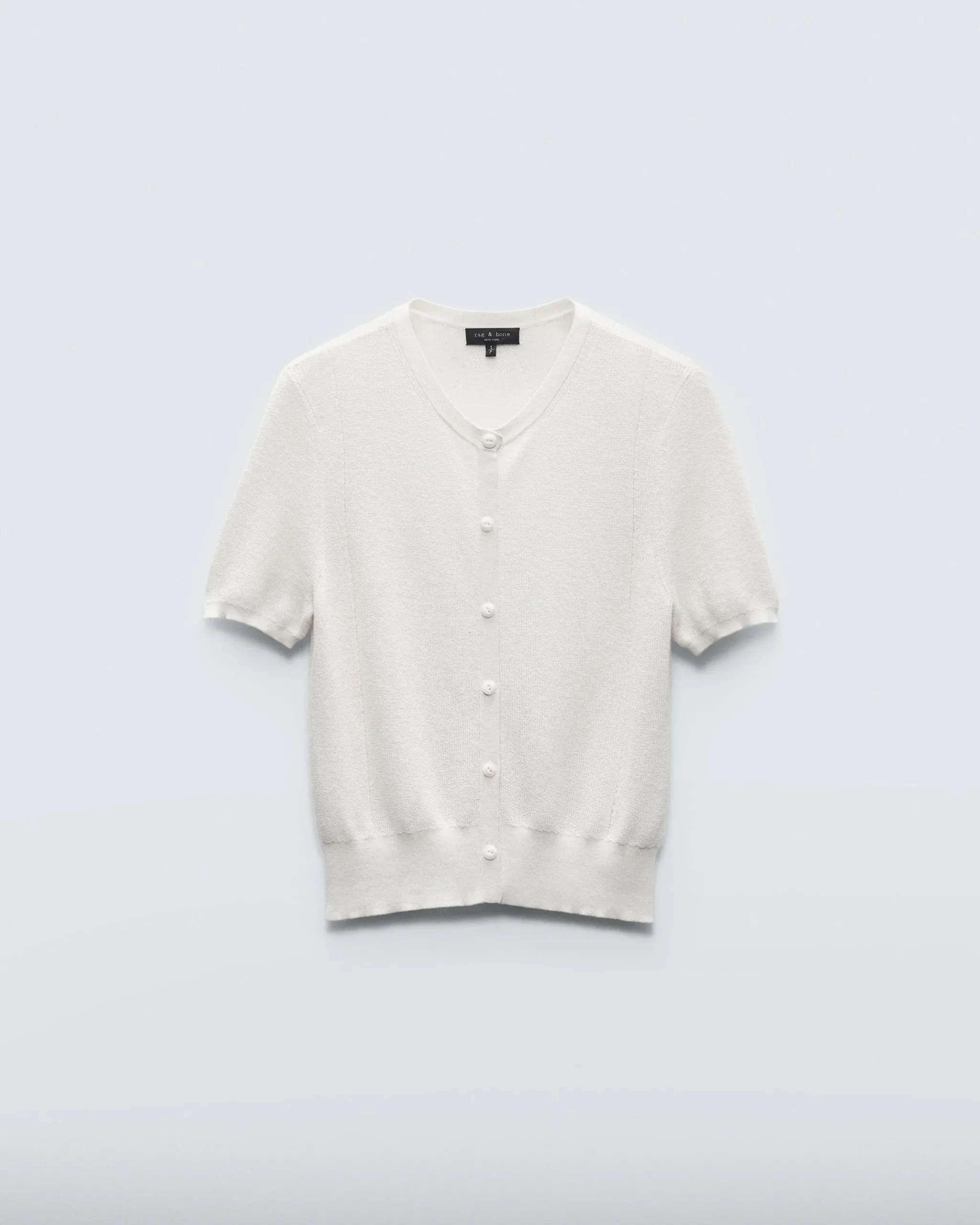 This fitted short sleeve cardigan is crafted from a stretch cotton linen blend for the perfect fit. Complete with recycled buttons down the center front.