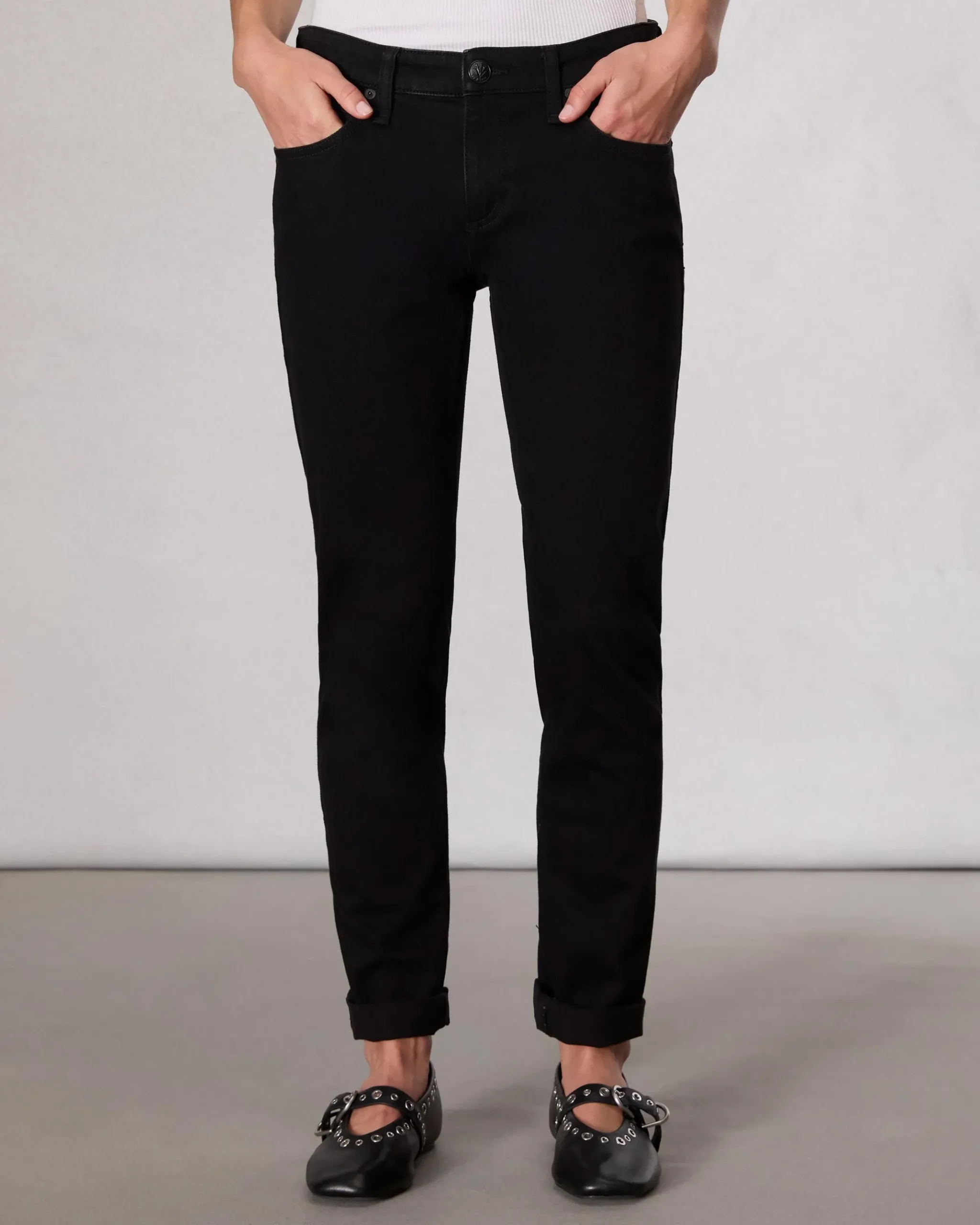 The Dre Slim Boyfriend. Low-rise slim-fit jeans pulled straight from the archives and updated for today, with double-rolled cuffs that can be unrolled. Crafted from our Vintage Stretch denim for a timeworn look with added comfort. In pure Black.