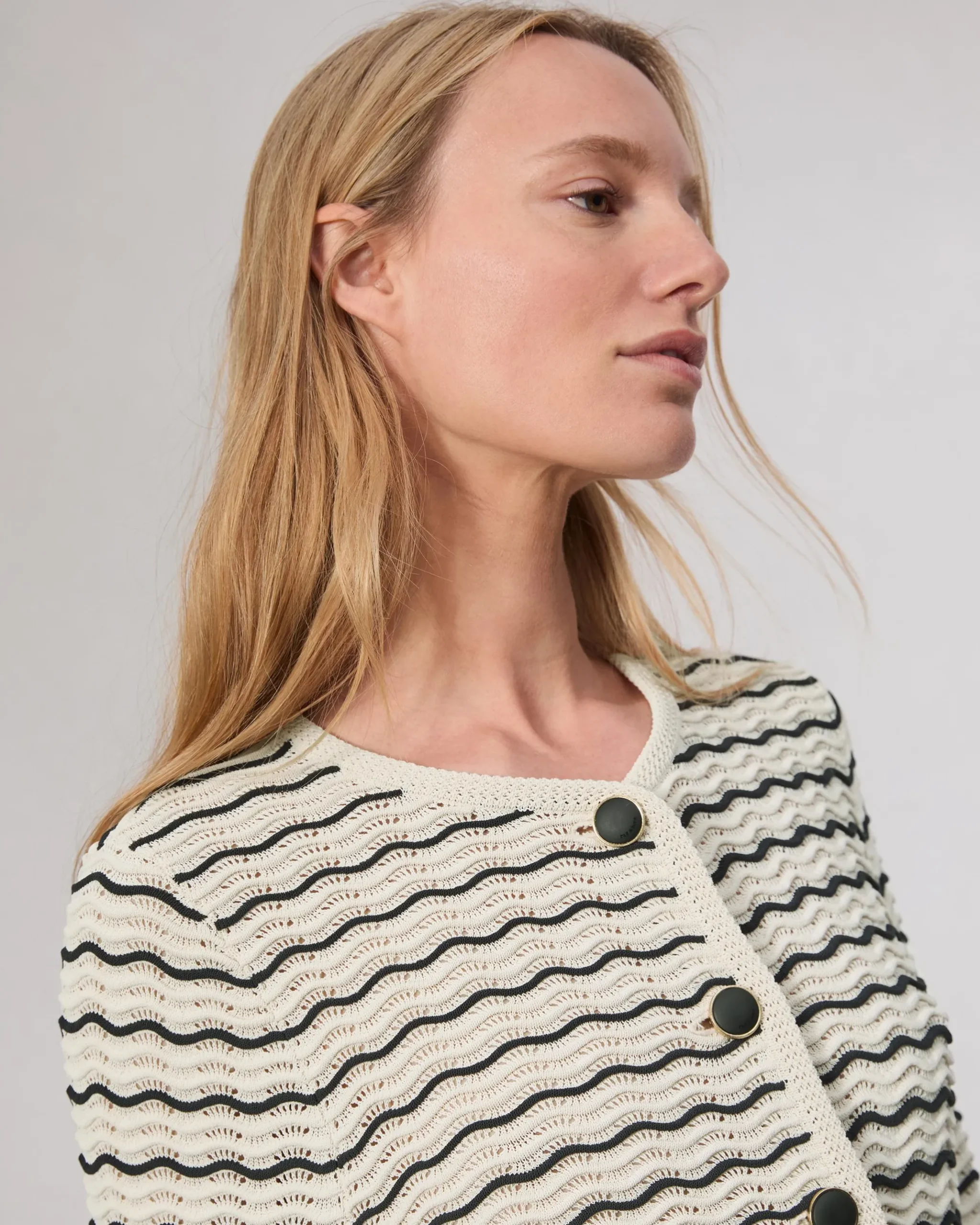 The Elisa. Instantly polishes any look. Our favorite new layer is knit in stripes of cotton-blend with a subtle wavy texture with metal buttons down the front.