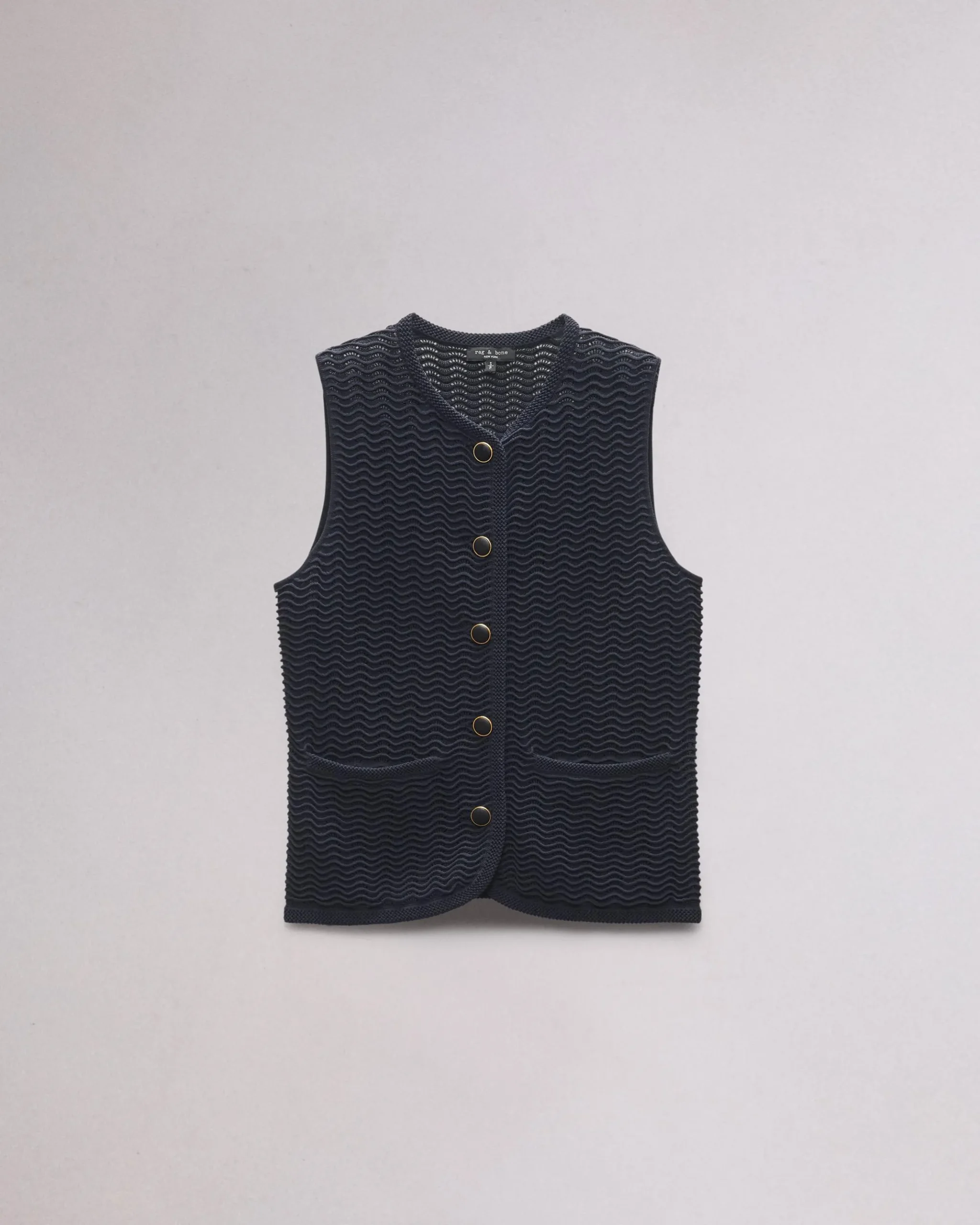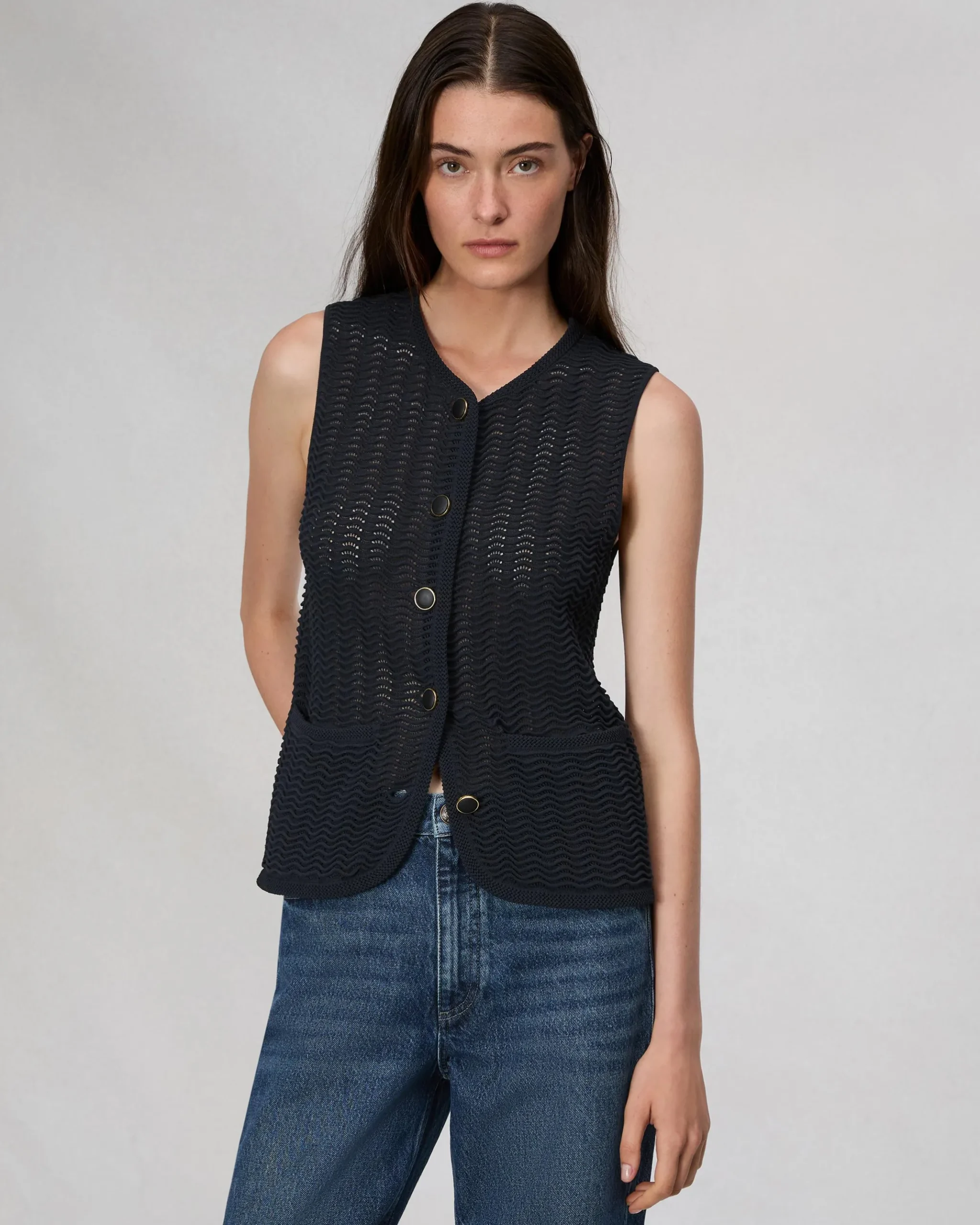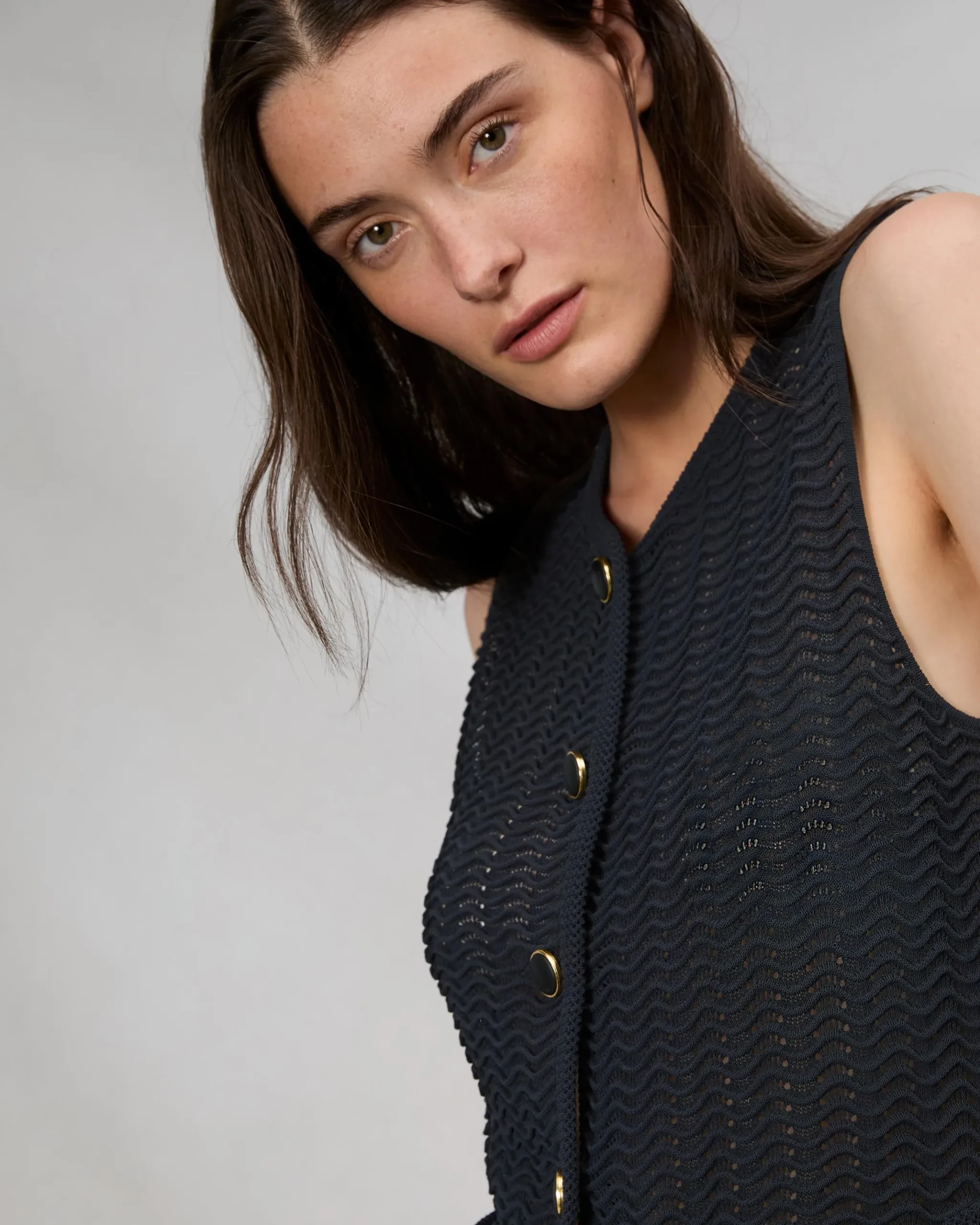 The Elisa. Instantly polishes any look. Our favorite new vest is knit in cotton-blend with a subtle wavy texture with metal buttons down the front.