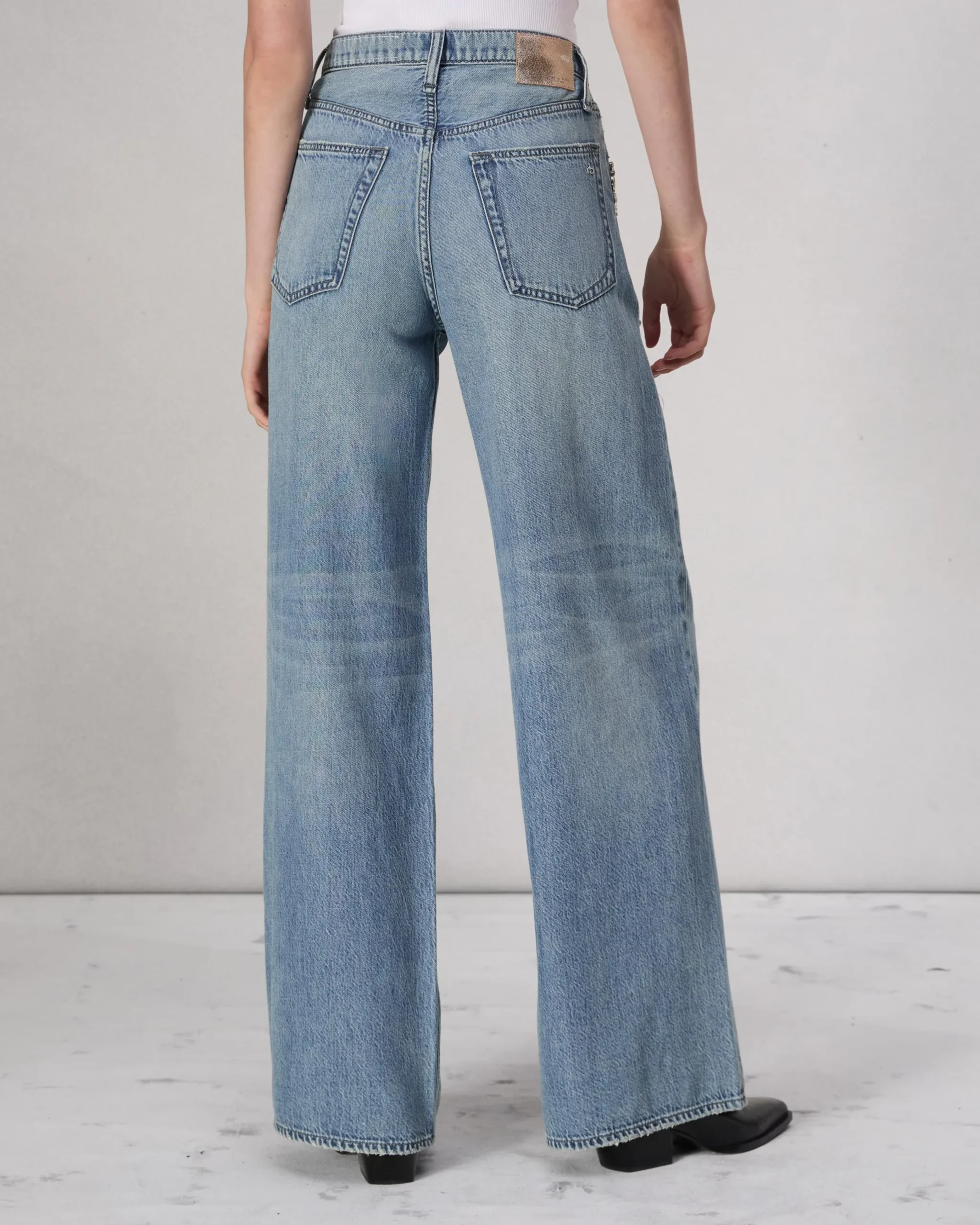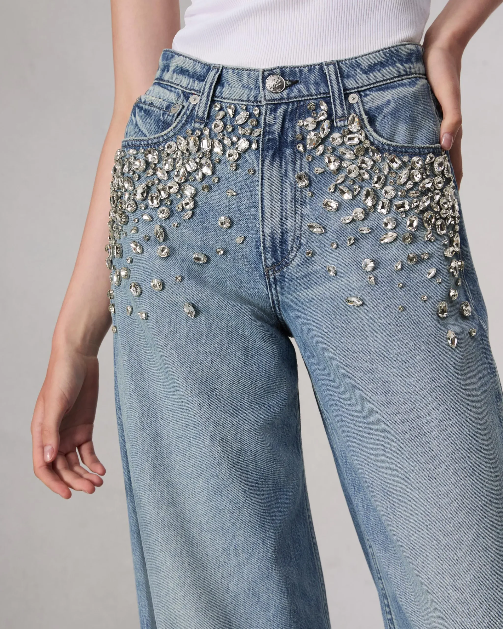 The Sofie. A high-rise fit with a full wide leg that’s a rag & bone office favorite. Crafted in our Featherweight denim that’s made with Tencel, for a jean that’s light and supremely soft. In Mali, a light indigo wash adorned with hand-applied jewels on the front body with a clean, finished hem.