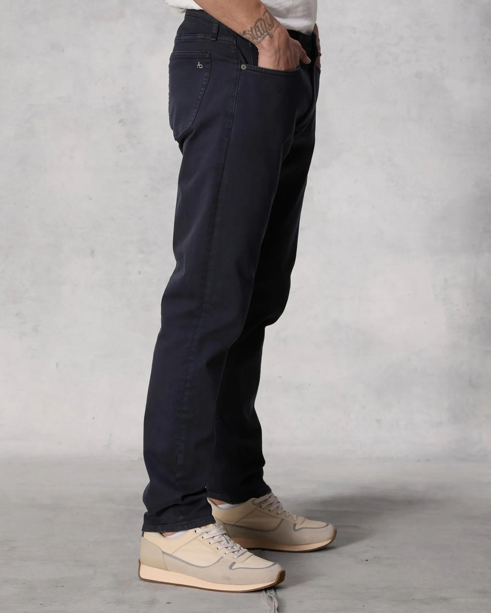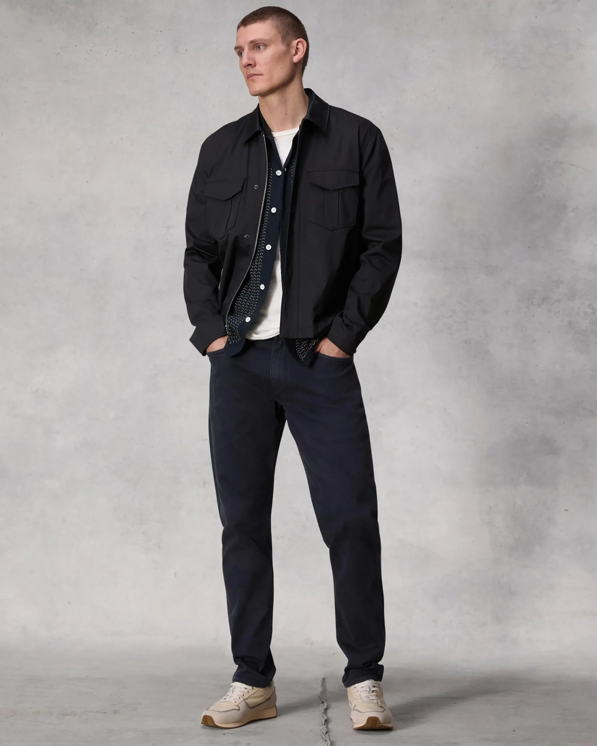 Fit 2. Our best-selling fit. Mid-rise with a slim fit and a tailored leg. Constructed in Aero Stretch – lightweight, modern comfort with superior stretch and retention. In navy garment dye with a clean hem.