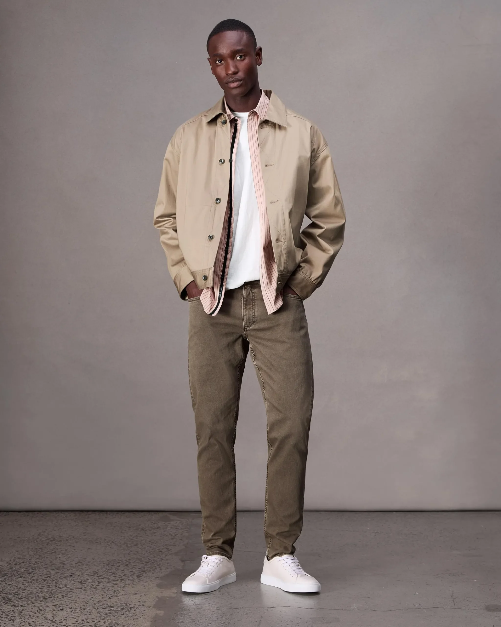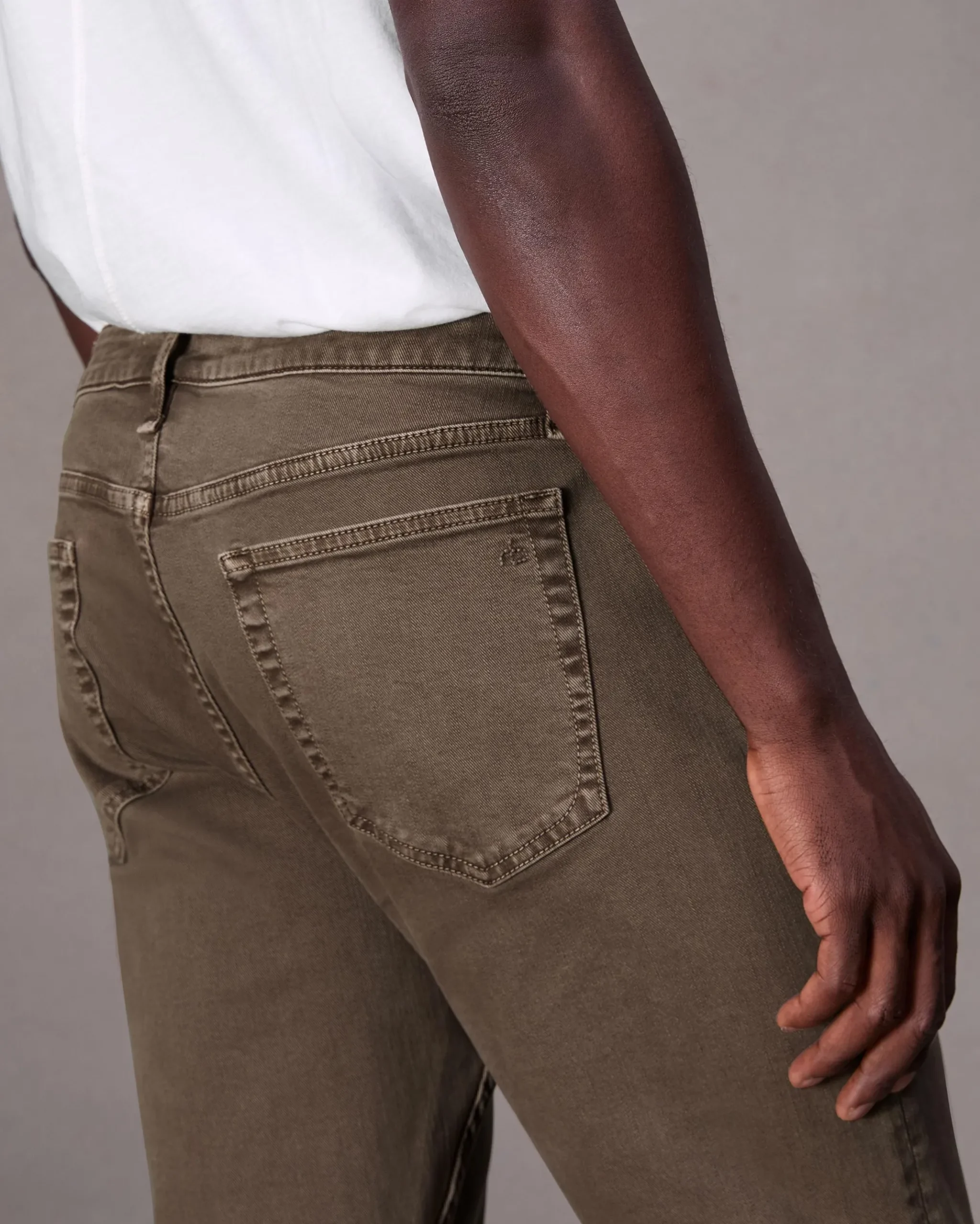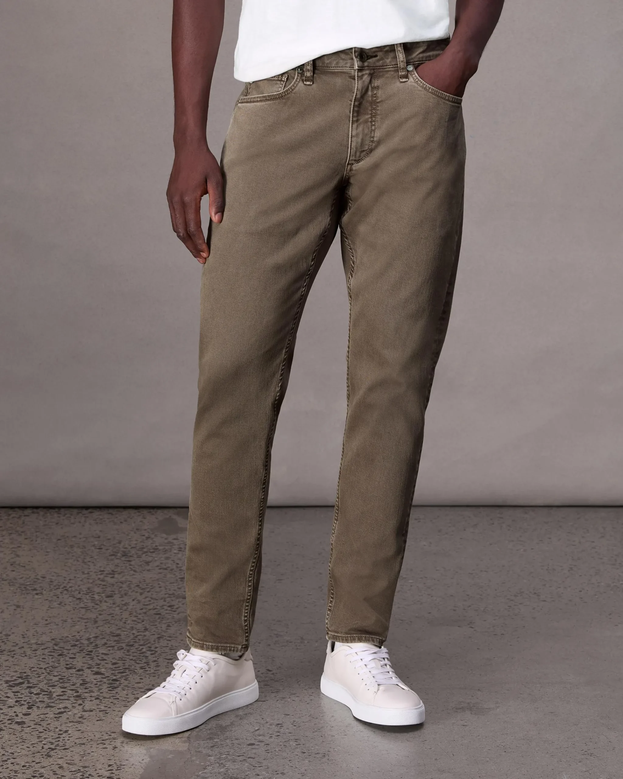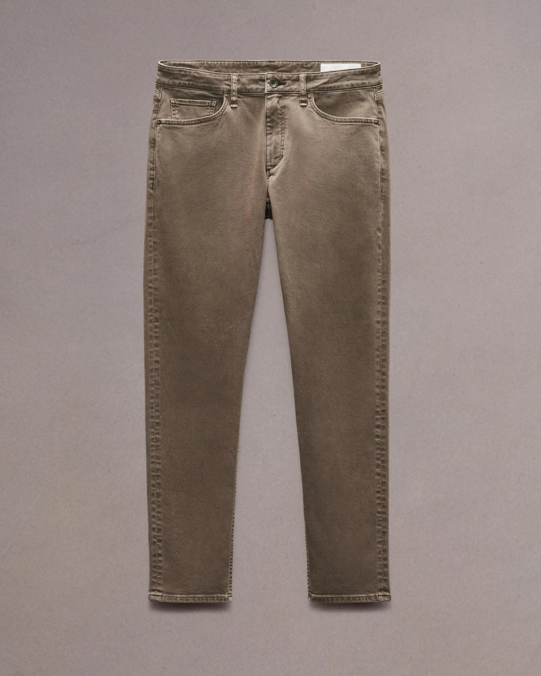91%Cotton 8%Polyester 1%ElastaneAero stretch in ash brownMachine wash cold with like colors, color may bleed, line dry.Dark mudd shank at center front and dark mudd rivetsZipper flyFive-pocket silhouetteImported