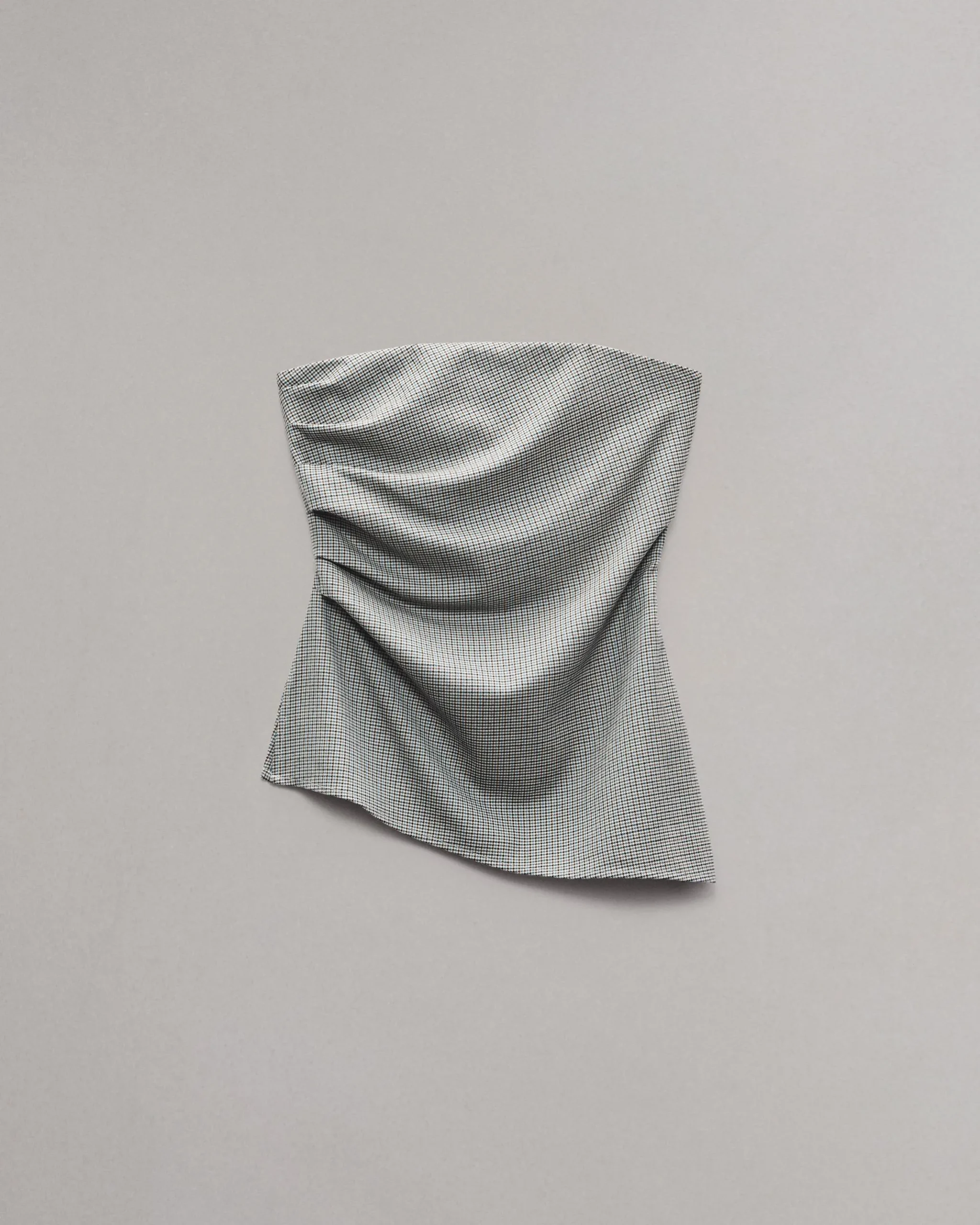 We tailored this trim strapless top from a wool-blend houndstooth plaid. A built-in shelf bra keeps things streamlined.