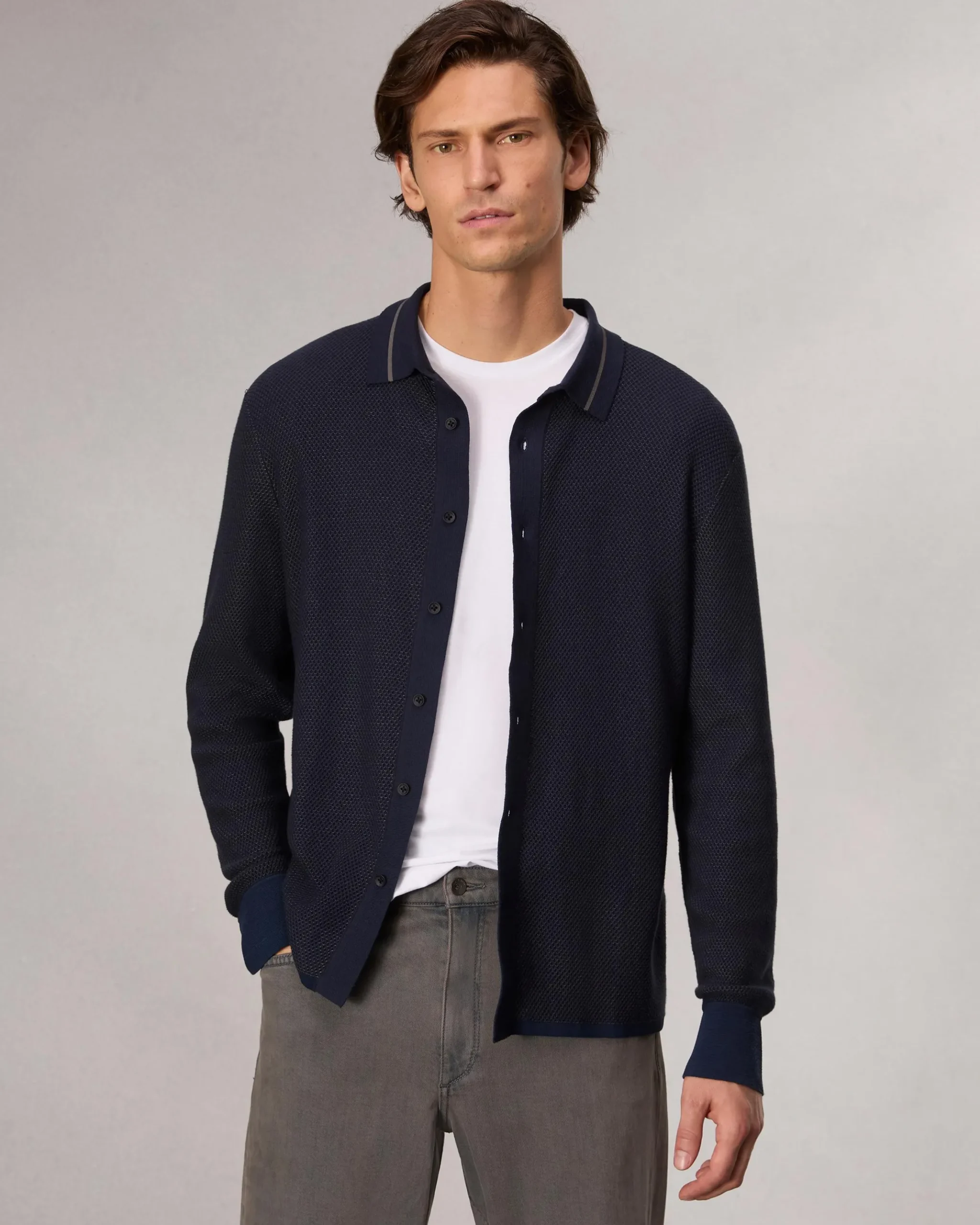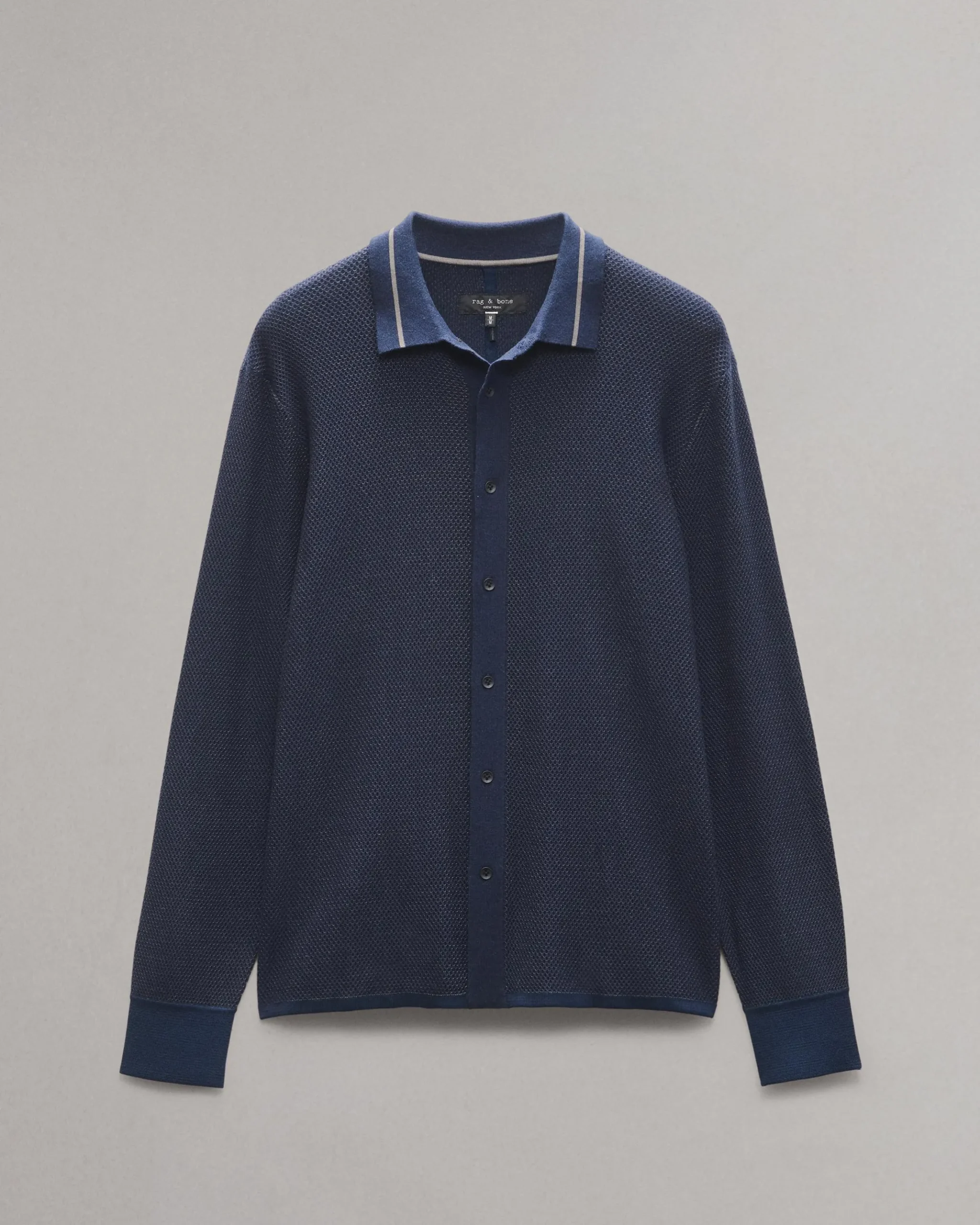 The comfort of a sweater meets the sophistication of shirting. Knit from a lightweight cotton blend with a vintage-inspired texture, this long-sleeve shirt is tailored with a striped point collar and a classic fit. Wear it buttoned-up or undone over a T-shirt.
