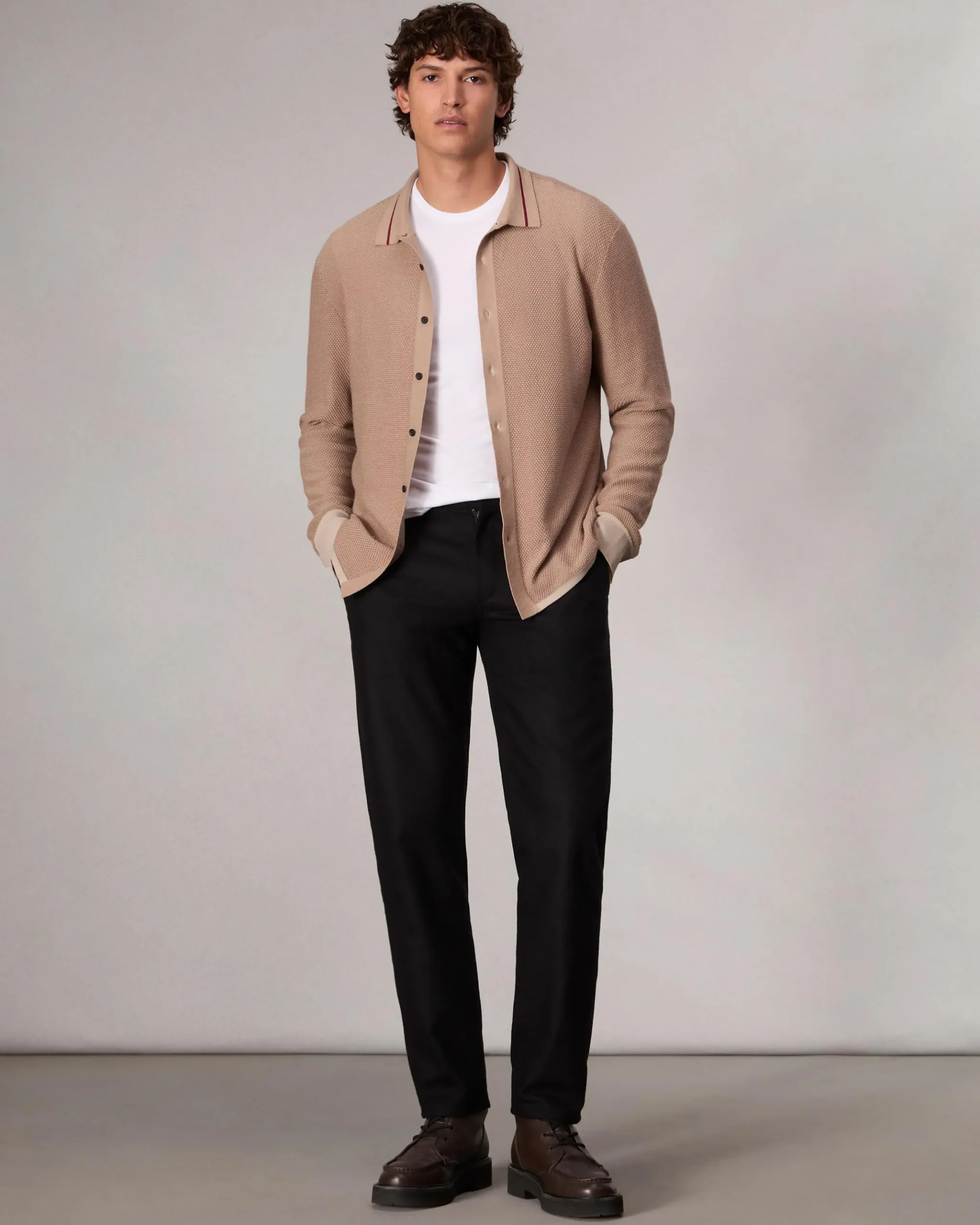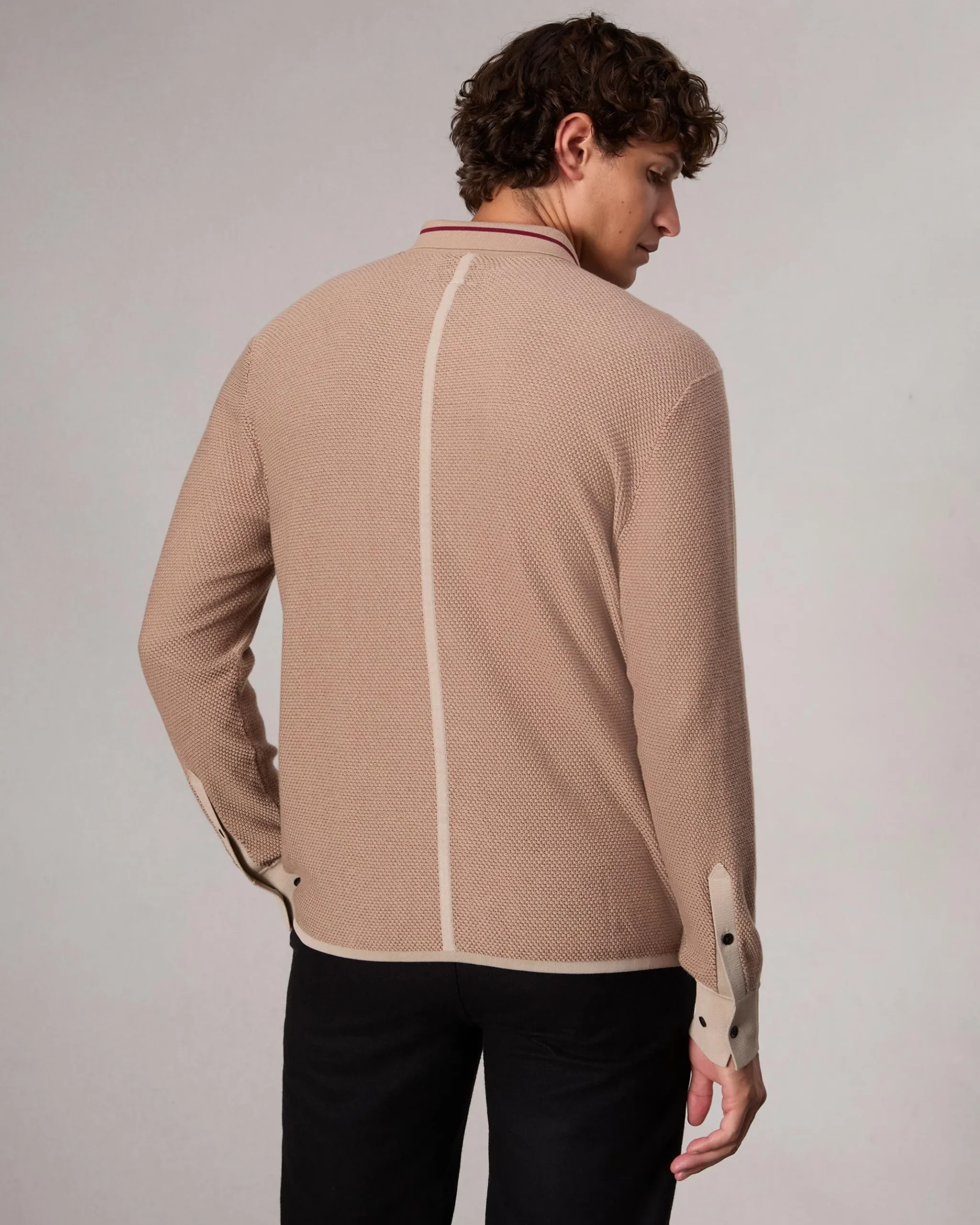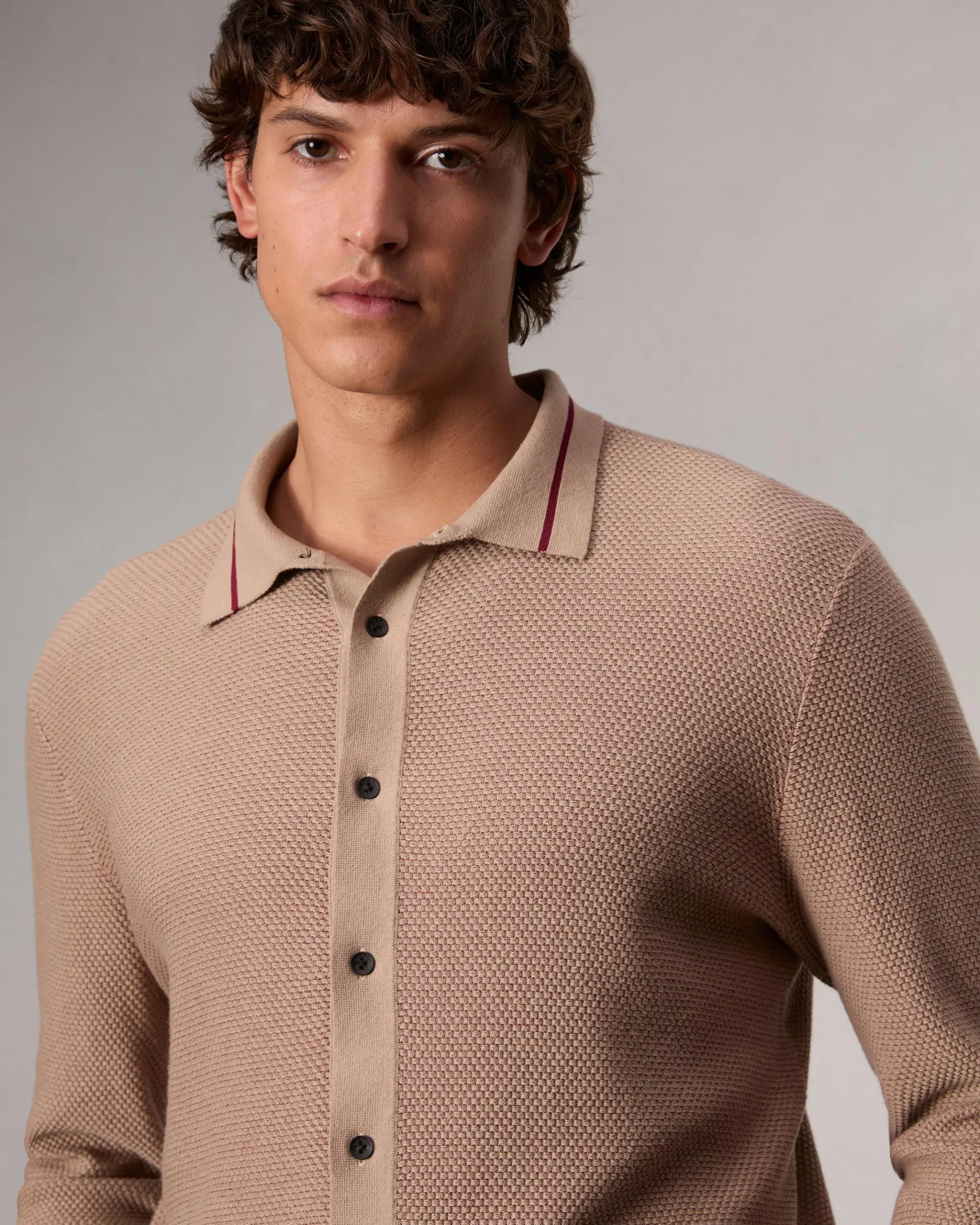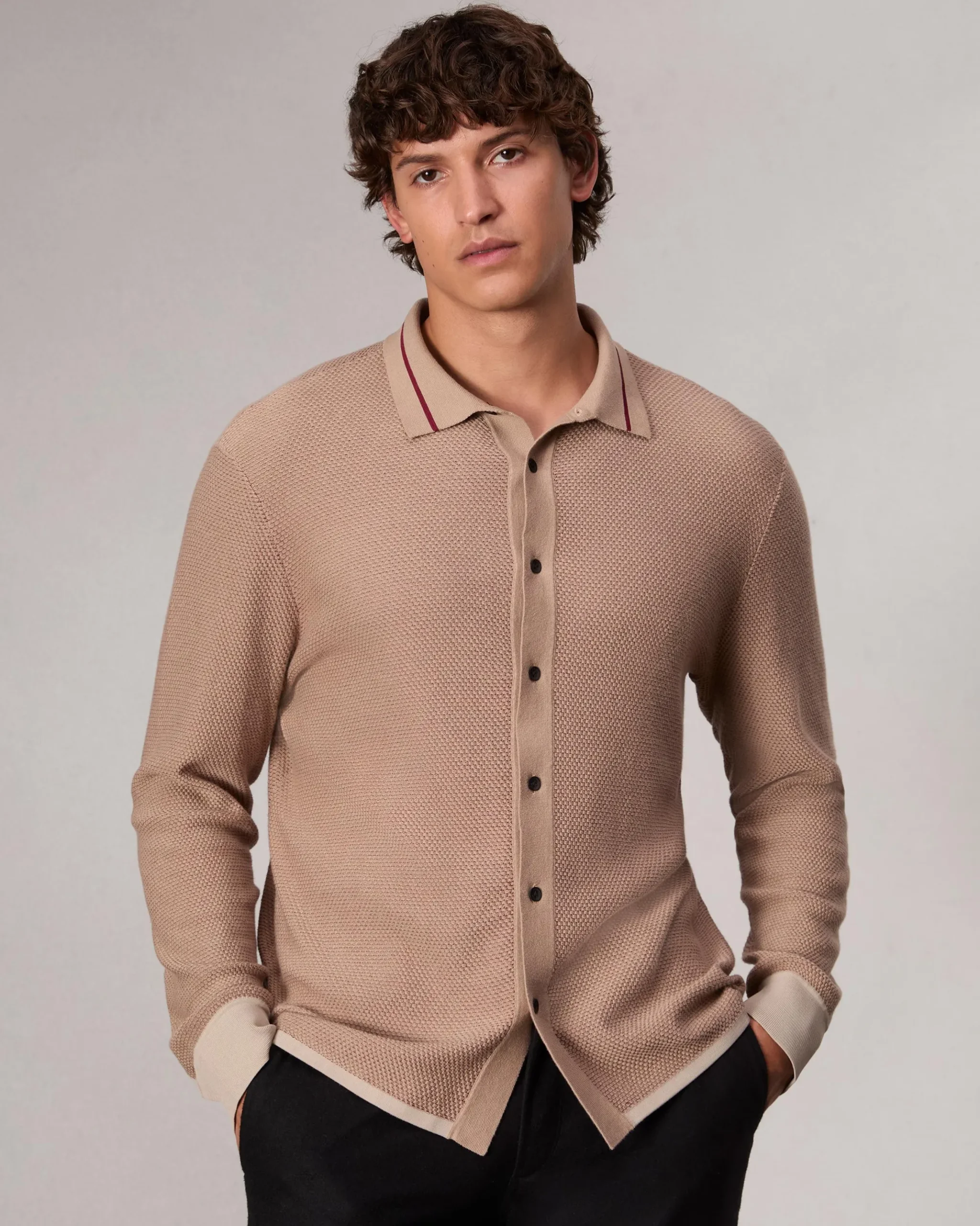 The comfort of a sweater meets the sophistication of shirting. Knit from a lightweight cotton blend with a vintage-inspired texture, this long-sleeve shirt is tailored with a striped point collar and a classic fit. Wear it buttoned-up or undone over a T-shirt.